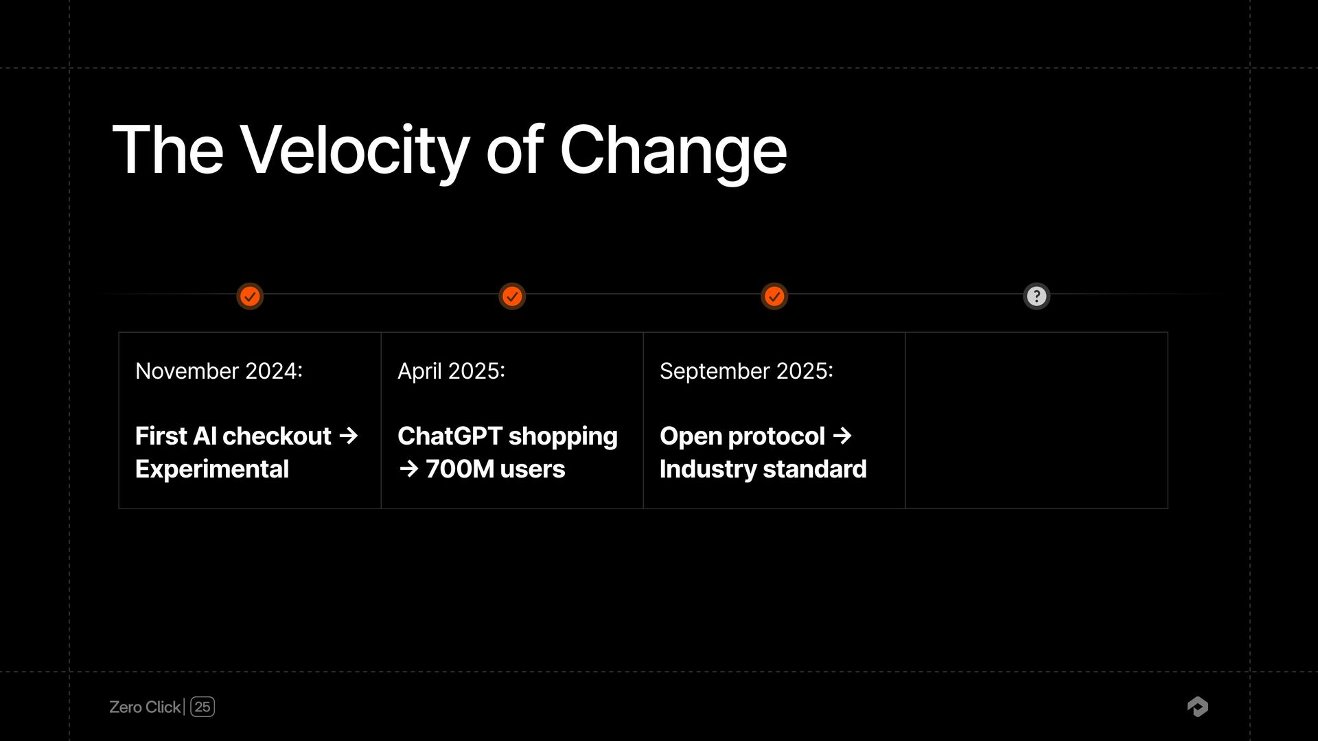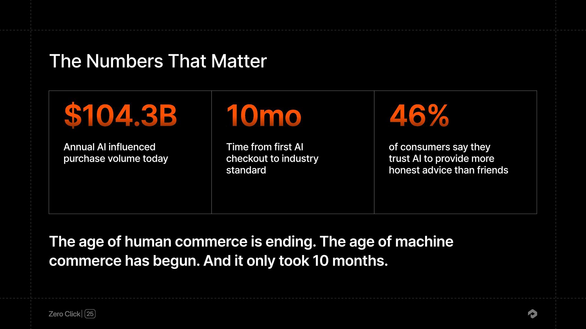 today 10mo Time from first AI checkout to industry standard 46% of consumers say they trust AI to provide more honest advice than friends The age of human commerce is ending. The age of machine commerce has begun. And it only took 10 months.