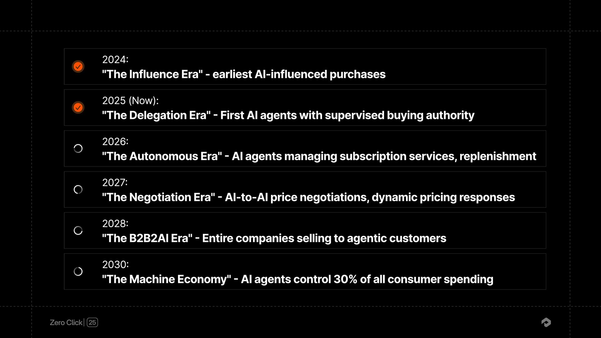 "The Delegation Era" - First AI agents with supervised buying authority 2026: "The Autonomous Era" - AI agents managing subscription services, replenishment 2027: "The Negotiation Era" - AI-to-AI price negotiations, dynamic pricing responses 2028: "The B2B2AI Era" - Entire companies selling to agentic customers 2030: "The Machine Economy" - AI agents control 30% of all consumer spending