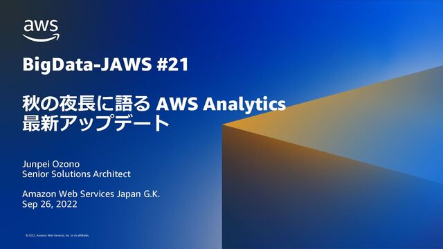 2022, Amazon Web Services, Inc. or its affiliates. BigData-JAWS #21 秋の夜⻑に語る AWS Analytics 最新アップデート Junpei Ozono Senior Solutions Architect Amazon Web Services Japan G.K. Sep 26, 2022