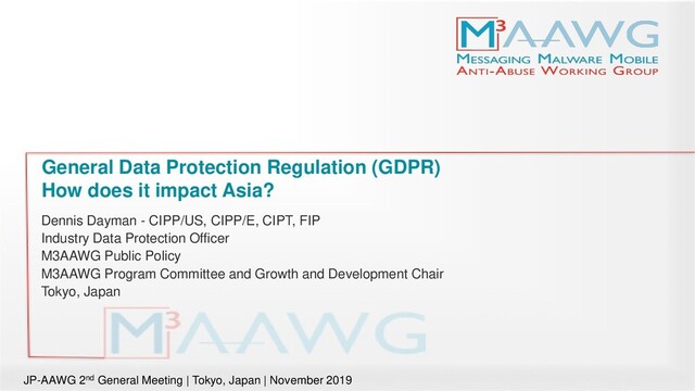 purposes only. Nothing in this presentation shall be construed as creating a representation, legal advice, warranty or commitment, contractual or otherwise, by M3AAWG or myself, and others or any affiliates to you or any other person or entity. • It also does not guarantee that your email and/or any other aspect of your business is in compliance with state, federal, or International laws. • M3AAWG, and others makes no representation, warranty or commitment that any message you send to end users will be delivered or that your programs have the proper privacy processes. • This presentation is not a substitute for, should not be used in place of, and should not be considered, legal advice. It is recommended that you contact your general or legal counsel. JP-AAWG 2nd General Meeting | Tokyo, Japan | November 2019