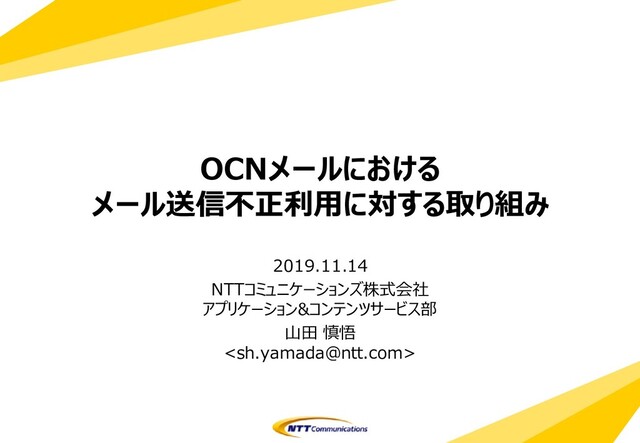 1. 自己紹介 名前 山田 慎悟 所属 NTTコミュニケーションズ株式会社 迷惑メール対策推進協議会 技術WG 略歴 ・