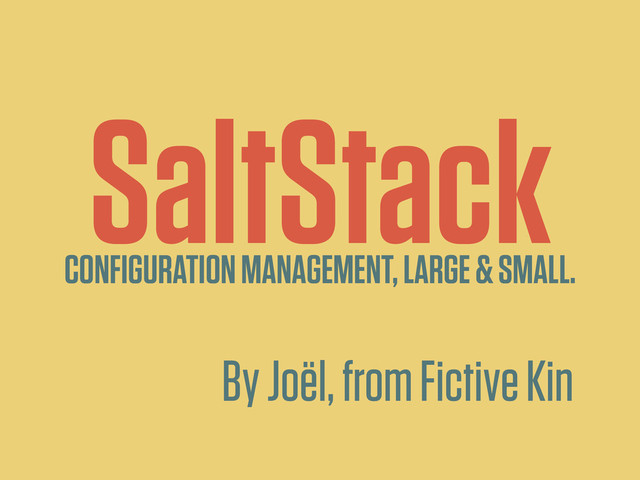 Salt, a relatively new player in the configuration management space, offers quite an impressive amount of features for startups and agencies, both big and small. We'll look at how Salt's explicit separation of state and data, it's parallel execution model, ease of extensibility and remote data querying capabilities make it a first class candidate for ensuring your servers and development environments are in a known and reproducible state.