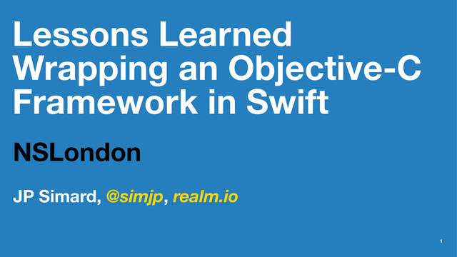 Wherein we discuss the trials and tribulations endured while wrapping Realm's Objective-C interface in a Swift framework. You'll learn how to craft the perfect Swift interface without duplicating core functionality, as well as tricks to work around tooling limitations. Why let Objective-C die in sadness when we can just hide it in a shiny new Swift suit?