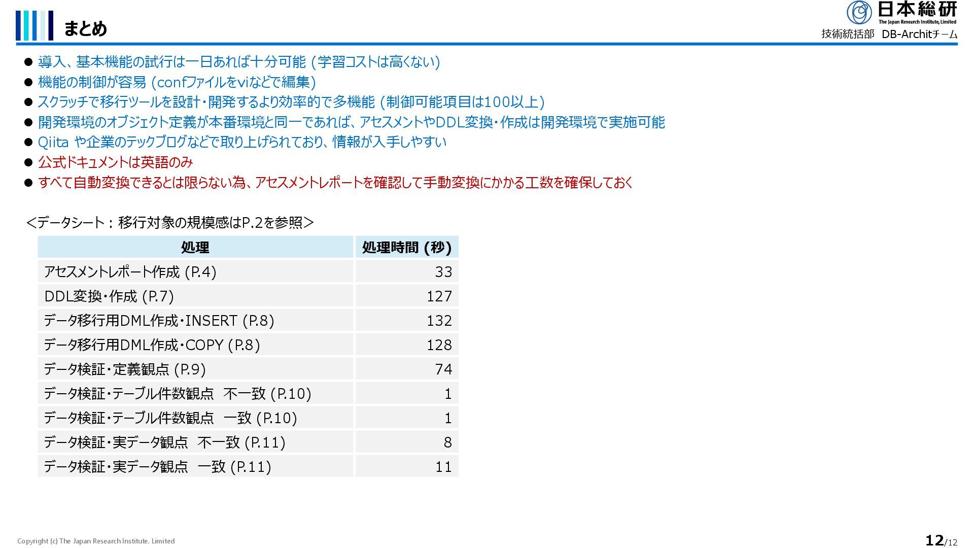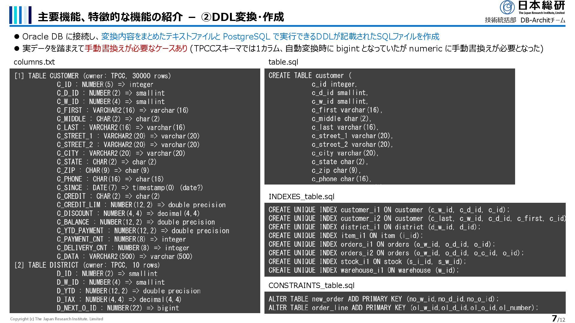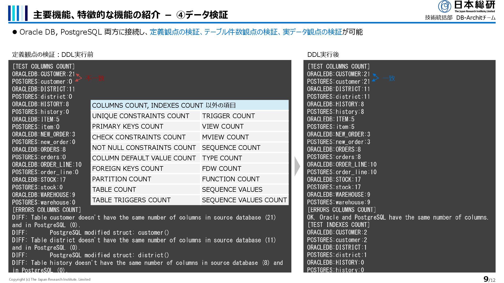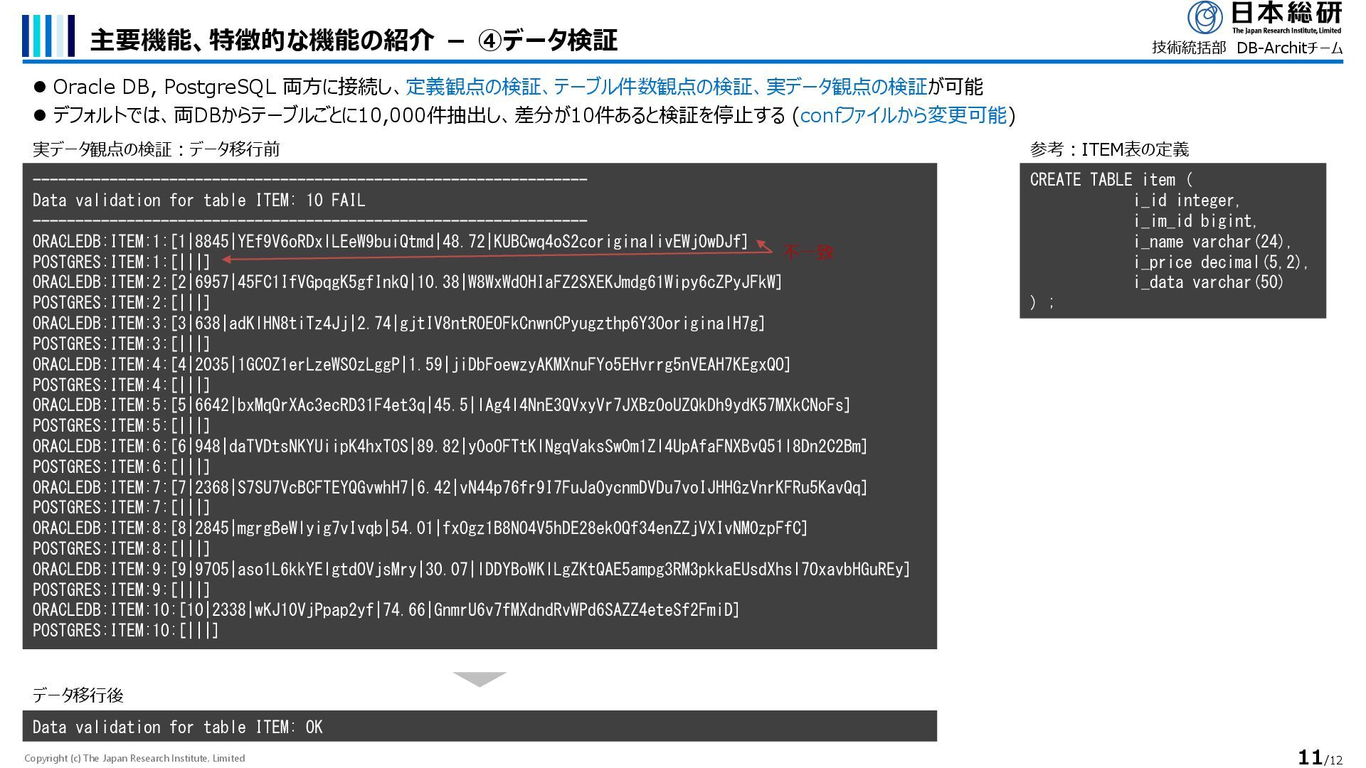 ④データ検証 技術統括部 DB-Architチーム ⚫ Oracle DB, PostgreSQL 両方に接続し、定義観点の検証、テーブル件数観点の検証、実データ観点の検証が可能 ⚫ デフォルトでは、両DBからテーブルごとに10,000件抽出し、差分が10件あると検証を停止する (confファイルから変更可能) 実データ観点の検証:データ移行前 ----------------------------------------------------------------- Data validation for table ITEM: 10 FAIL ----------------------------------------------------------------- ORACLEDB:ITEM:1:[1|8845|YEf9V6oRDxlLEeW9buiQtmd|48.72|KUBCwq4oS2coriginalivEWj0wDJf] POSTGRES:ITEM:1:[|||] ORACLEDB:ITEM:2:[2|6957|45FC1IfVGpqgK5gfInkQ|10.38|W8WxWdOHIaFZ2SXEKJmdg61Wipy6cZPyJFkW] POSTGRES:ITEM:2:[|||] ORACLEDB:ITEM:3:[3|638|adKlHN8tiTz4Jj|2.74|gjtIV8ntROEOFkCnwnCPyugzthp6Y3OoriginalH7g] POSTGRES:ITEM:3:[|||] ORACLEDB:ITEM:4:[4|2035|1GCOZ1erLzeWS0zLggP|1.59|jiDbFoewzyAKMXnuFYo5EHvrrg5nVEAH7KEgxQO] POSTGRES:ITEM:4:[|||] ORACLEDB:ITEM:5:[5|6642|bxMqQrXAc3ecRD31F4et3q|45.5|lAg4l4NnE3QVxyVr7JXBzOoUZQkDh9ydK57MXkCNoFs] POSTGRES:ITEM:5:[|||] ORACLEDB:ITEM:6:[6|948|daTVDtsNKYUiipK4hxTOS|89.82|y0oOFTtKlNgqVaksSw0m1Zl4UpAfaFNXBvQ51l8Dn2C2Bm] POSTGRES:ITEM:6:[|||] ORACLEDB:ITEM:7:[7|2368|S7SU7VcBCFTEYQGvwhH7|6.42|vN44p76fr9I7FuJa0ycnmDVDu7voIJHHGzVnrKFRu5KavQq] POSTGRES:ITEM:7:[|||] ORACLEDB:ITEM:8:[8|2845|mgrgBeWlyig7vIvqb|54.01|fxOgz1B8NO4V5hDE28ek0Qf34enZZjVXIvNM0zpFfC] POSTGRES:ITEM:8:[|||] ORACLEDB:ITEM:9:[9|9705|aso1L6kkYElgtdOVjsMry|30.07|lDDYBoWKlLgZKtQAE5ampg3RM3pkkaEUsdXhsl7OxavbHGuREy] POSTGRES:ITEM:9:[|||] ORACLEDB:ITEM:10:[10|2338|wKJ10VjPpap2yf|74.66|GnmrU6v7fMXdndRvWPd6SAZZ4eteSf2FmiD] POSTGRES:ITEM:10:[|||] データ移行後 Data validation for table ITEM: OK CREATE TABLE item ( i_id integer, i_im_id bigint, i_name varchar(24), i_price decimal(5,2), i_data varchar(50) ) ; 参考:ITEM表の定義 不一致