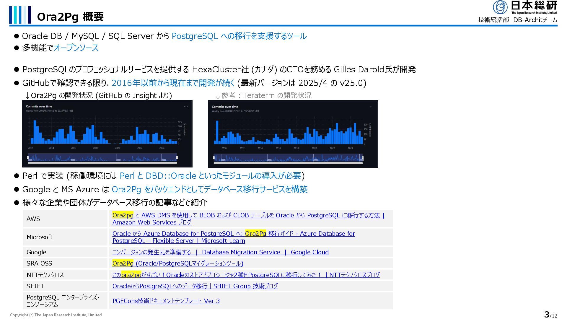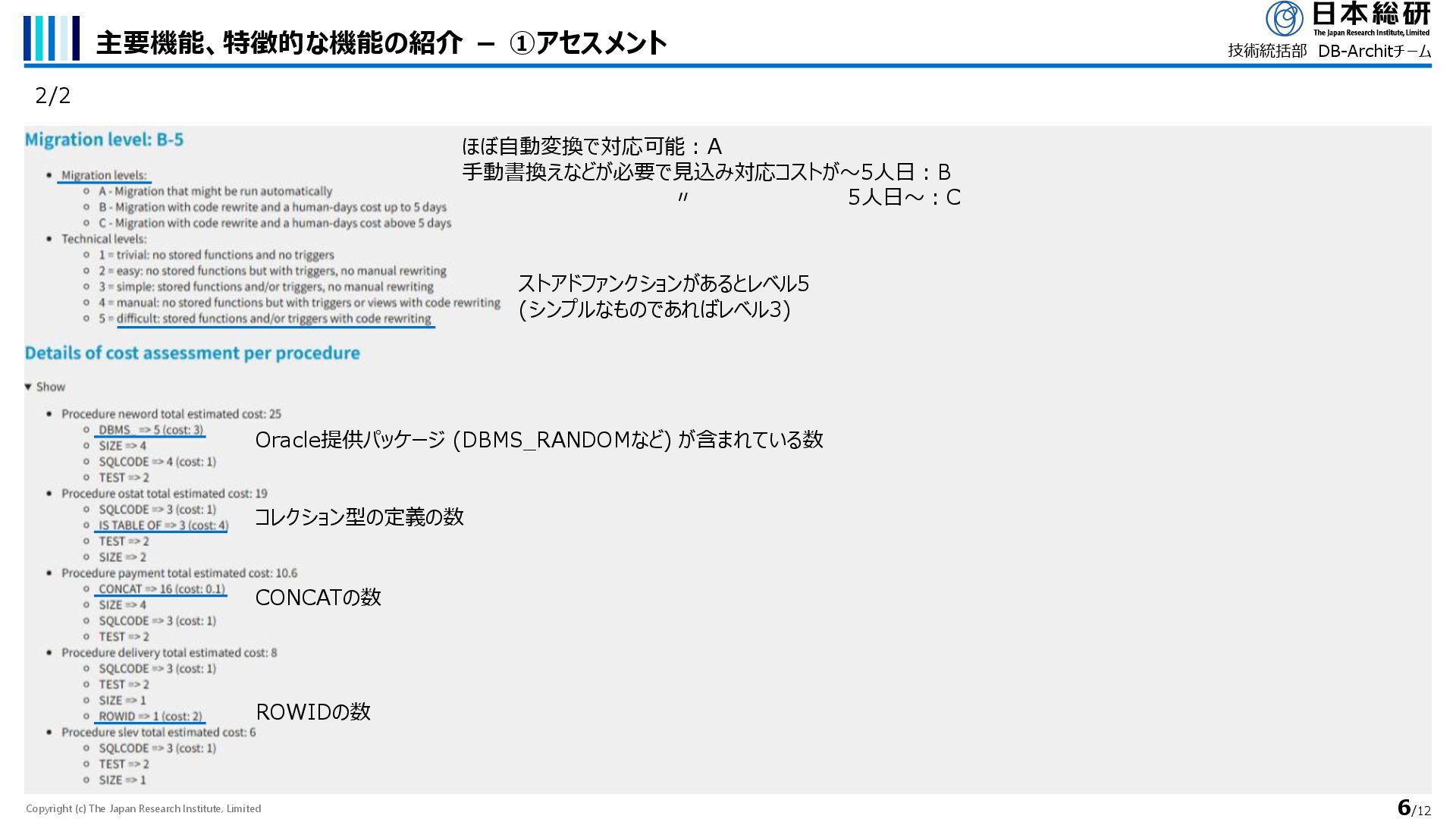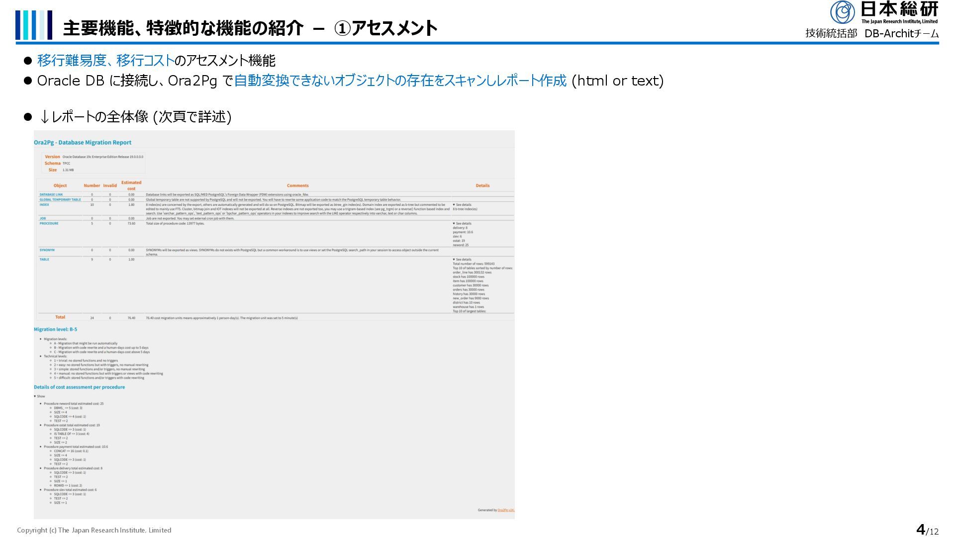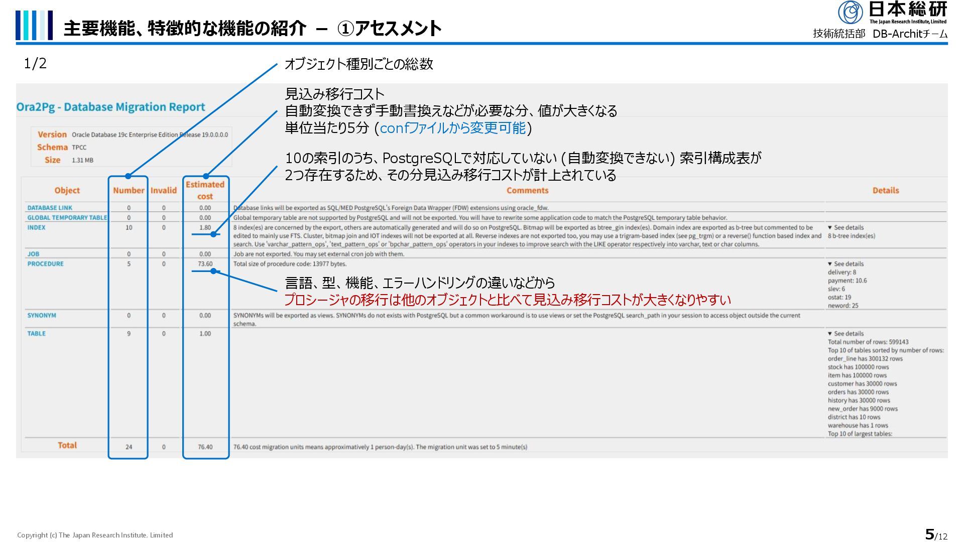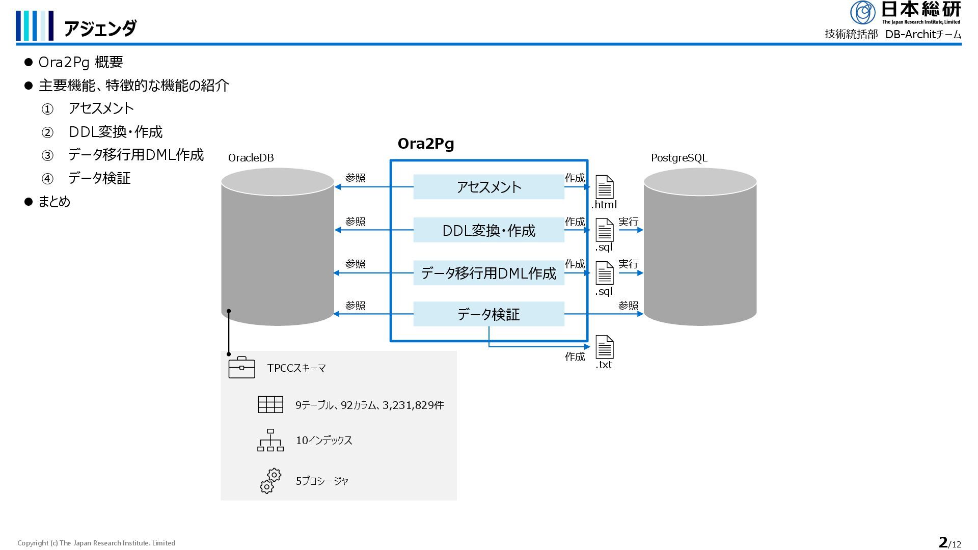 ④データ検証 技術統括部 DB-Architチーム ⚫ Oracle DB, PostgreSQL 両方に接続し、定義観点の検証、テーブル件数観点の検証、実データ観点の検証が可能 ⚫ デフォルトでは、両DBからテーブルごとに10,000件抽出し、差分が10件あると検証を停止する (confファイルから変更可能) 実データ観点の検証:データ移行前 ----------------------------------------------------------------- Data validation for table ITEM: 10 FAIL ----------------------------------------------------------------- ORACLEDB:ITEM:1:[1|8845|YEf9V6oRDxlLEeW9buiQtmd|48.72|KUBCwq4oS2coriginalivEWj0wDJf] POSTGRES:ITEM:1:[|||] ORACLEDB:ITEM:2:[2|6957|45FC1IfVGpqgK5gfInkQ|10.38|W8WxWdOHIaFZ2SXEKJmdg61Wipy6cZPyJFkW] POSTGRES:ITEM:2:[|||] ORACLEDB:ITEM:3:[3|638|adKlHN8tiTz4Jj|2.74|gjtIV8ntROEOFkCnwnCPyugzthp6Y3OoriginalH7g] POSTGRES:ITEM:3:[|||] ORACLEDB:ITEM:4:[4|2035|1GCOZ1erLzeWS0zLggP|1.59|jiDbFoewzyAKMXnuFYo5EHvrrg5nVEAH7KEgxQO] POSTGRES:ITEM:4:[|||] ORACLEDB:ITEM:5:[5|6642|bxMqQrXAc3ecRD31F4et3q|45.5|lAg4l4NnE3QVxyVr7JXBzOoUZQkDh9ydK57MXkCNoFs] POSTGRES:ITEM:5:[|||] ORACLEDB:ITEM:6:[6|948|daTVDtsNKYUiipK4hxTOS|89.82|y0oOFTtKlNgqVaksSw0m1Zl4UpAfaFNXBvQ51l8Dn2C2Bm] POSTGRES:ITEM:6:[|||] ORACLEDB:ITEM:7:[7|2368|S7SU7VcBCFTEYQGvwhH7|6.42|vN44p76fr9I7FuJa0ycnmDVDu7voIJHHGzVnrKFRu5KavQq] POSTGRES:ITEM:7:[|||] ORACLEDB:ITEM:8:[8|2845|mgrgBeWlyig7vIvqb|54.01|fxOgz1B8NO4V5hDE28ek0Qf34enZZjVXIvNM0zpFfC] POSTGRES:ITEM:8:[|||] ORACLEDB:ITEM:9:[9|9705|aso1L6kkYElgtdOVjsMry|30.07|lDDYBoWKlLgZKtQAE5ampg3RM3pkkaEUsdXhsl7OxavbHGuREy] POSTGRES:ITEM:9:[|||] ORACLEDB:ITEM:10:[10|2338|wKJ10VjPpap2yf|74.66|GnmrU6v7fMXdndRvWPd6SAZZ4eteSf2FmiD] POSTGRES:ITEM:10:[|||] データ移行後 Data validation for table ITEM: OK CREATE TABLE item ( i_id integer, i_im_id bigint, i_name varchar(24), i_price decimal(5,2), i_data varchar(50) ) ; 参考:ITEM表の定義 不一致