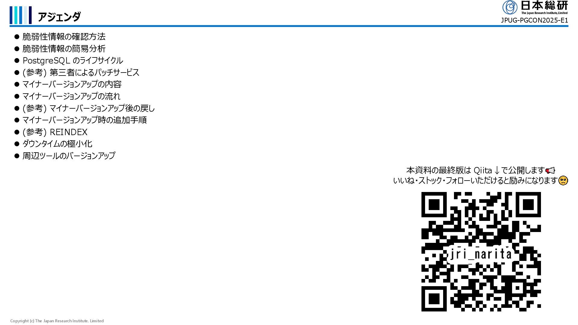 ⚫ 脆弱性情報の簡易分析 ⚫ PostgreSQL のライフサイクル ⚫ (参考) 第三者によるパッチサービス ⚫ マイナーバージョンアップの内容 ⚫ マイナーバージョンアップの流れ ⚫ (参考) マイナーバージョンアップ後の戻し ⚫ マイナーバージョンアップ時の追加手順 ⚫ (参考) REINDEX ⚫ ダウンタイムの極小化 ⚫ 周辺ツールのバージョンアップ JPUG-PGCON2025-E1 本資料の最終版は Qiita↓で公開します いいね・ストック・フォローいただけると励みになります