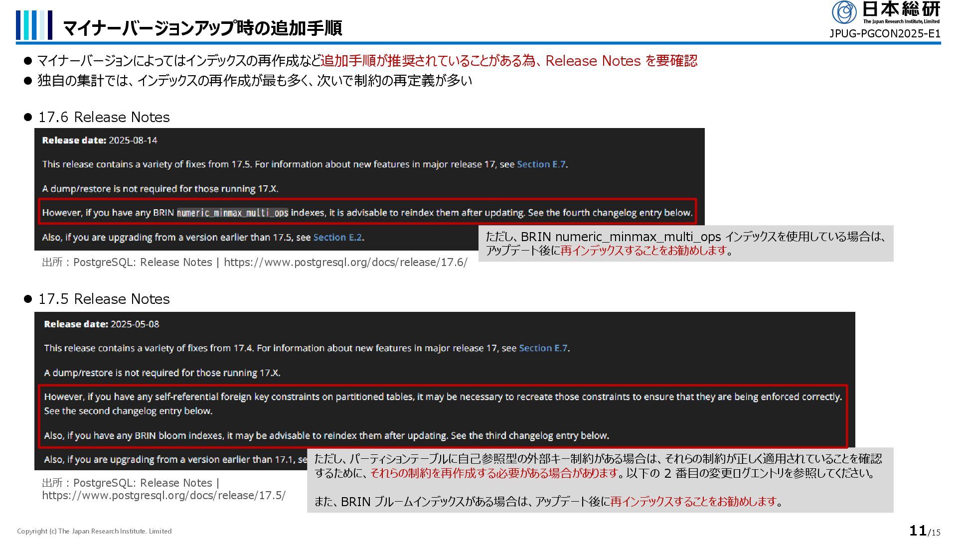 マイナーバージョンによってはインデックスの再作成など追加手順が推奨されていることがある為、Release Notes を要確認 ⚫ 独自の集計では、インデックスの再作成が最も多く、次いで制約の再定義が多い JPUG-PGCON2025-E1 ⚫ 17.6 Release Notes ⚫ 17.5 Release Notes 出所:PostgreSQL: Release Notes | https://www.postgresql.org/docs/release/17.6/ 出所:PostgreSQL: Release Notes | https://www.postgresql.org/docs/release/17.5/ ただし、パーティションテーブルに自己参照型の外部キー制約がある場合は、それらの制約が正しく適用されていることを確認 するために、それらの制約を再作成する必要がある場合があります。以下の 2 番目の変更ログエントリを参照してください。 また、BRIN ブルームインデックスがある場合は、アップデート後に再インデックスすることをお勧めします。 ただし、BRIN numeric_minmax_multi_ops インデックスを使用している場合は、 アップデート後に再インデックスすることをお勧めします。