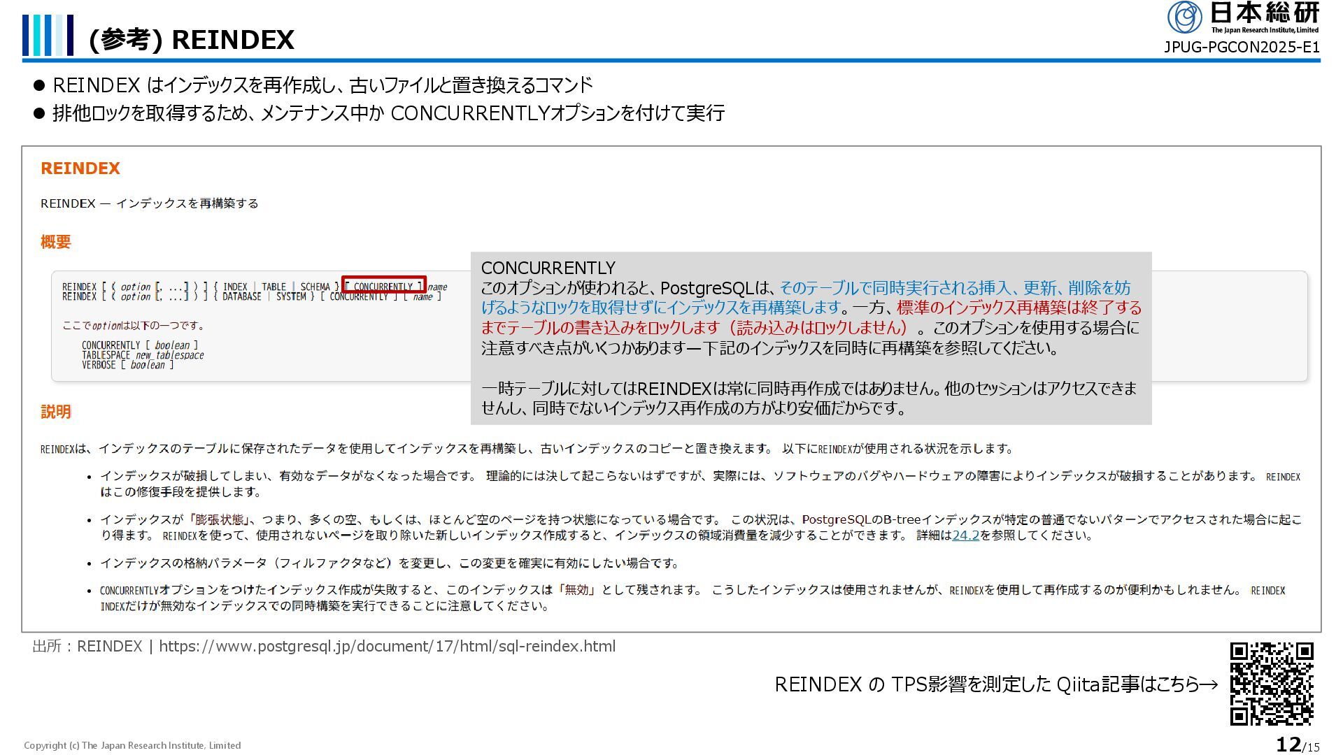 ⚫ REINDEX はインデックスを再作成し、古いファイルと置き換えるコマンド ⚫ 排他ロックを取得するため、メンテナンス中か CONCURRENTLYオプションを付けて実行 JPUG-PGCON2025-E1 出所:REINDEX | https://www.postgresql.jp/document/17/html/sql-reindex.html CONCURRENTLY このオプションが使われると、PostgreSQLは、そのテーブルで同時実行される挿入、更新、削除を妨 げるようなロックを取得せずにインデックスを再構築します。一方、標準のインデックス再構築は終了する までテーブルの書き込みをロックします(読み込みはロックしません)。 このオプションを使用する場合に 注意すべき点がいくつかあります—下記のインデックスを同時に再構築を参照してください。 一時テーブルに対してはREINDEXは常に同時再作成ではありません。他のセッションはアクセスできま せんし、同時でないインデックス再作成の方がより安価だからです。 REINDEX の TPS影響を測定した Qiita記事はこちら→