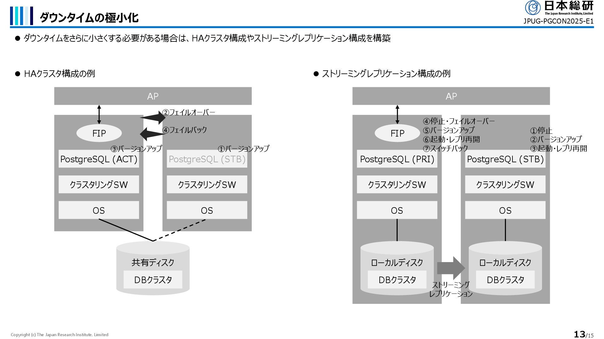 ダウンタイムの極小化 ⚫ ダウンタイムをさらに小さくする必要がある場合は、HAクラスタ構成やストリーミングレプリケーション構成を構築 JPUG-PGCON2025-E1 ⚫ HAクラスタ構成の例 AP 共有ディスク DBクラスタ PostgreSQL (ACT) クラスタリングSW OS PostgreSQL (STB) クラスタリングSW OS FIP AP ローカルディスク DBクラスタ PostgreSQL (PRI) クラスタリングSW OS PostgreSQL (STB) クラスタリングSW OS FIP ローカルディスク DBクラスタ ストリーミング レプリケーション ①バージョンアップ ③バージョンアップ ④フェイルバック ①停止 ②バージョンアップ ③起動・レプリ再開 ④停止・フェイルオーバー ⑤バージョンアップ ⑥起動・レプリ再開 ⑦スイッチバック ②フェイルオーバー