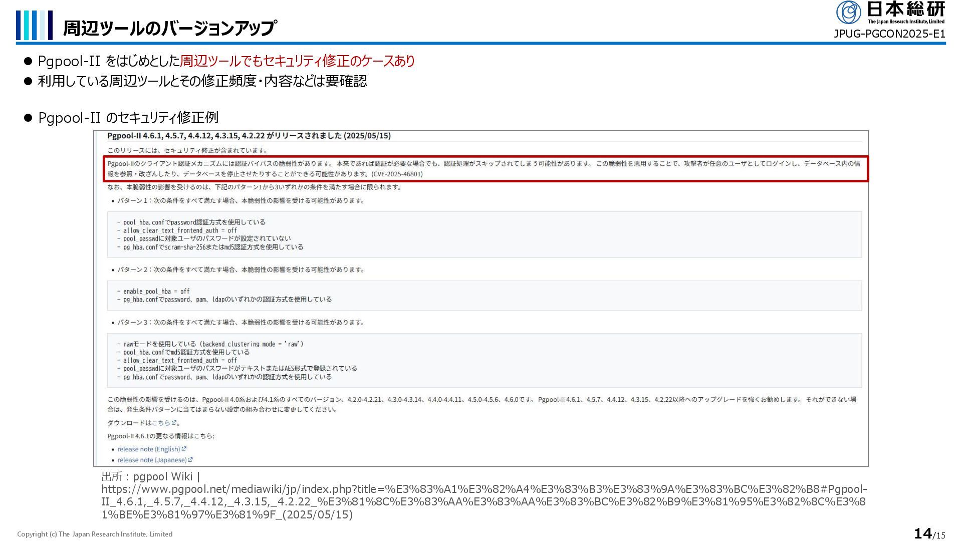Pgpool-II をはじめとした周辺ツールでもセキュリティ修正のケースあり ⚫ 利用している周辺ツールとその修正頻度・内容などは要確認 JPUG-PGCON2025-E1 ⚫ Pgpool-II のセキュリティ修正例 出所:pgpool Wiki | https://www.pgpool.net/mediawiki/jp/index.php?title=%E3%83%A1%E3%82%A4%E3%83%B3%E3%83%9A%E3%83%BC%E3%82%B8#Pgpool- II_4.6.1,_4.5.7,_4.4.12,_4.3.15,_4.2.22_%E3%81%8C%E3%83%AA%E3%83%AA%E3%83%BC%E3%82%B9%E3%81%95%E3%82%8C%E3%8 1%BE%E3%81%97%E3%81%9F_(2025/05/15)