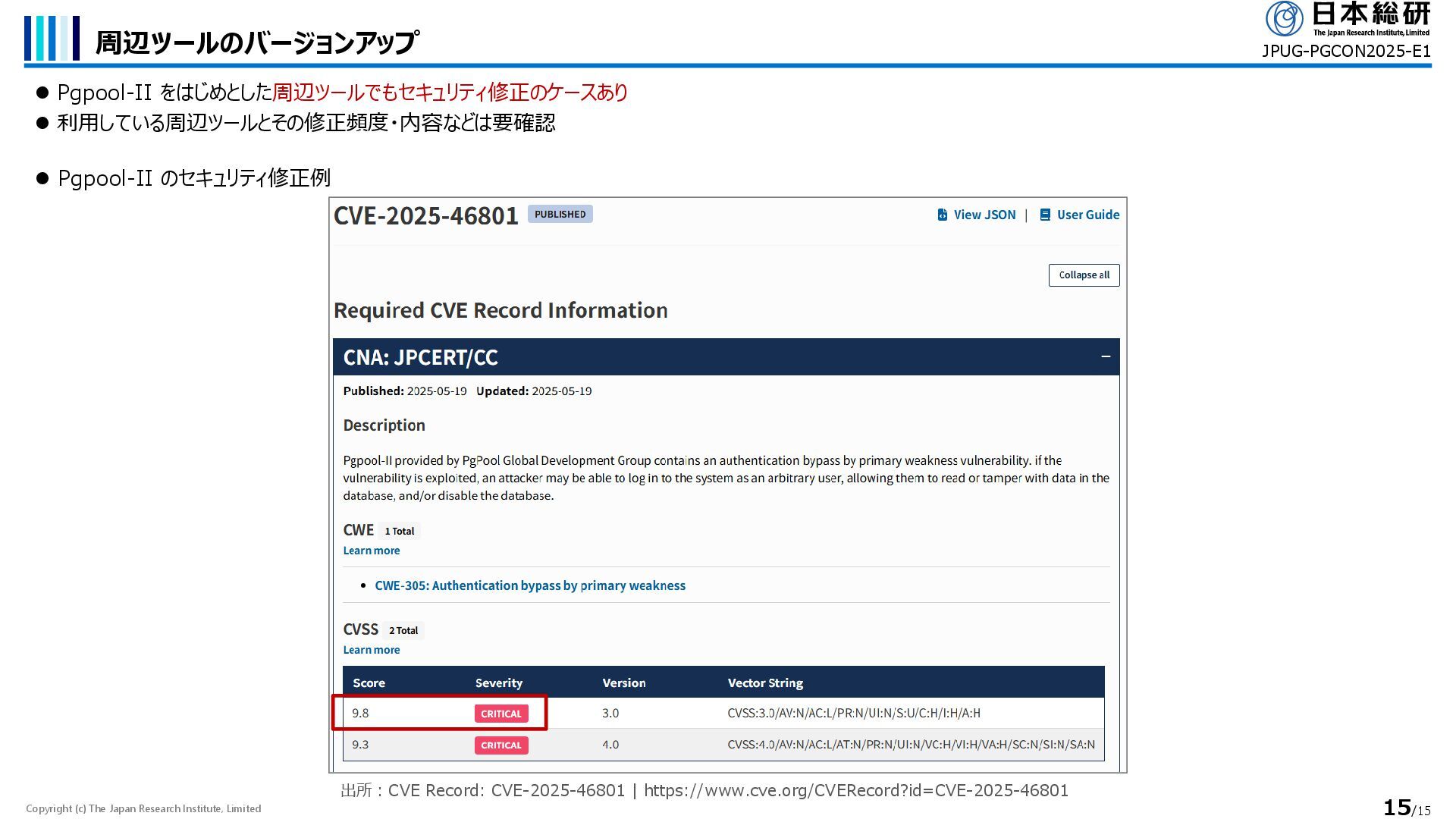 Pgpool-II をはじめとした周辺ツールでもセキュリティ修正のケースあり ⚫ 利用している周辺ツールとその修正頻度・内容などは要確認 JPUG-PGCON2025-E1 ⚫ Pgpool-II のセキュリティ修正例 出所:CVE Record: CVE-2025-46801 | https://www.cve.org/CVERecord?id=CVE-2025-46801