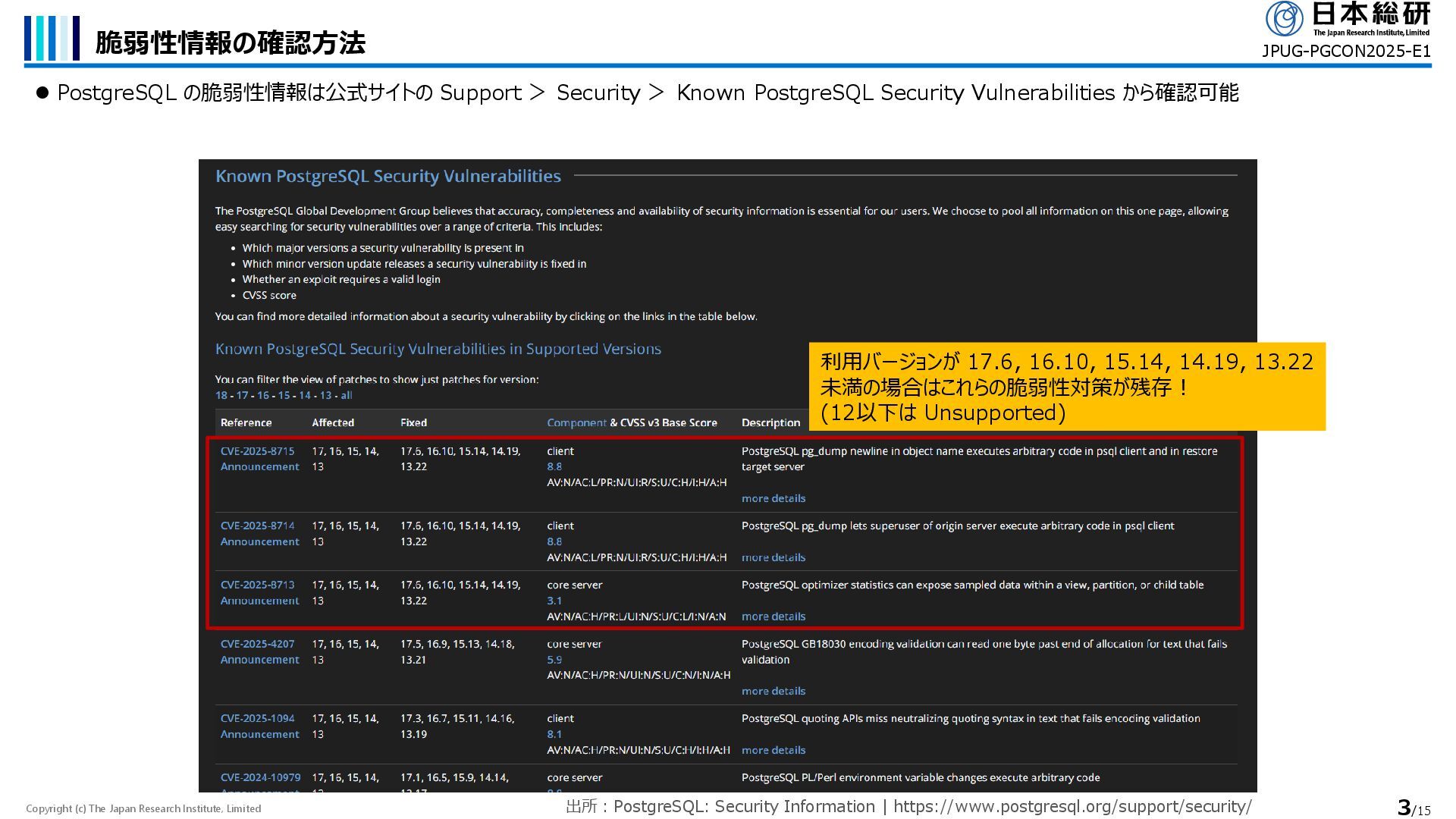 PostgreSQL の脆弱性情報は公式サイトの Support > Security > Known PostgreSQL Security Vulnerabilities から確認可能 JPUG-PGCON2025-E1 利用バージョンが 17.6, 16.10, 15.14, 14.19, 13.22 未満の場合はこれらの脆弱性対策が残存! (12以下は Unsupported) 出所:PostgreSQL: Security Information | https://www.postgresql.org/support/security/