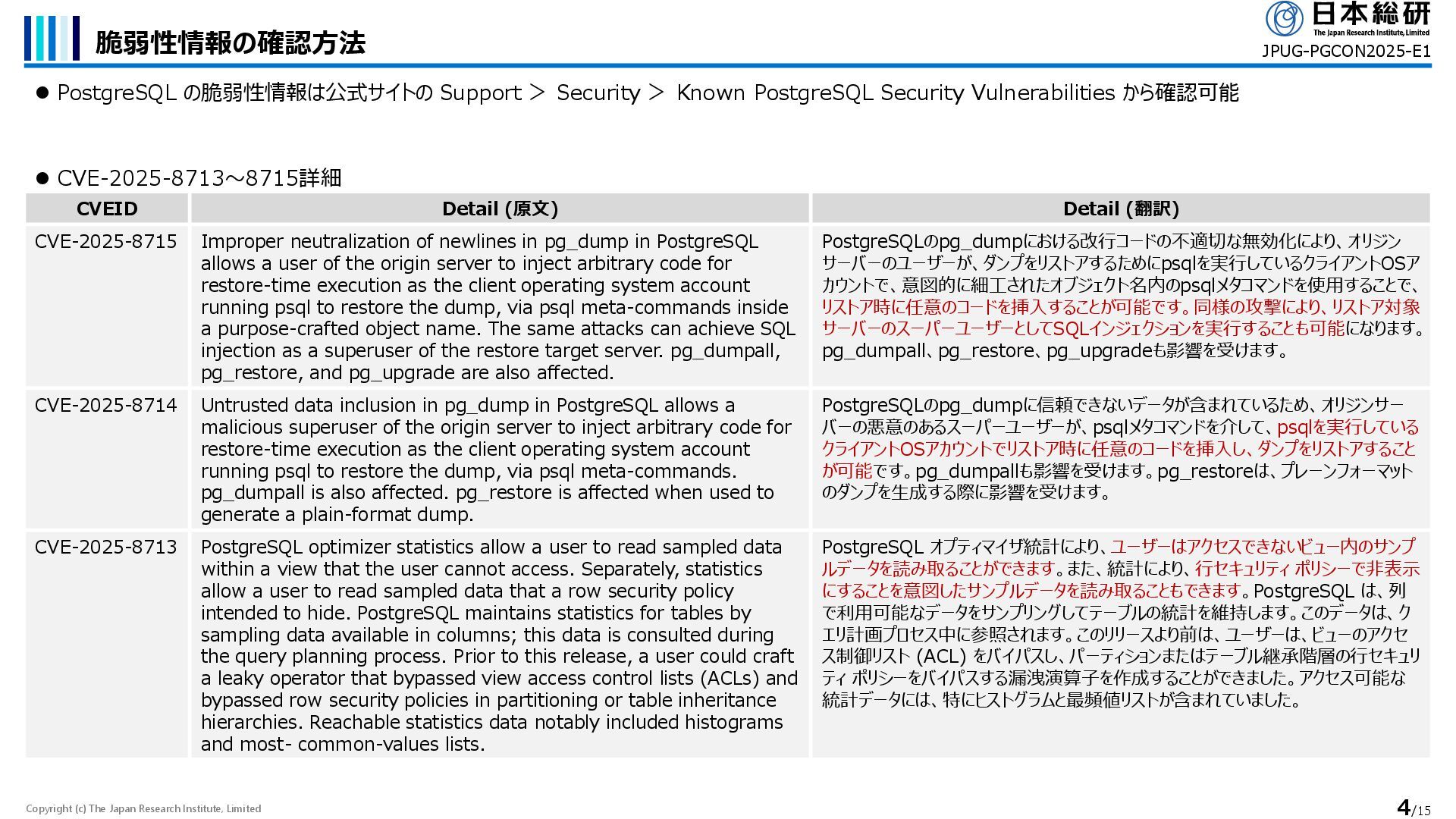 PostgreSQL の脆弱性情報は公式サイトの Support > Security > Known PostgreSQL Security Vulnerabilities から確認可能 JPUG-PGCON2025-E1 ⚫ CVE-2025-8713~8715詳細 CVEID Detail (原文) Detail (翻訳) CVE-2025-8715 Improper neutralization of newlines in pg_dump in PostgreSQL allows a user of the origin server to inject arbitrary code for restore-time execution as the client operating system account running psql to restore the dump, via psql meta-commands inside a purpose-crafted object name. The same attacks can achieve SQL injection as a superuser of the restore target server. pg_dumpall, pg_restore, and pg_upgrade are also affected. PostgreSQLのpg_dumpにおける改行コードの不適切な無効化により、オリジン サーバーのユーザーが、ダンプをリストアするためにpsqlを実行しているクライアントOSア カウントで、意図的に細工されたオブジェクト名内のpsqlメタコマンドを使用することで、 リストア時に任意のコードを挿入することが可能です。同様の攻撃により、リストア対象 サーバーのスーパーユーザーとしてSQLインジェクションを実行することも可能になります。 pg_dumpall、pg_restore、pg_upgradeも影響を受けます。 CVE-2025-8714 Untrusted data inclusion in pg_dump in PostgreSQL allows a malicious superuser of the origin server to inject arbitrary code for restore-time execution as the client operating system account running psql to restore the dump, via psql meta-commands. pg_dumpall is also affected. pg_restore is affected when used to generate a plain-format dump. PostgreSQLのpg_dumpに信頼できないデータが含まれているため、オリジンサー バーの悪意のあるスーパーユーザーが、psqlメタコマンドを介して、psqlを実行している クライアントOSアカウントでリストア時に任意のコードを挿入し、ダンプをリストアすること が可能です。pg_dumpallも影響を受けます。pg_restoreは、プレーンフォーマット のダンプを生成する際に影響を受けます。 CVE-2025-8713 PostgreSQL optimizer statistics allow a user to read sampled data within a view that the user cannot access. Separately, statistics allow a user to read sampled data that a row security policy intended to hide. PostgreSQL maintains statistics for tables by sampling data available in columns; this data is consulted during the query planning process. Prior to this release, a user could craft a leaky operator that bypassed view access control lists (ACLs) and bypassed row security policies in partitioning or table inheritance hierarchies. Reachable statistics data notably included histograms and most- common-values lists. PostgreSQL オプティマイザ統計により、ユーザーはアクセスできないビュー内のサンプ ルデータを読み取ることができます。また、統計により、行セキュリティ ポリシーで非表示 にすることを意図したサンプルデータを読み取ることもできます。PostgreSQL は、列 で利用可能なデータをサンプリングしてテーブルの統計を維持します。このデータは、ク エリ計画プロセス中に参照されます。このリリースより前は、ユーザーは、ビューのアクセ ス制御リスト (ACL) をバイパスし、パーティションまたはテーブル継承階層の行セキュリ ティ ポリシーをバイパスする漏洩演算子を作成することができました。アクセス可能な 統計データには、特にヒストグラムと最頻値リストが含まれていました。
