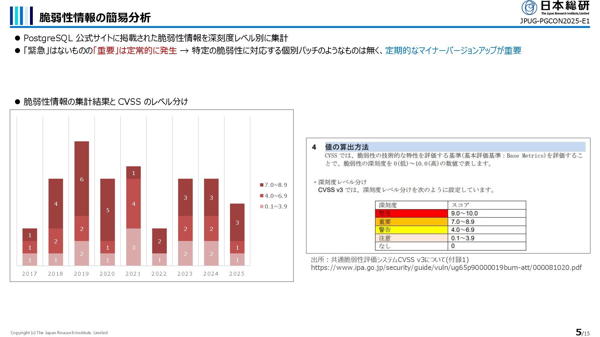 PostgreSQL 公式サイトに掲載された脆弱性情報を深刻度レベル別に集計 ⚫ 「緊急」はないものの「重要」は定常的に発生 → 特定の脆弱性に対応する個別パッチのようなものは無く、定期的なマイナーバージョンアップが重要 JPUG-PGCON2025-E1 1 1 2 1 3 1 2 2 1 1 2 2 1 4 2 2 1 1 4 6 5 1 2 3 3 3 2 0 1 7 2 0 1 8 2 0 1 9 2 0 2 0 2 0 2 1 2 0 2 2 2 0 2 3 2 0 2 4 2 0 2 5 7.0~8.9 4.0~6.9 0.1~3.9 出所:共通脆弱性評価システムCVSS v3について(付録1) https://www.ipa.go.jp/security/guide/vuln/ug65p90000019bum-att/000081020.pdf ⚫ 脆弱性情報の集計結果と CVSS のレベル分け