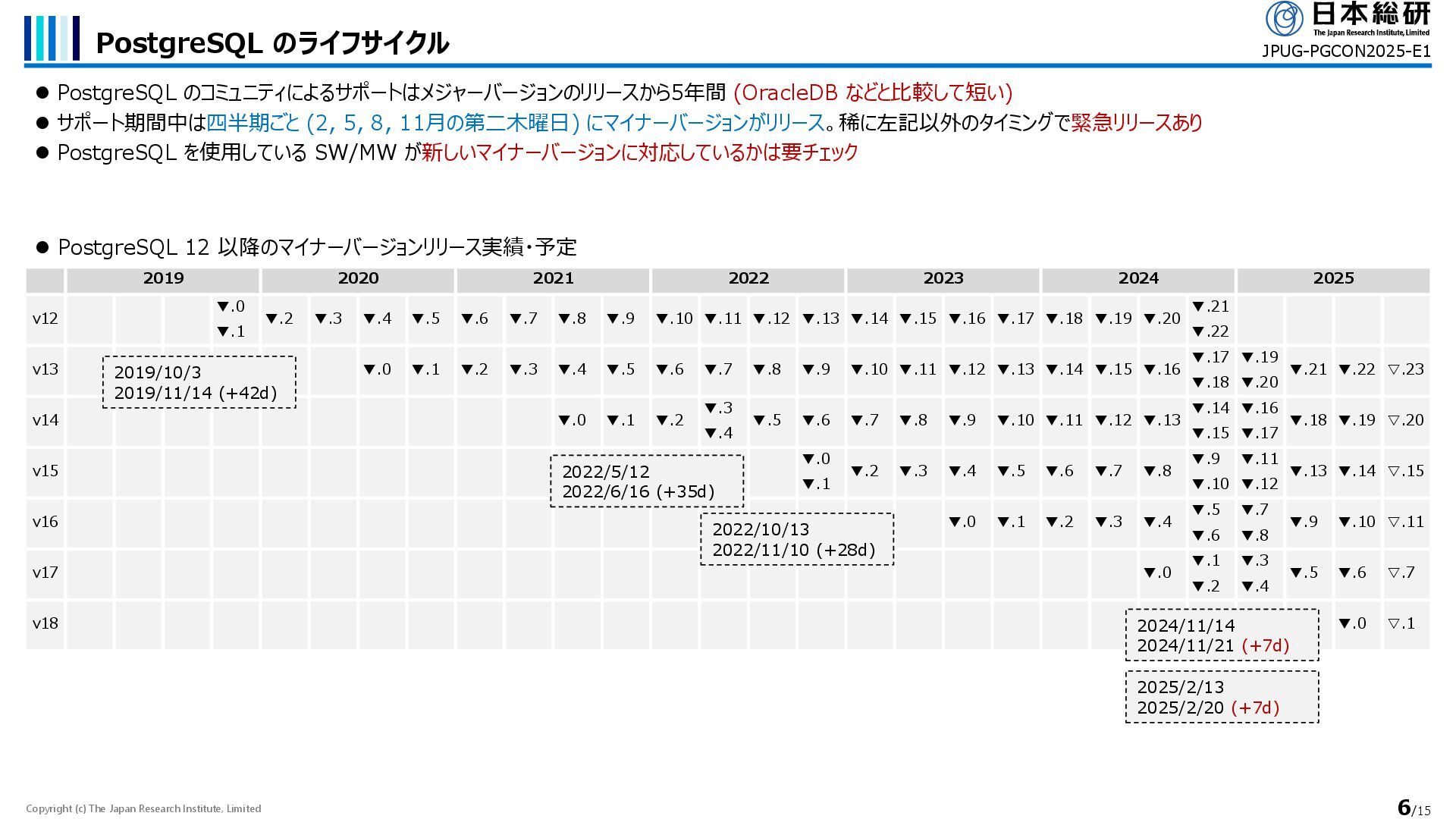 ▼.1 ▼.2 ▼.3 ▼.4 ▼.5 ▼.6 ▼.7 ▼.8 ▼.9 ▼.10 ▼.11 ▼.12 ▼.13 ▼.14 ▼.15 ▼.16 ▼.17 ▼.18 ▼.19 ▼.20 ▼.21 ▼.22 v13 ▼.0 ▼.1 ▼.2 ▼.3 ▼.4 ▼.5 ▼.6 ▼.7 ▼.8 ▼.9 ▼.10 ▼.11 ▼.12 ▼.13 ▼.14 ▼.15 ▼.16 ▼.17 ▼.18 ▼.19 ▼.20 ▼.21 ▼.22 ▽.23 v14 ▼.0 ▼.1 ▼.2 ▼.3 ▼.4 ▼.5 ▼.6 ▼.7 ▼.8 ▼.9 ▼.10 ▼.11 ▼.12 ▼.13 ▼.14 ▼.15 ▼.16 ▼.17 ▼.18 ▼.19 ▽.20 v15 ▼.0 ▼.1 ▼.2 ▼.3 ▼.4 ▼.5 ▼.6 ▼.7 ▼.8 ▼.9 ▼.10 ▼.11 ▼.12 ▼.13 ▼.14 ▽.15 v16 ▼.0 ▼.1 ▼.2 ▼.3 ▼.4 ▼.5 ▼.6 ▼.7 ▼.8 ▼.9 ▼.10 ▽.11 v17 ▼.0 ▼.1 ▼.2 ▼.3 ▼.4 ▼.5 ▼.6 ▽.7 v18 ▼.0 ▽.1 2025 2019 2020 2021 2022 2023 2024 PostgreSQL のライフサイクル ⚫ PostgreSQL のコミュニティによるサポートはメジャーバージョンのリリースから5年間 (OracleDB などと比較して短い) ⚫ サポート期間中は四半期ごと (2, 5, 8, 11月の第二木曜日) にマイナーバージョンがリリース。稀に左記以外のタイミングで緊急リリースあり ⚫ PostgreSQL を使用している SW/MW が新しいマイナーバージョンに対応しているかは要チェック ⚫ PostgreSQL 12 以降のマイナーバージョンリリース実績・予定 JPUG-PGCON2025-E1 2019/10/3 2019/11/14 (+42d) 2022/5/12 2022/6/16 (+35d) 2022/10/13 2022/11/10 (+28d) 2024/11/14 2024/11/21 (+7d) 2025/2/13 2025/2/20 (+7d)