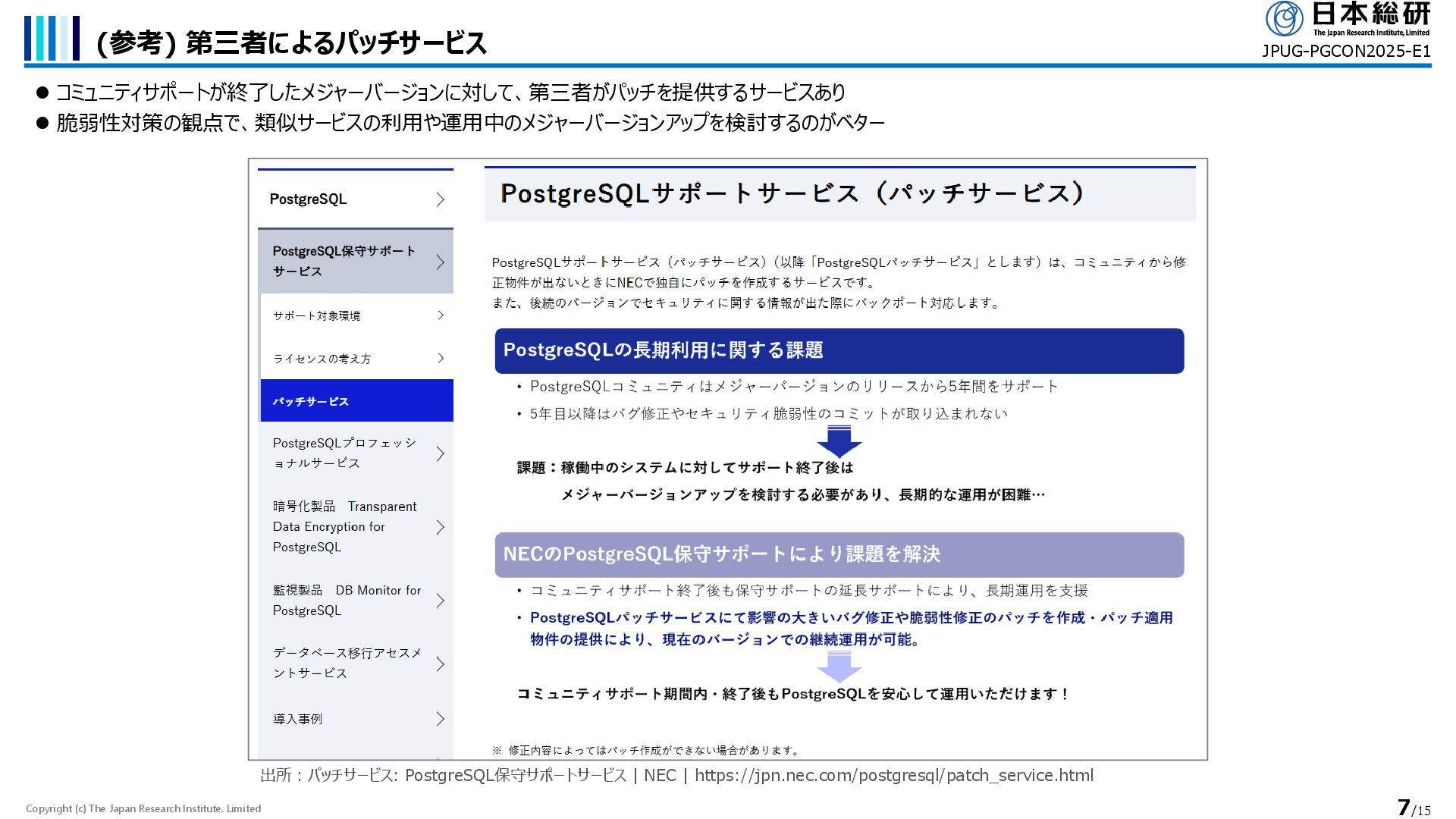 ⚫ コミュニティサポートが終了したメジャーバージョンに対して、第三者がパッチを提供するサービスあり ⚫ 脆弱性対策の観点で、類似サービスの利用や運用中のメジャーバージョンアップを検討するのがベター JPUG-PGCON2025-E1 出所:パッチサービス: PostgreSQL保守サポートサービス | NEC | https://jpn.nec.com/postgresql/patch_service.html