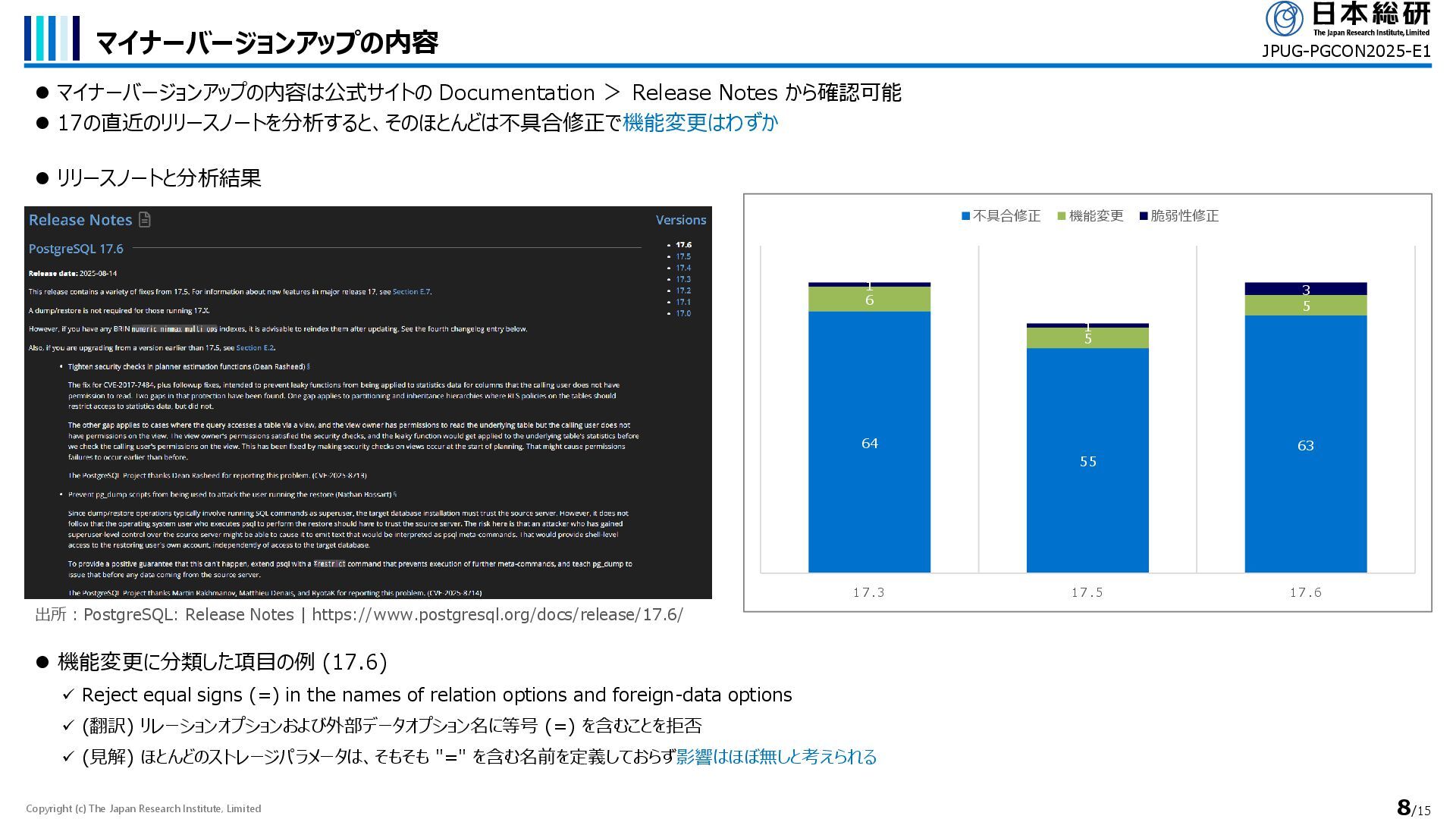 マイナーバージョンアップの内容は公式サイトの Documentation > Release Notes から確認可能 ⚫ 17の直近のリリースノートを分析すると、そのほとんどは不具合修正で機能変更はわずか JPUG-PGCON2025-E1 64 55 63 6 5 5 1 1 3 1 7 .3 1 7 .5 1 7 .6 不具合修正 機能変更 脆弱性修正 ⚫ リリースノートと分析結果 ⚫ 機能変更に分類した項目の例 (17.6) ✓ Reject equal signs (=) in the names of relation options and foreign-data options ✓ (翻訳) リレーションオプションおよび外部データオプション名に等号 (=) を含むことを拒否 ✓ (見解) ほとんどのストレージパラメータは、そもそも "=" を含む名前を定義しておらず影響はほぼ無しと考えられる 出所:PostgreSQL: Release Notes | https://www.postgresql.org/docs/release/17.6/