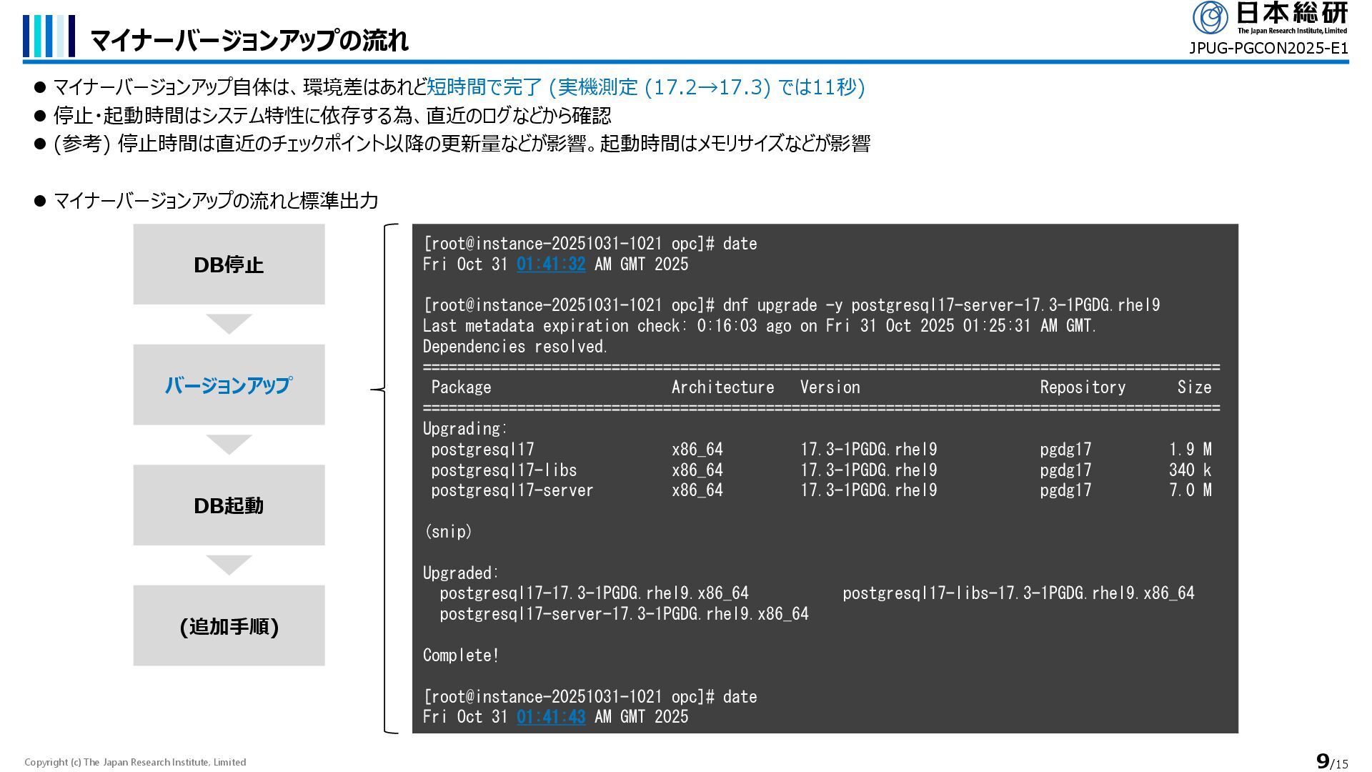 マイナーバージョンアップ自体は、環境差はあれど短時間で完了 (実機測定 (17.2→17.3) では11秒) ⚫ 停止・起動時間はシステム特性に依存する為、直近のログなどから確認 ⚫ (参考) 停止時間は直近のチェックポイント以降の更新量などが影響。起動時間はメモリサイズなどが影響 JPUG-PGCON2025-E1 ⚫ マイナーバージョンアップの流れと標準出力 [root@instance-20251031-1021 opc]# date Fri Oct 31 01:41:32 AM GMT 2025 [root@instance-20251031-1021 opc]# dnf upgrade -y postgresql17-server-17.3-1PGDG.rhel9 Last metadata expiration check: 0:16:03 ago on Fri 31 Oct 2025 01:25:31 AM GMT. Dependencies resolved. ============================================================================================= Package Architecture Version Repository Size ============================================================================================= Upgrading: postgresql17 x86_64 17.3-1PGDG.rhel9 pgdg17 1.9 M postgresql17-libs x86_64 17.3-1PGDG.rhel9 pgdg17 340 k postgresql17-server x86_64 17.3-1PGDG.rhel9 pgdg17 7.0 M (snip) Upgraded: postgresql17-17.3-1PGDG.rhel9.x86_64 postgresql17-libs-17.3-1PGDG.rhel9.x86_64 postgresql17-server-17.3-1PGDG.rhel9.x86_64 Complete! [root@instance-20251031-1021 opc]# date Fri Oct 31 01:41:43 AM GMT 2025 DB停止 バージョンアップ DB起動 (追加手順)