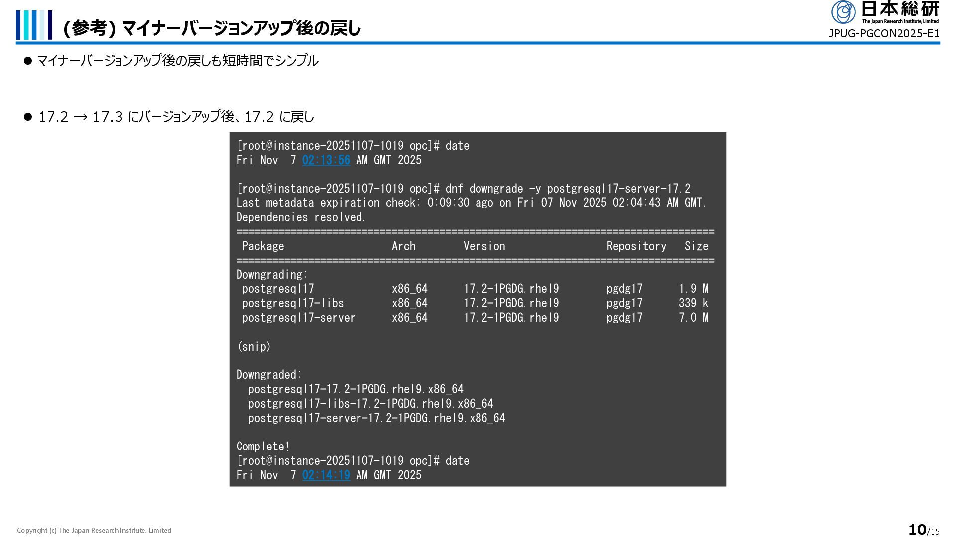 ⚫ マイナーバージョンアップ後の戻しも短時間でシンプル JPUG-PGCON2025-E1 ⚫ 17.2 → 17.3 にバージョンアップ後、17.2 に戻し [root@instance-20251107-1019 opc]# date Fri Nov 7 02:13:56 AM GMT 2025 [root@instance-20251107-1019 opc]# dnf downgrade -y postgresql17-server-17.2 Last metadata expiration check: 0:09:30 ago on Fri 07 Nov 2025 02:04:43 AM GMT. Dependencies resolved. ================================================================================ Package Arch Version Repository Size ================================================================================ Downgrading: postgresql17 x86_64 17.2-1PGDG.rhel9 pgdg17 1.9 M postgresql17-libs x86_64 17.2-1PGDG.rhel9 pgdg17 339 k postgresql17-server x86_64 17.2-1PGDG.rhel9 pgdg17 7.0 M (snip) Downgraded: postgresql17-17.2-1PGDG.rhel9.x86_64 postgresql17-libs-17.2-1PGDG.rhel9.x86_64 postgresql17-server-17.2-1PGDG.rhel9.x86_64 Complete! [root@instance-20251107-1019 opc]# date Fri Nov 7 02:14:19 AM GMT 2025
