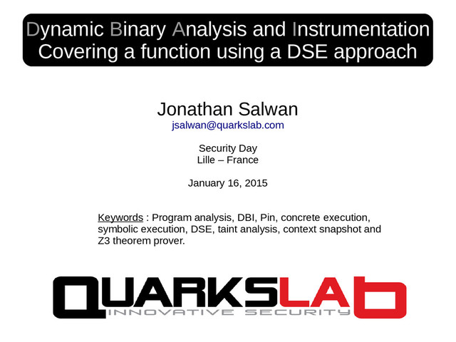 This talk is about binary analysis and instrumentation. We will see how it's possible to target a specific function, snapshot the context memory/registers before the function, translate the instrumentation into an intermediate representation,apply a taint analysis based on this IR, build/keep formulas for a Dynamic Symbolic Execution (DSE), generate a concrete value to go through a specific path, restore the context memory/register and generate another concrete value to go through another path then repeat this operation until the target function is covered.
