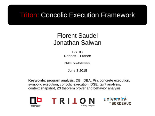 This talk is about the release of Triton, a concolic execution framework based on Pin. It provides components like a taint engine, a dynamic symbolic execution engine, a snapshot engine, translation of x64 instruction to SMT2, a Z3 interface to solve constraints and Python bindings. Based on these components, Triton offers the possibility to build tools for vulnerabilities research or reverse-engineering assistance.