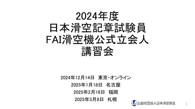2024年度 日本滑空記章試験員 FAI滑空機公式立会人 講習会 2024年12月14日 東京・オンライン 2025年1月18日 名古屋 2025年2月16日 福岡