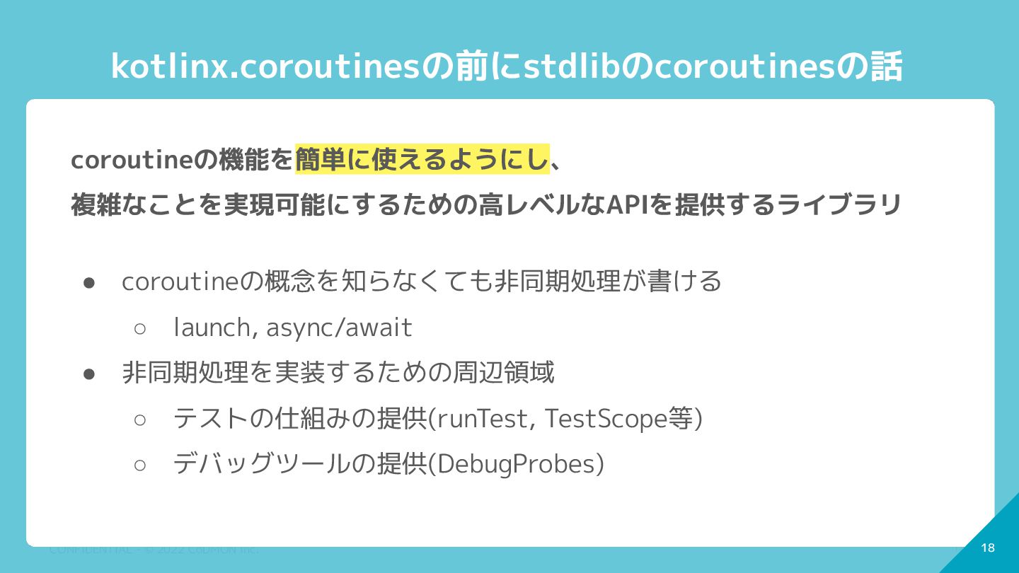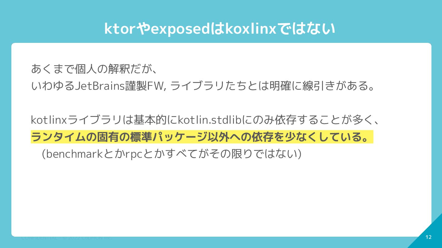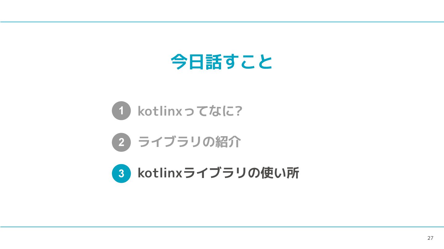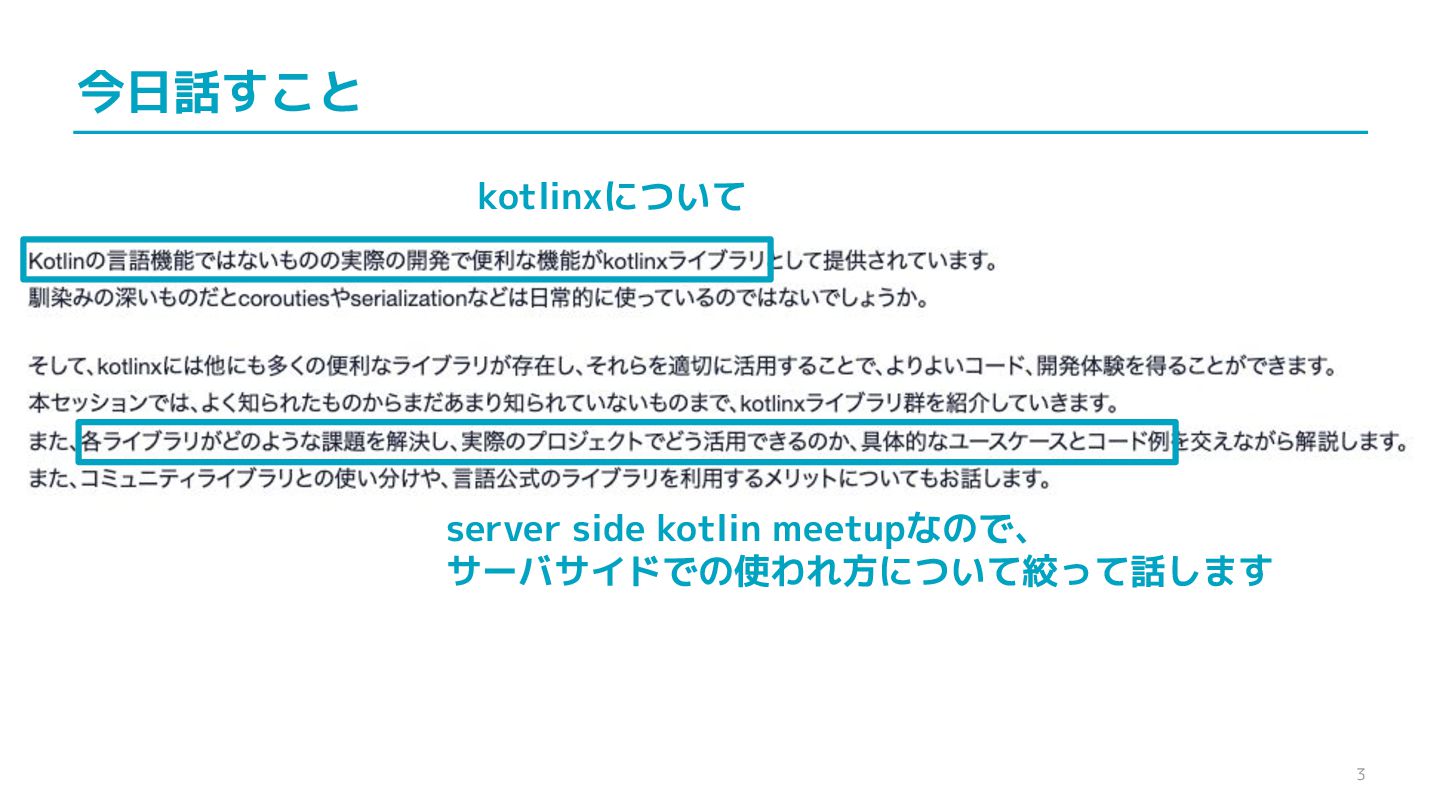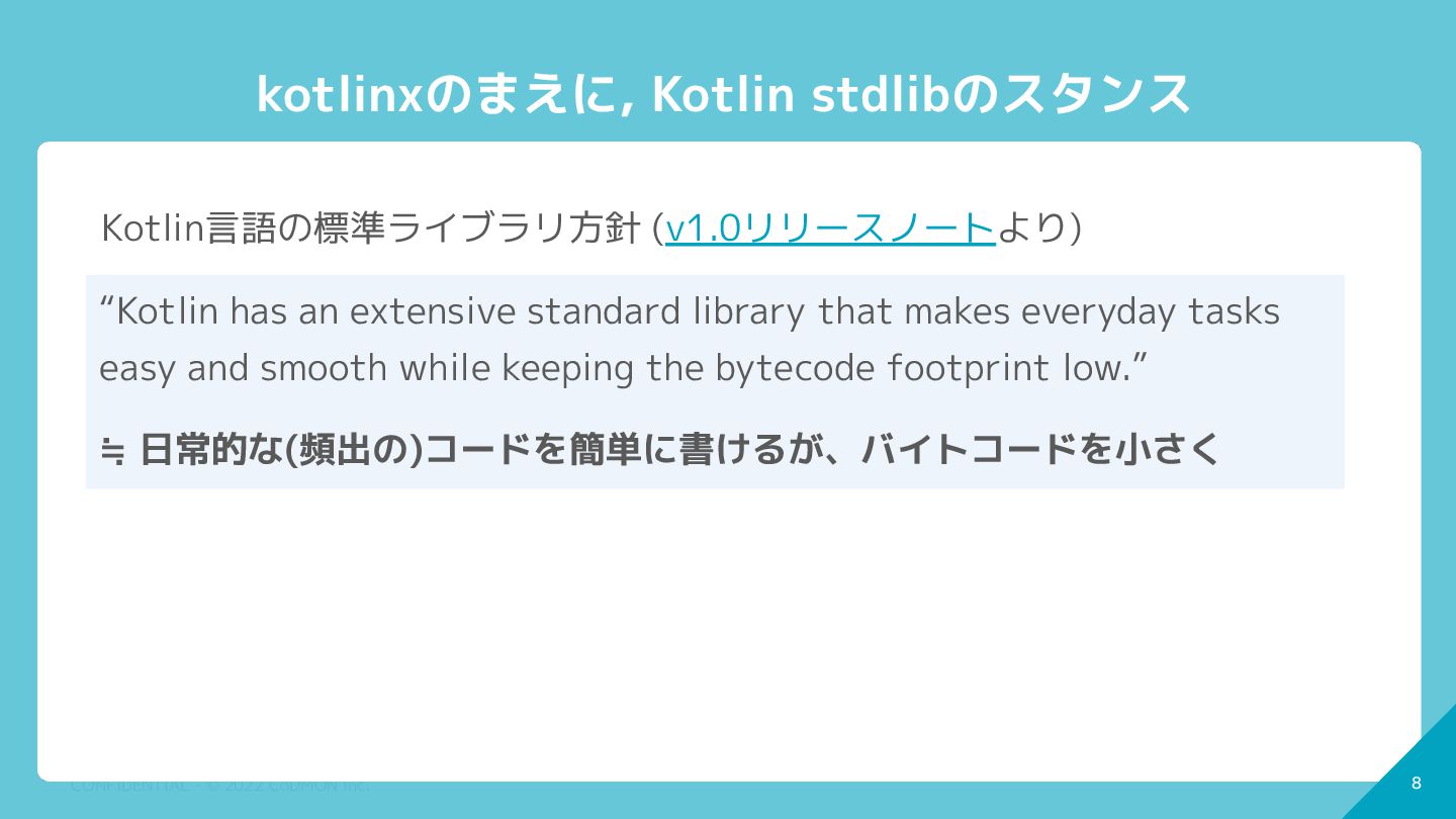stdlibのスタンス Kotlin言語の標準ライブラリ方針 (v1.0リリースノートより) “Kotlin has an extensive standard library that makes everyday tasks easy and smooth while keeping the bytecode footprint low.” ≒ 日常的な(頻出の)コードを簡単に書けるが、バイトコードを小さく