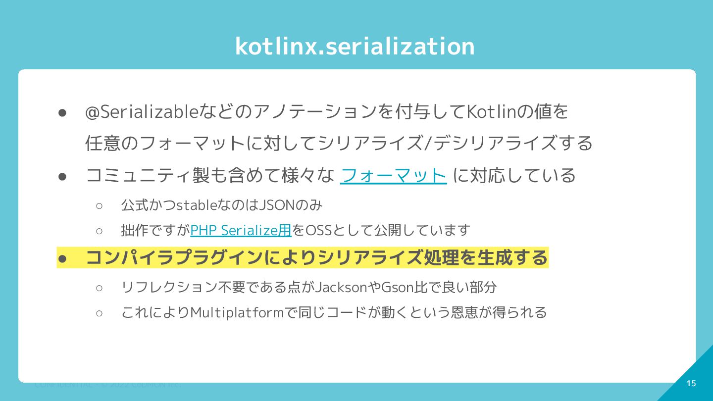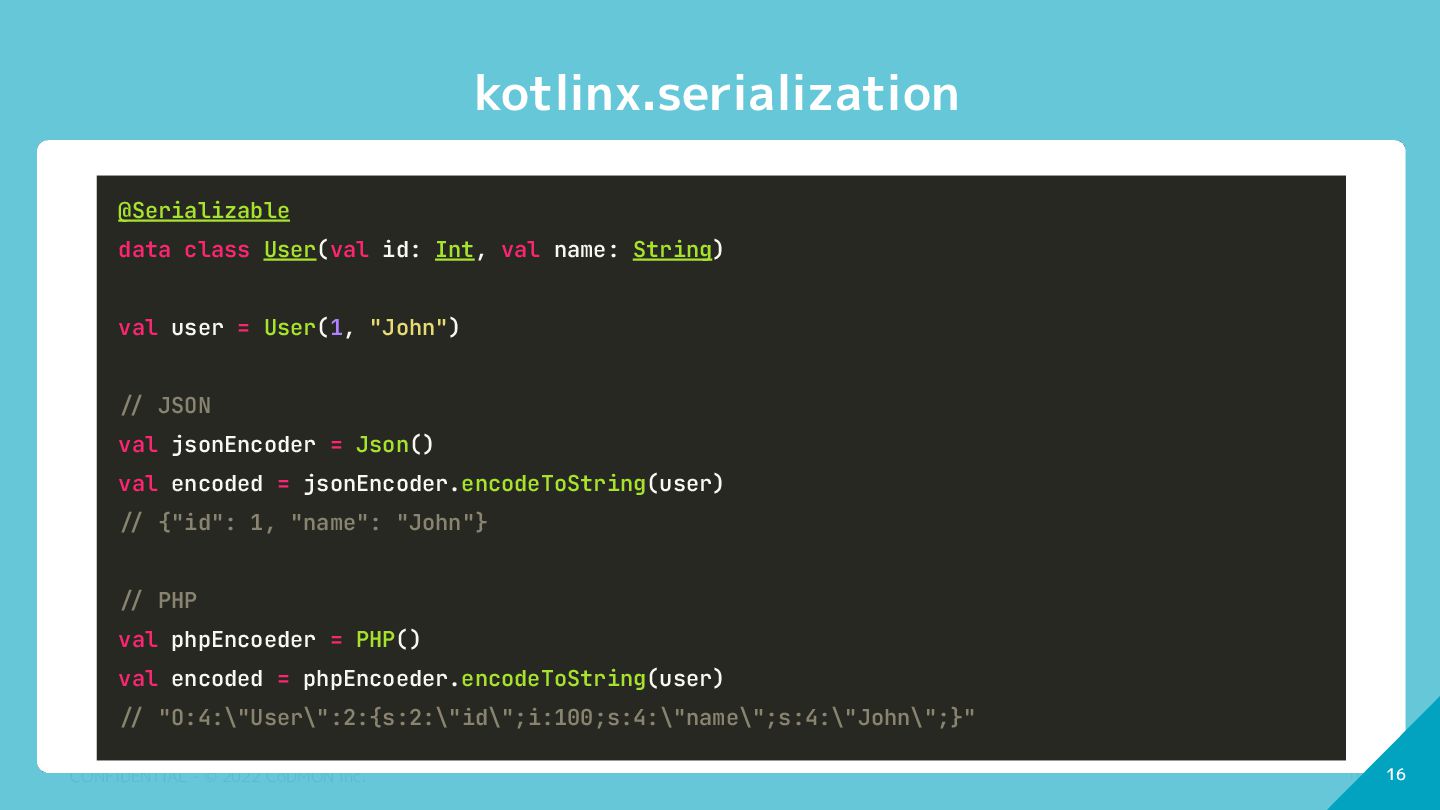 data class User(val id: Int, val name: String) val user = User(1, "John") !/ JSON val jsonEncoder = Json() val encoded = jsonEncoder.encodeToString(user) !/ {"id": 1, "name": "John"} !/ PHP val phpEncoeder = PHP() val encoded = phpEncoeder.encodeToString(user) !/ "O:4:\"User\":2:{s:2:\"id\";i:100;s:4:\"name\";s:4:\"John\";}"