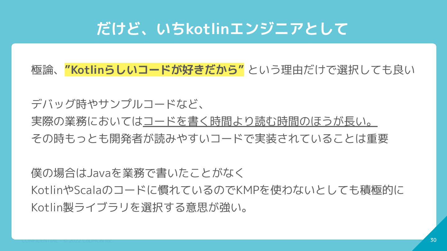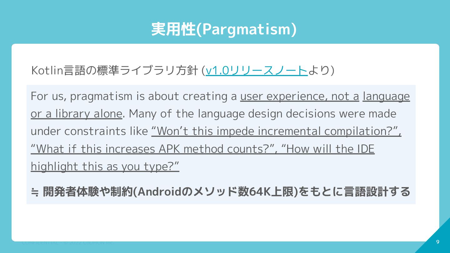 (v1.0リリースノートより) For us, pragmatism is about creating a user experience, not a language or a library alone. Many of the language design decisions were made under constraints like “Won’t this impede incremental compilation?”, “What if this increases APK method counts?”, “How will the IDE highlight this as you type?” ≒ 開発者体験や制約(Androidのメソッド数64K上限)をもとに言語設計する