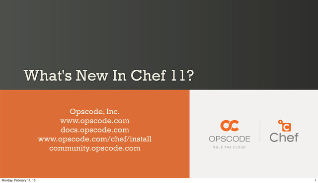 and environment attributes • delayed notifications run after failed converge • encrypted data bag item format change • chef-client lock so safe from simultaneous runs 32 Monday, February 11, 13