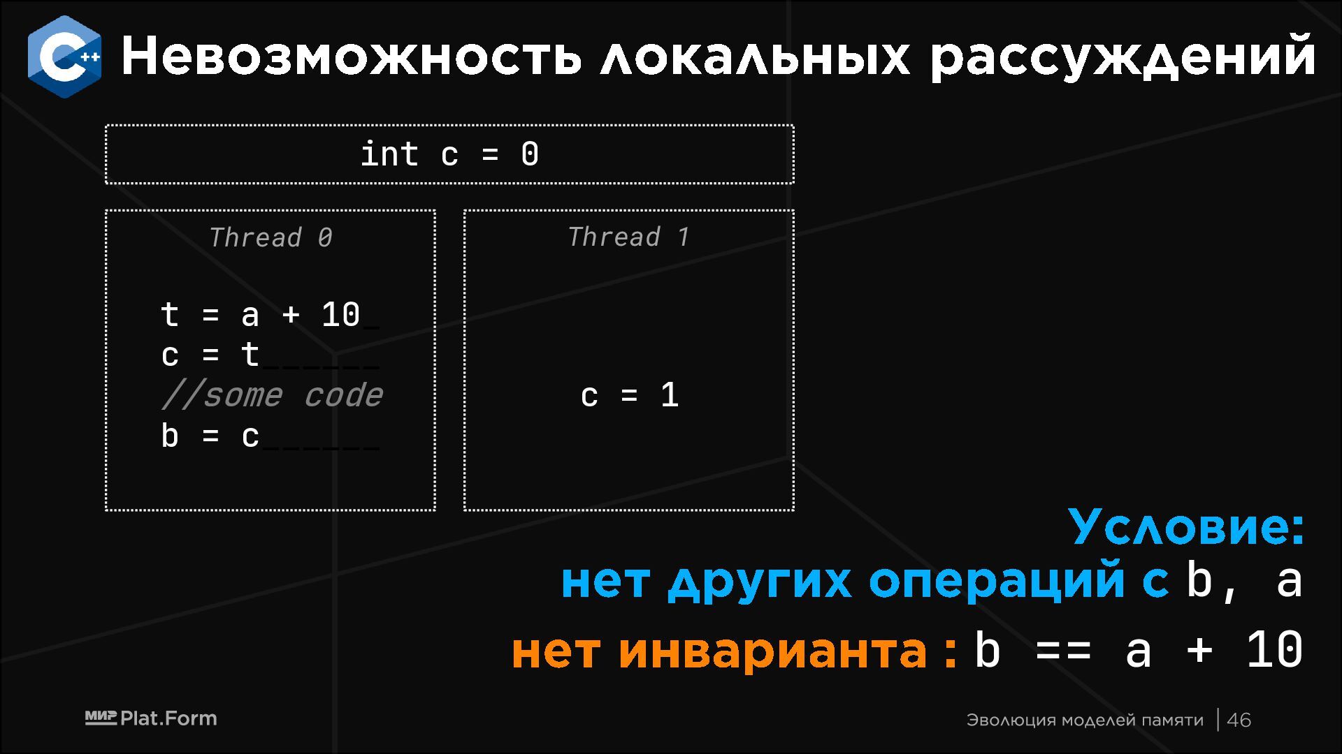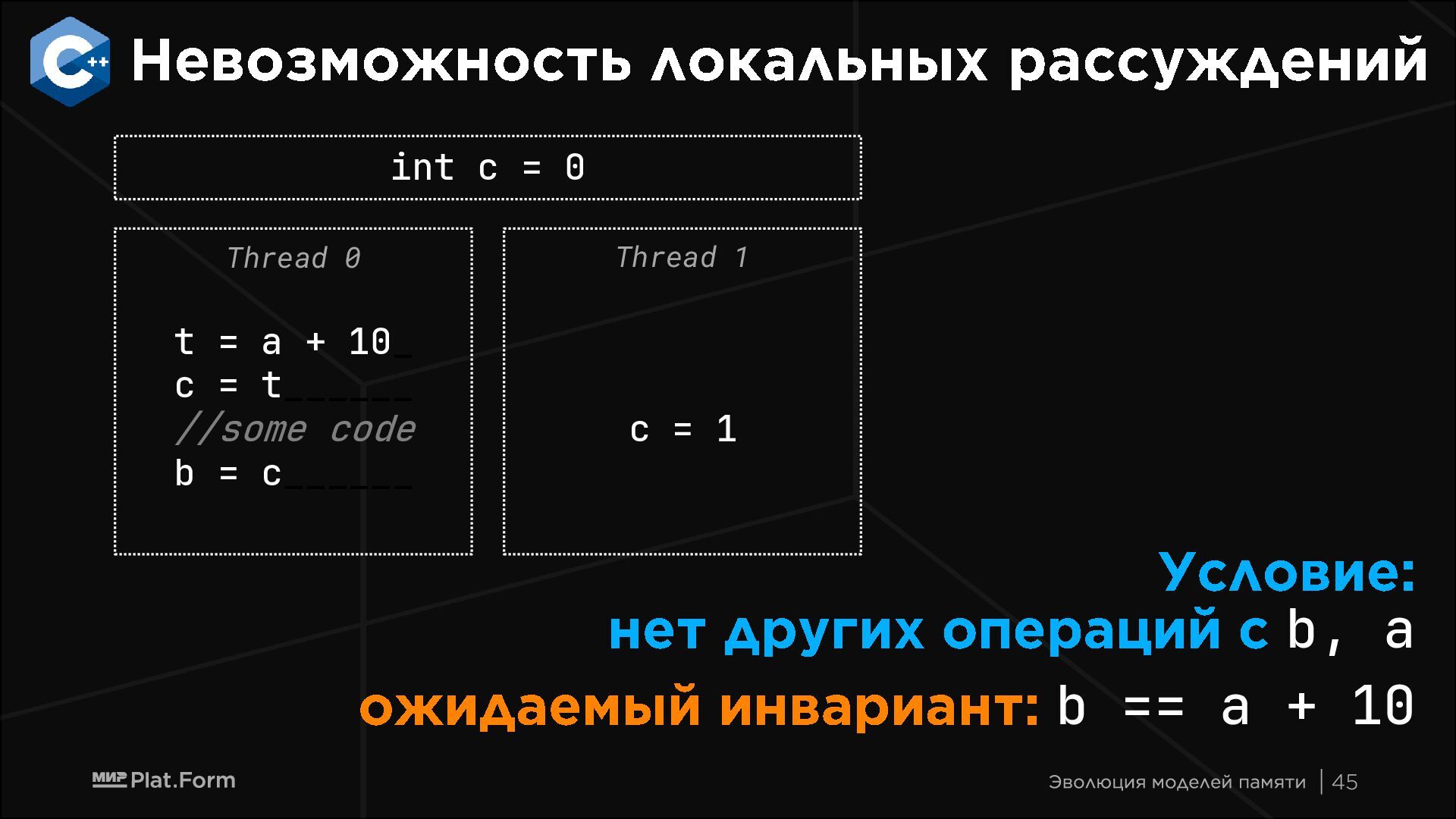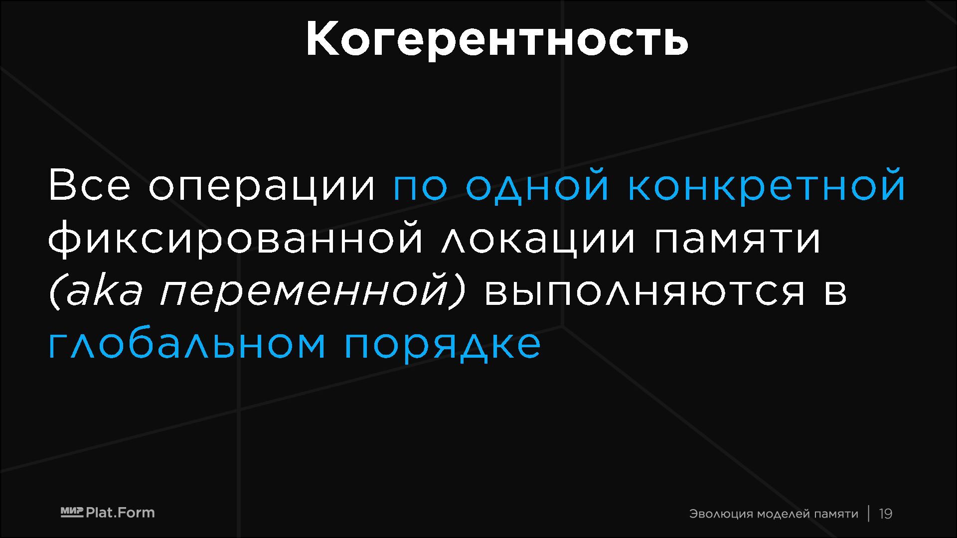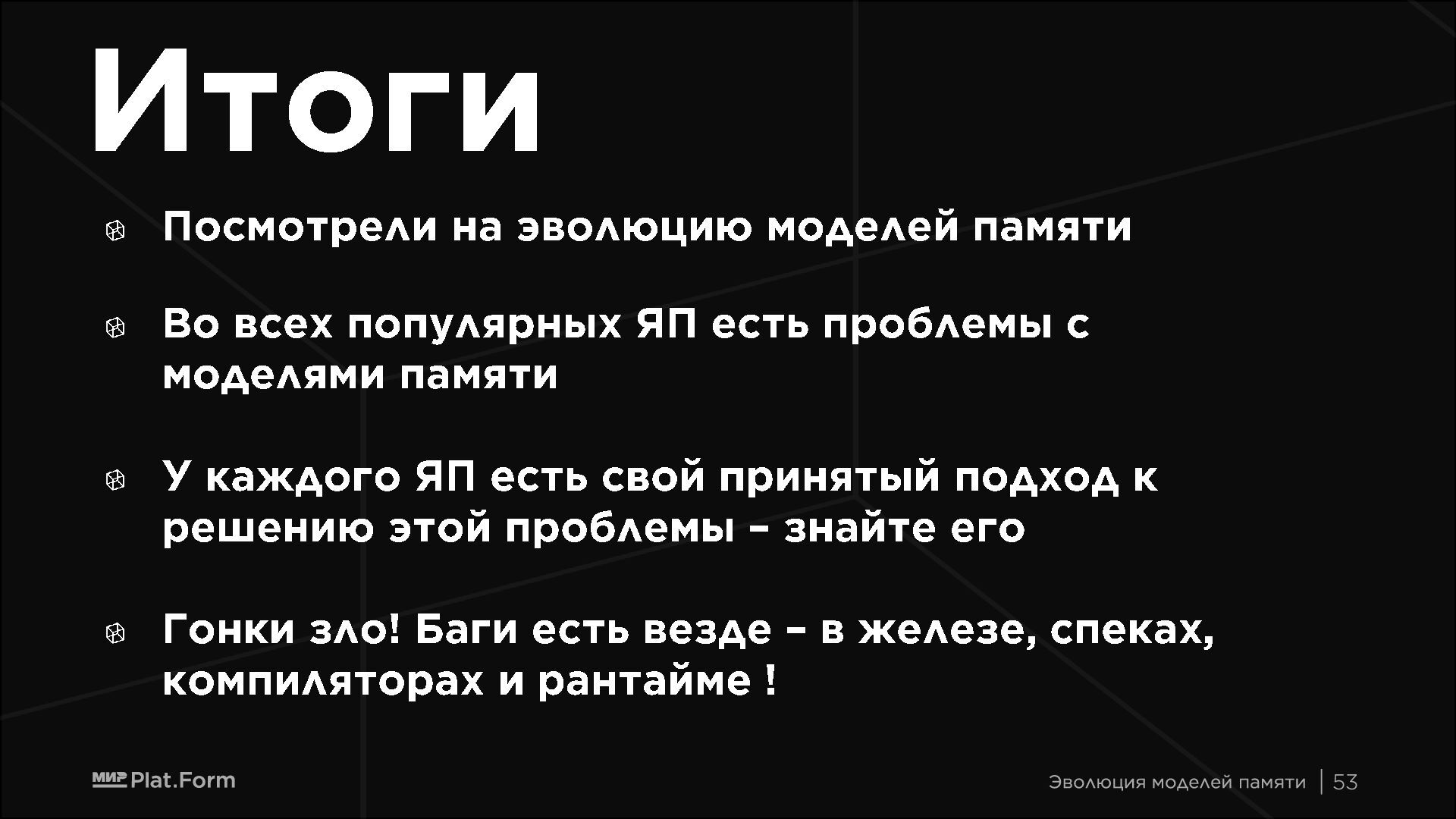Цель доклада — помочь лучше разобраться в ключевых аспектах моделей памяти и показать, как они эволюционировали до сегодняшнего дня. Будет полезно всем, кто интересуется вопросами многопоточности и конкурентности.