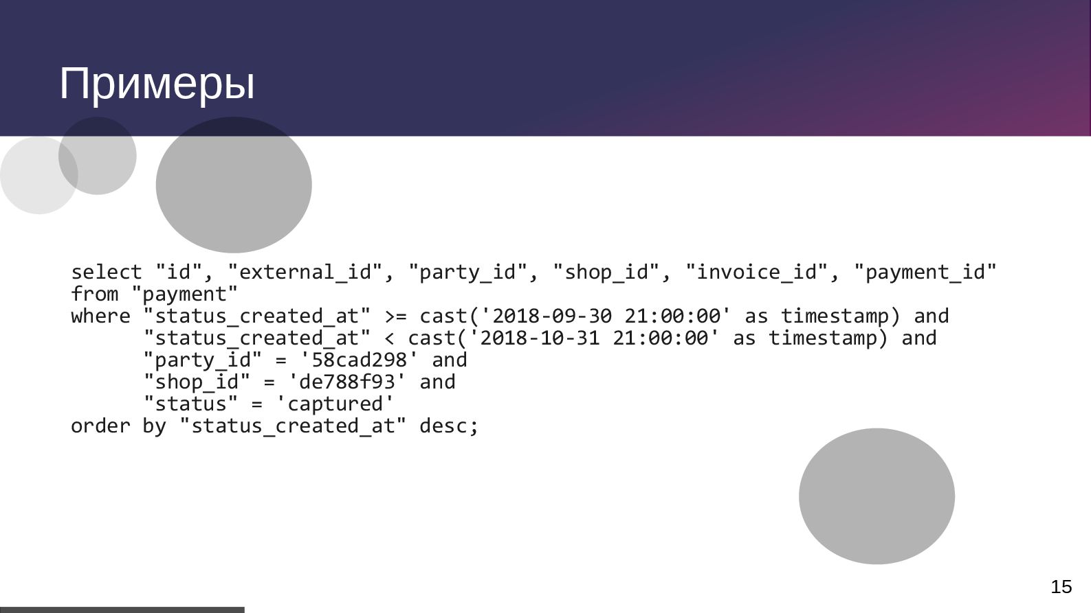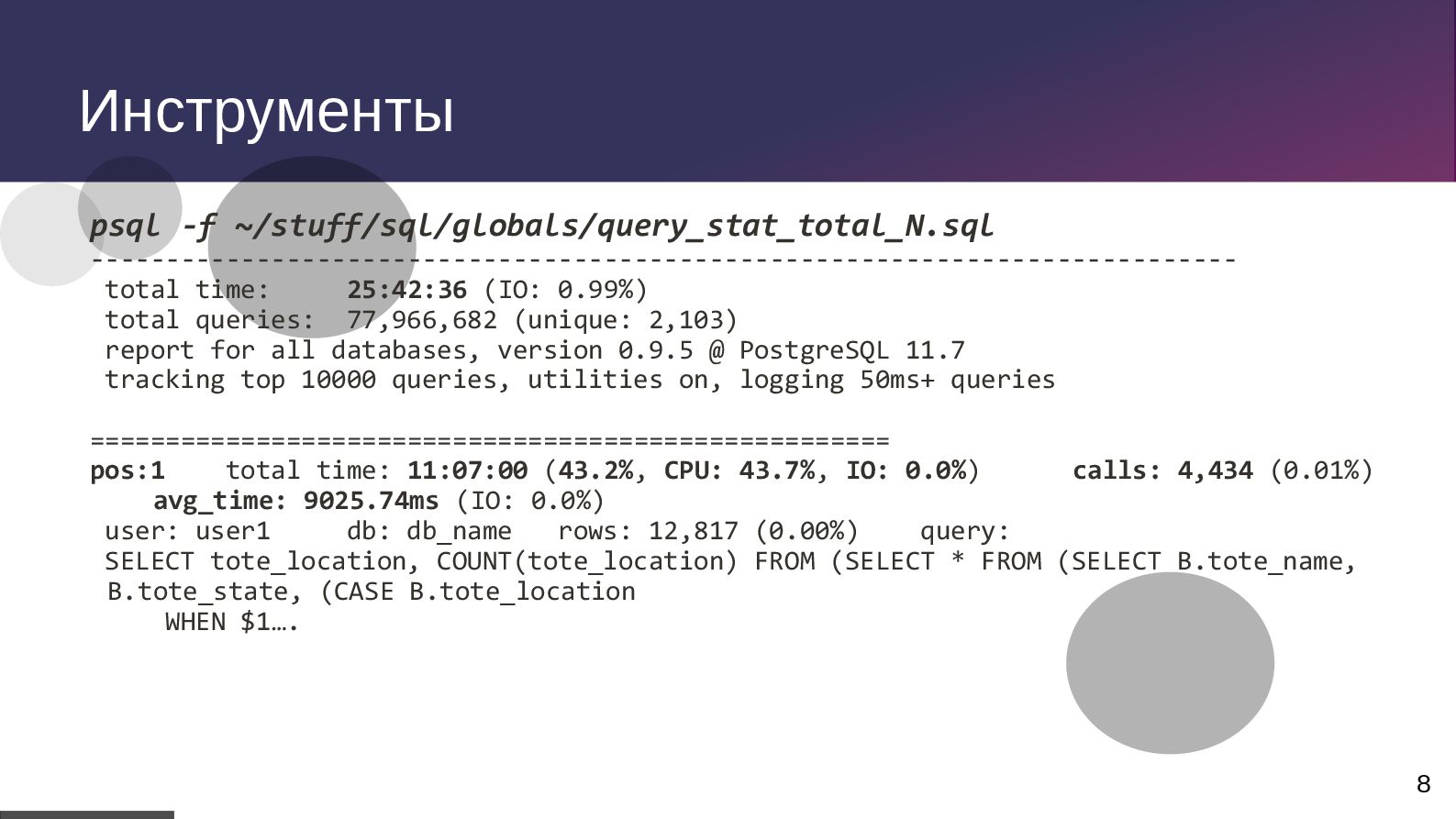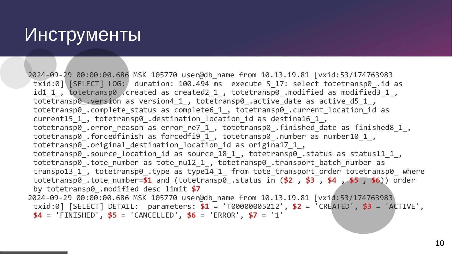 txid:0] [SELECT] LOG: duration: 100.494 ms execute S_17: select totetransp0_.id as id1_1_, totetransp0_.created as created2_1_, totetransp0_.modified as modified3_1_, totetransp0_.version as version4_1_, totetransp0_.active_date as active_d5_1_, totetransp0_.complete_status as complete6_1_, totetransp0_.current_location_id as current15_1_, totetransp0_.destination_location_id as destina16_1_, totetransp0_.error_reason as error_re7_1_, totetransp0_.finished_date as finished8_1_, totetransp0_.forcedfinish as forcedfi9_1_, totetransp0_.number as number10_1_, totetransp0_.original_destination_location_id as origina17_1_, totetransp0_.source_location_id as source_18_1_, totetransp0_.status as status11_1_, totetransp0_.tote_number as tote_nu12_1_, totetransp0_.transport_batch_number as transpo13_1_, totetransp0_.type as type14_1_ from tote_transport_order totetransp0_ where totetransp0_.tote_number=$1 and (totetransp0_.status in ($2 , $3 , $4 , $5 , $6)) order by totetransp0_.modified desc limit $7 2024-09-29 00:00:00.686 MSK 105770 user@db_name from 10.13.19.81 [vxid:53/174763983 txid:0] [SELECT] DETAIL: parameters: $1 = 'T00000005212', $2 = 'CREATED', $3 = 'ACTIVE', $4 = 'FINISHED', $5 = 'CANCELLED', $6 = 'ERROR', $7 = '1'
