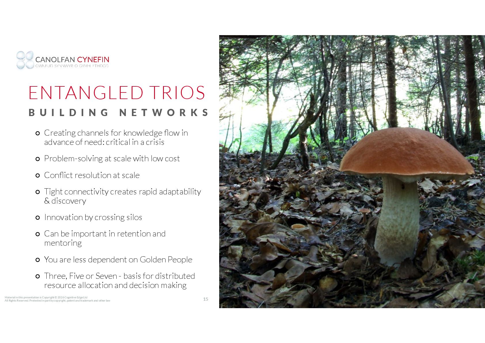 Ltd All Rights Reserved. Protected in part by copyright, patent and trademark and other law Material in this presentation is Copyright © 2026 Cognitive Edge Ltd All Rights Reserved. Protected in part by copyright, patent and trademark and other law B U I L D I N G N E T W O R K S ENTANGLED TRIOS Creating channels for knowledge fl ow in advance of need: critical in a crisis Problem-solving at scale with low cost Con fl ict resolution at scale Tight connectivity creates rapid adaptability & discovery Innovation by crossing silos Can be important in retention and mentoring You are less dependent on Golden People Three, Five or Seven - basis for distributed resource allocation and decision making 15