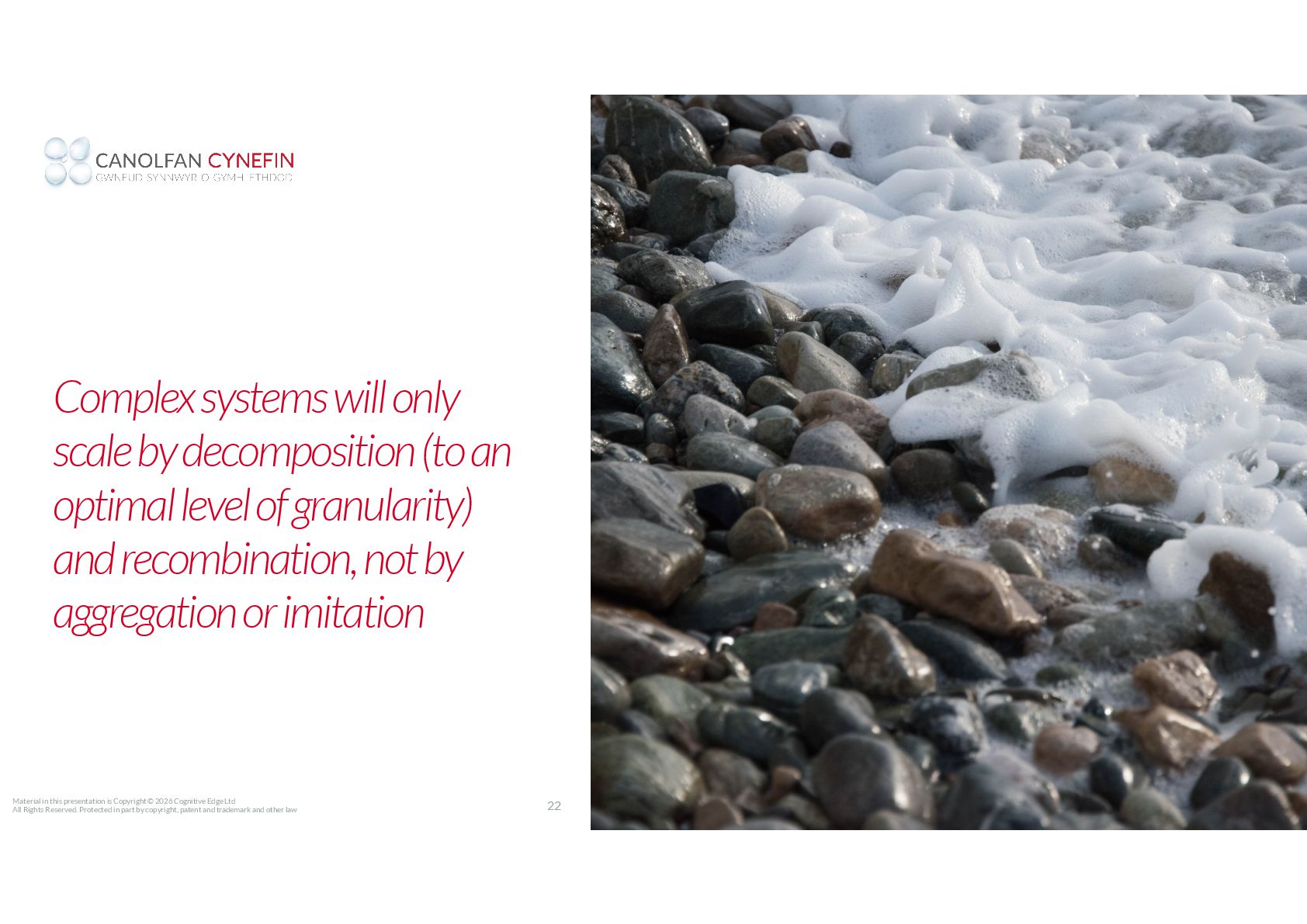 Ltd All Rights Reserved. Protected in part by copyright, patent and trademark and other law Material in this presentation is Copyright © 2026 Cognitive Edge Ltd All Rights Reserved. Protected in part by copyright, patent and trademark and other law 22 Complex systems will only scale by decomposition (to an optimal level of granularity) and recombination, not by aggregation or imitation