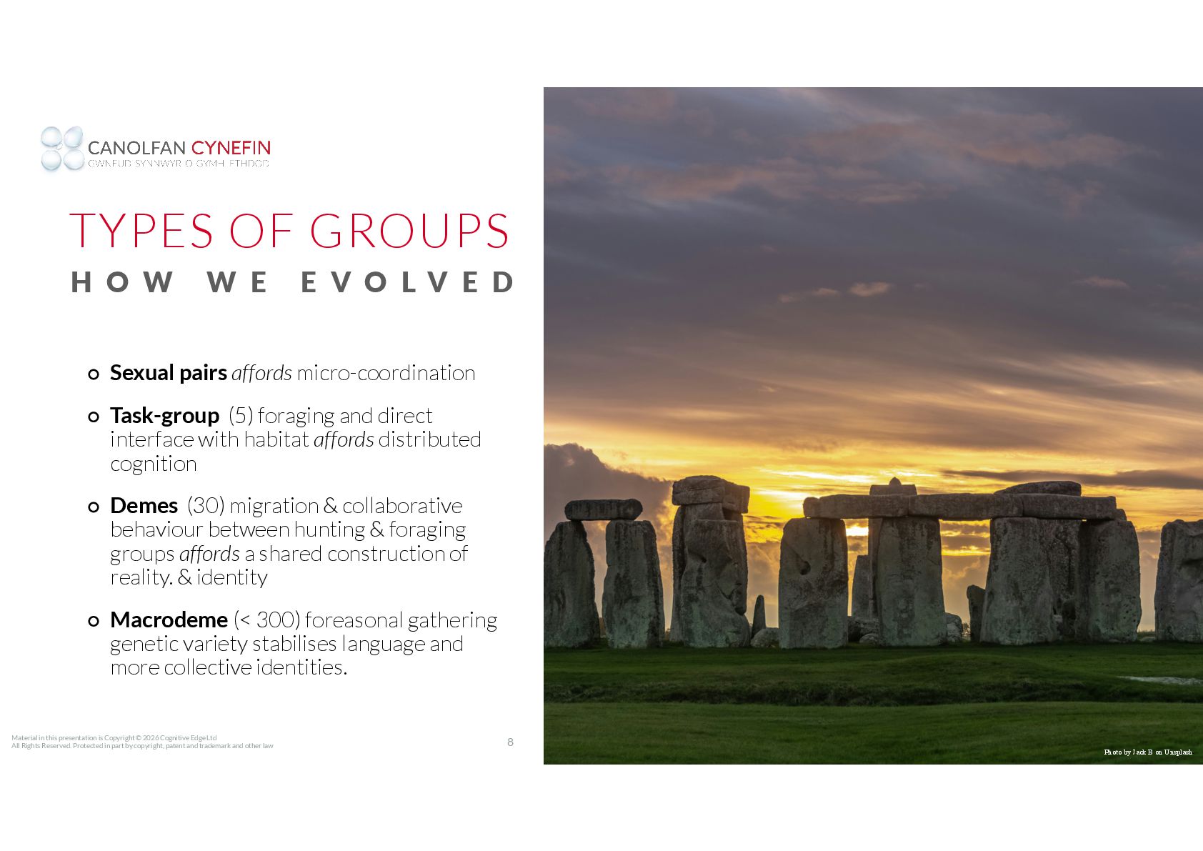 Ltd All Rights Reserved. Protected in part by copyright, patent and trademark and other law Material in this presentation is Copyright © 2026 Cognitive Edge Ltd All Rights Reserved. Protected in part by copyright, patent and trademark and other law H O W W E E V O L V E D TYPES OF GROUPS Sexual pairs affords micro-coordination Task-group (5) foraging and direct interface with habitat affords distributed cognition Demes (30) migration & collaborative behaviour between hunting & foraging groups affords a shared construction of reality. & identity Macrodeme (< 300) foreasonal gathering genetic variety stabilises language and more collective identities. 8 Photo by Jack B on Unsplash