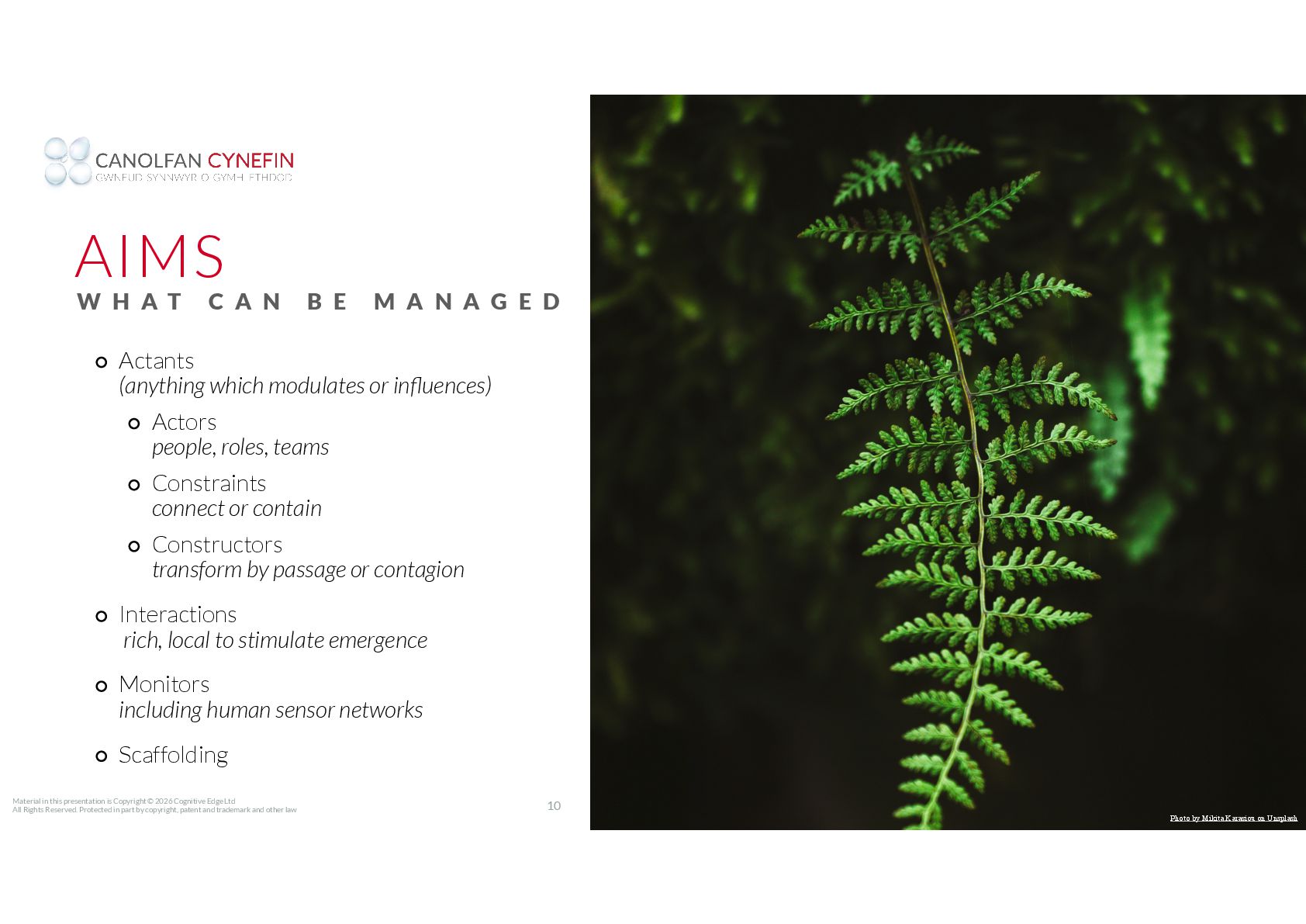 Ltd All Rights Reserved. Protected in part by copyright, patent and trademark and other law Material in this presentation is Copyright © 2026 Cognitive Edge Ltd All Rights Reserved. Protected in part by copyright, patent and trademark and other law W H A T C A N B E M A N A G E D AIMS Actants (anything which modulates or in fl uences) Actors people, roles, teams Constraints connect or contain Constructors transform by passage or contagion Interactions rich, local to stimulate emergence Monitors including human sensor networks Scaffolding 10 Photo by Mikita Karasiou on Unsplash