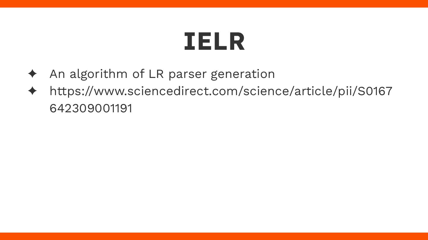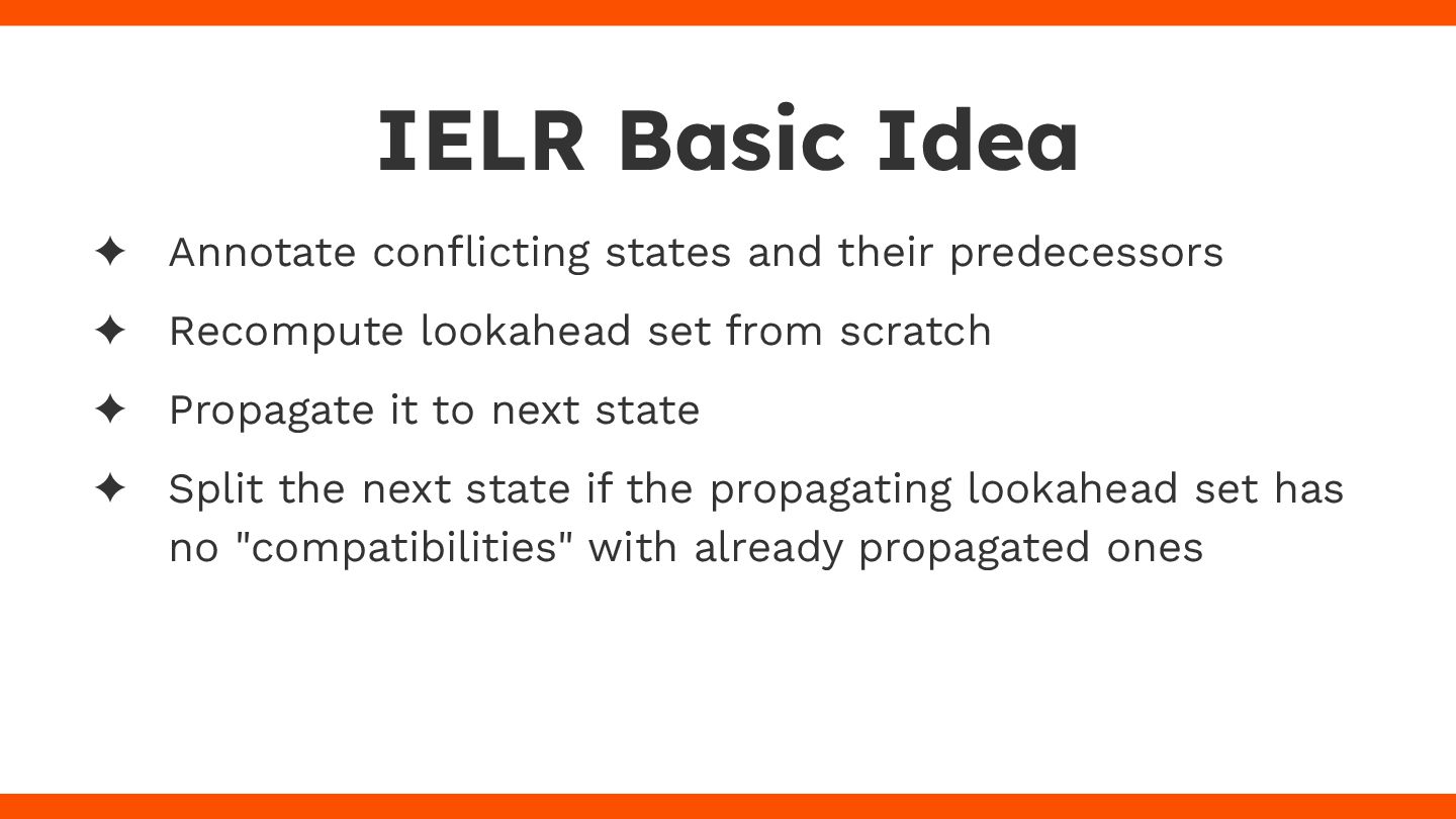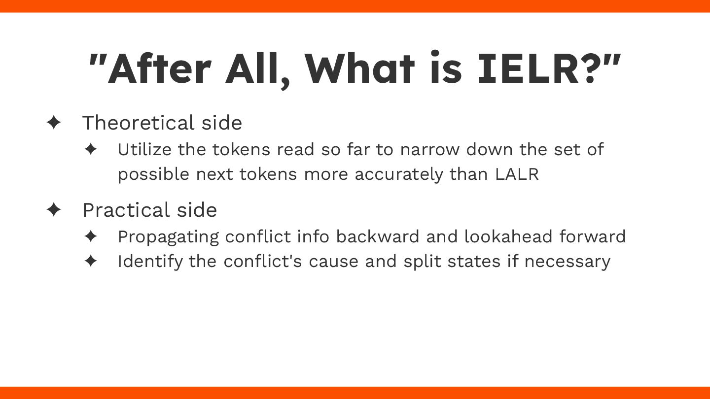 to narrow down the set of possible next tokens more accurately than LALR ✦ Practical side ✦ Propagating conflict info backward and lookahead forward ✦ Identify the conflict's cause and split states if necessary "After All, What is IELR?"
