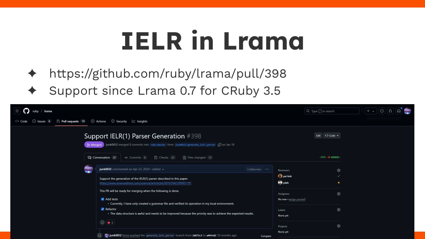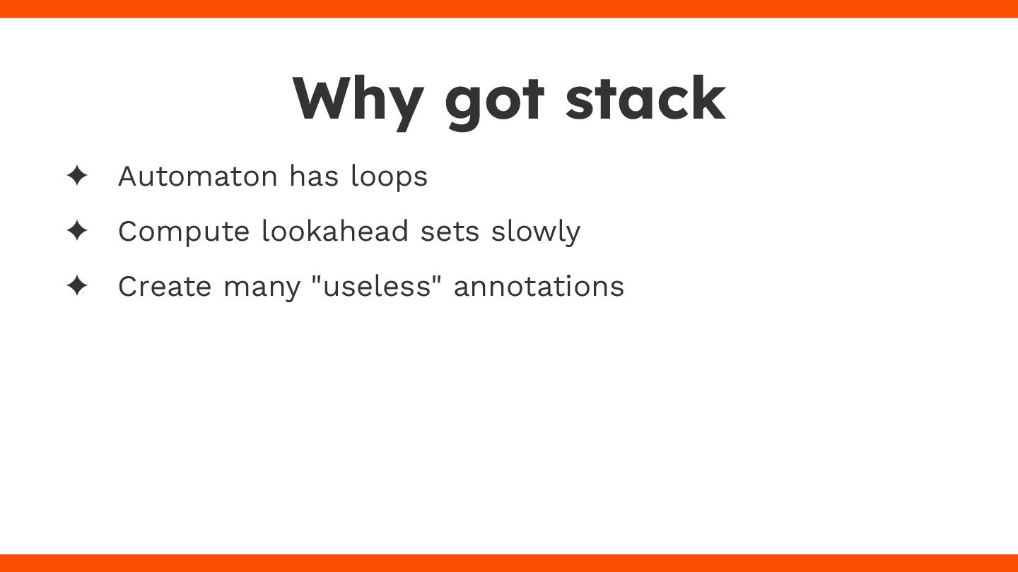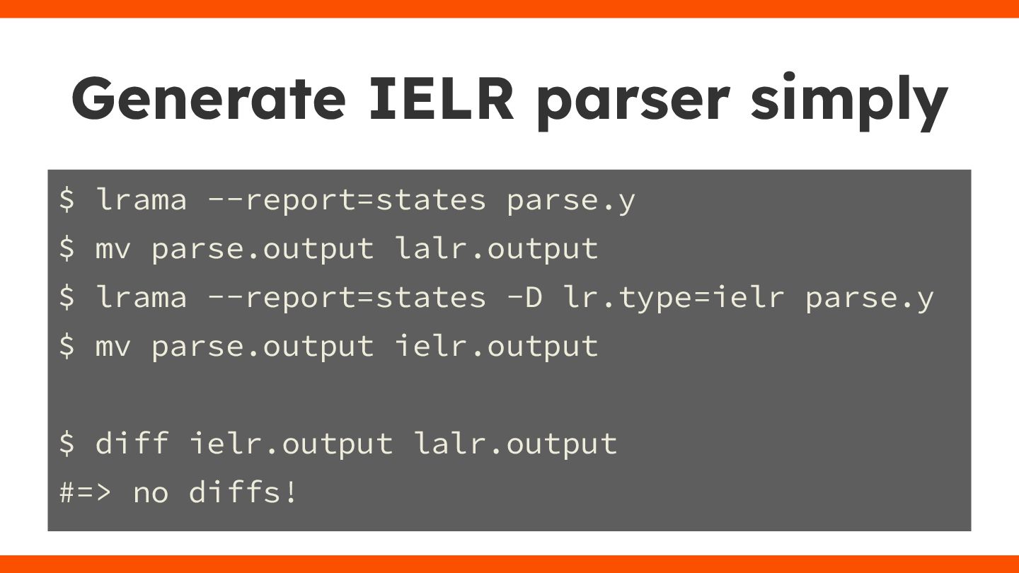 to narrow down the set of possible next tokens more accurately than LALR ✦ Practical side ✦ Propagating conflict info backward and lookahead forward ✦ Identify the conflict's cause and split states if necessary "After All, What is IELR?"