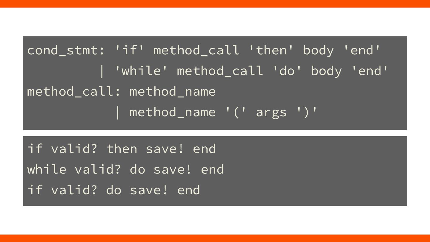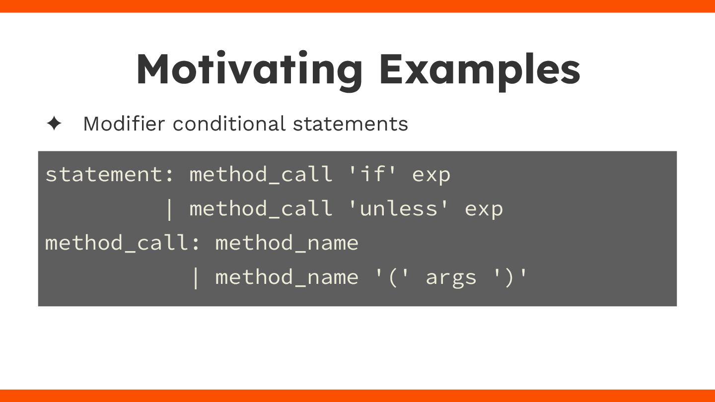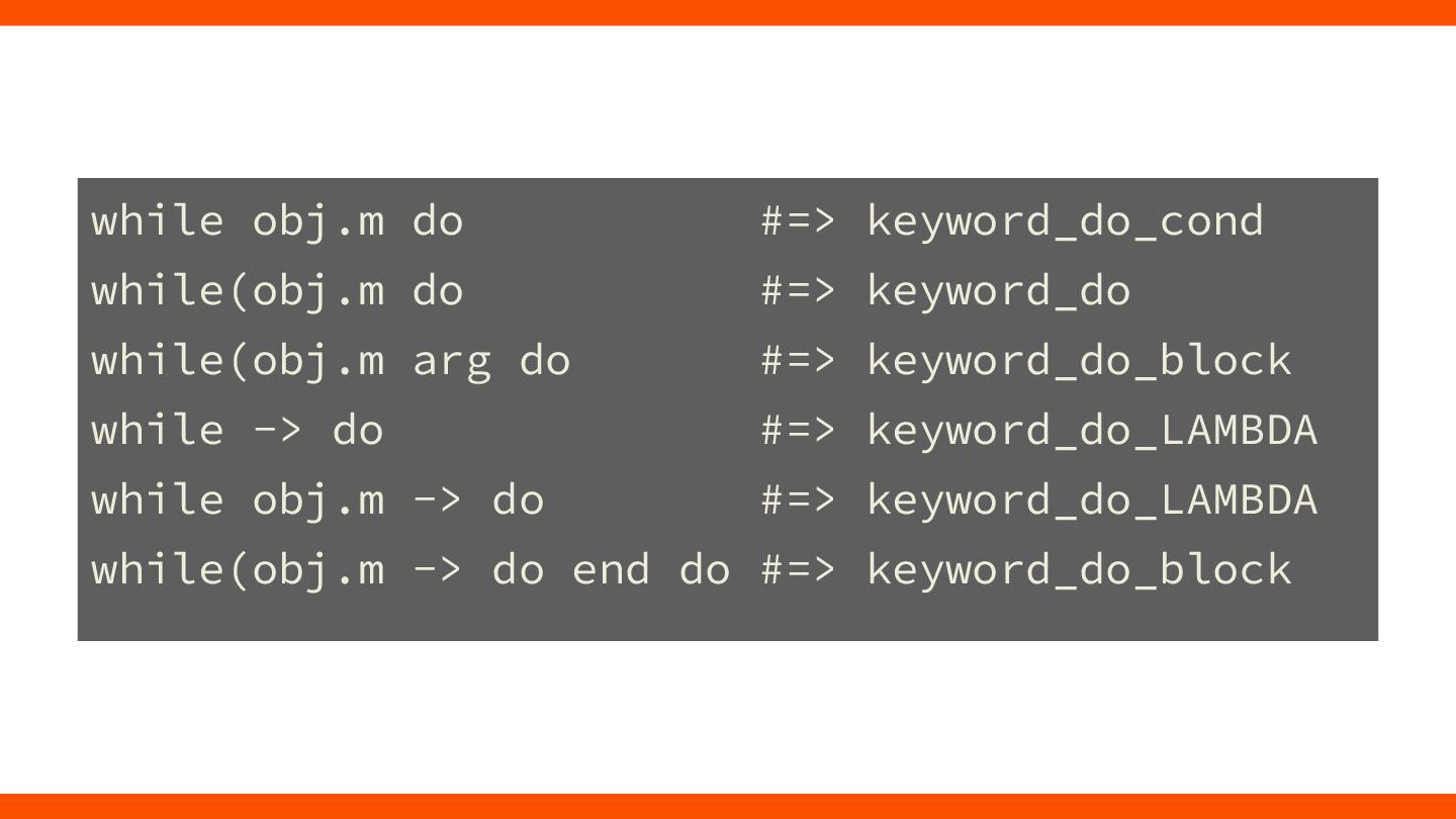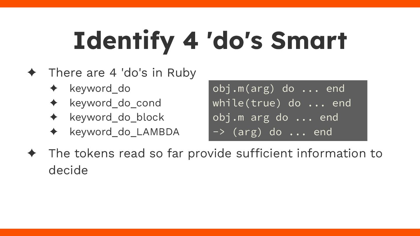 keyword_do_cond ✦ keyword_do_block ✦ keyword_do_LAMBDA ✦ The tokens read so far provide sufficient information to decide Identify 4 'do's Smart obj.m(arg) do ... end while(true) do ... end obj.m arg do ... end -> (arg) do ... end