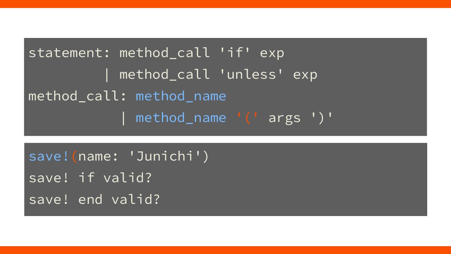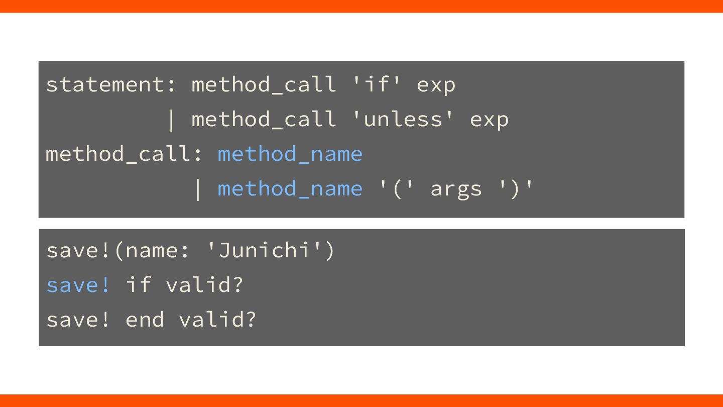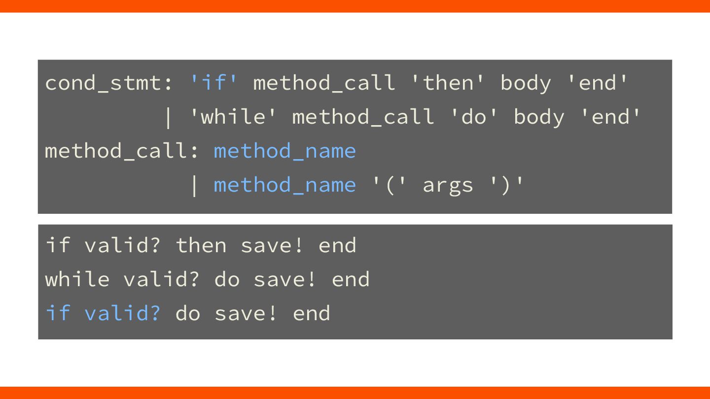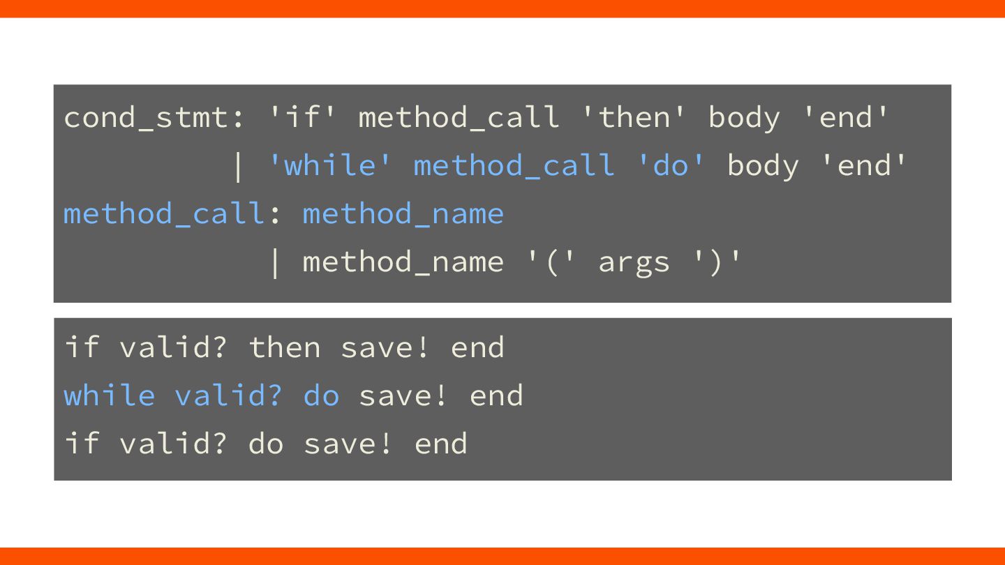 keyword_do_cond ✦ keyword_do_block ✦ keyword_do_LAMBDA ✦ The tokens read so far provide sufficient information to decide Identify 4 'do's Smart obj.m(arg) do ... end while(true) do ... end obj.m arg do ... end -> (arg) do ... end