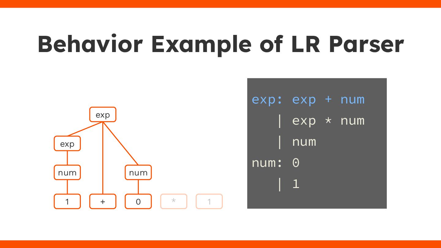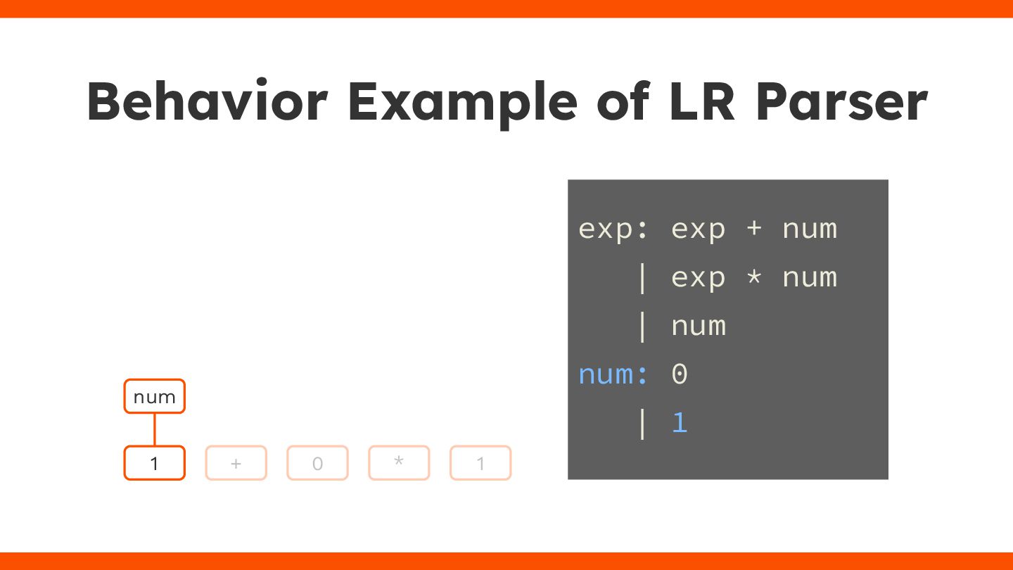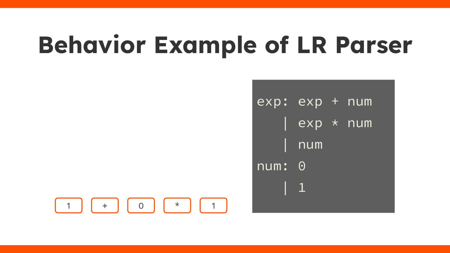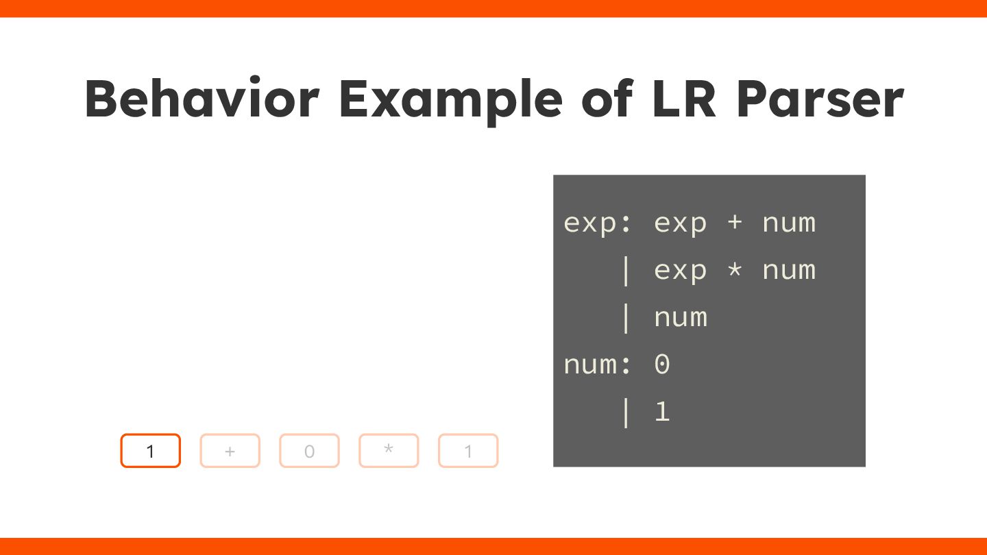 2 types of actions ✦ Shift: Get a next symbol from Lexer ✦ Reduce: Collapse recognized symbols into a parent node ✦ Use one of the actions depending on the situation ✦ Match one of grammar rules: Reduce ✦ Don't match any grammar rules: Shift Basis of LR Parser