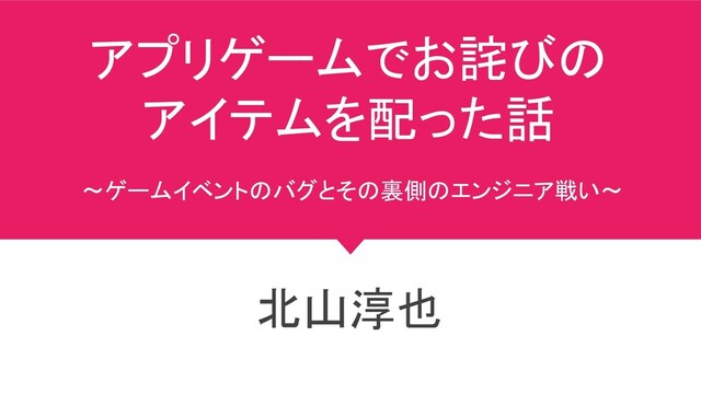 アプリゲームでお詫びの アイテムを配った話 〜ゲームイベントのバグとその裏側のエンジニア戦い〜 北山淳也