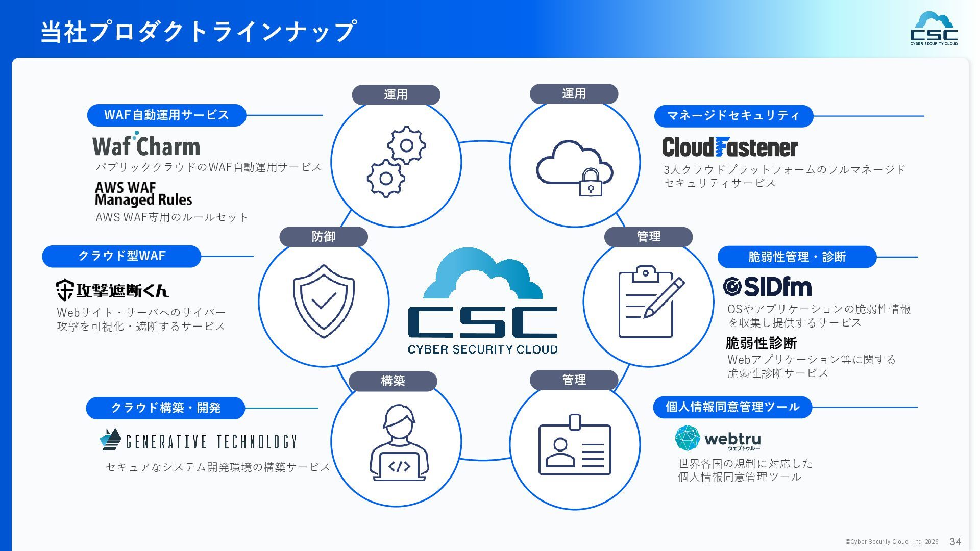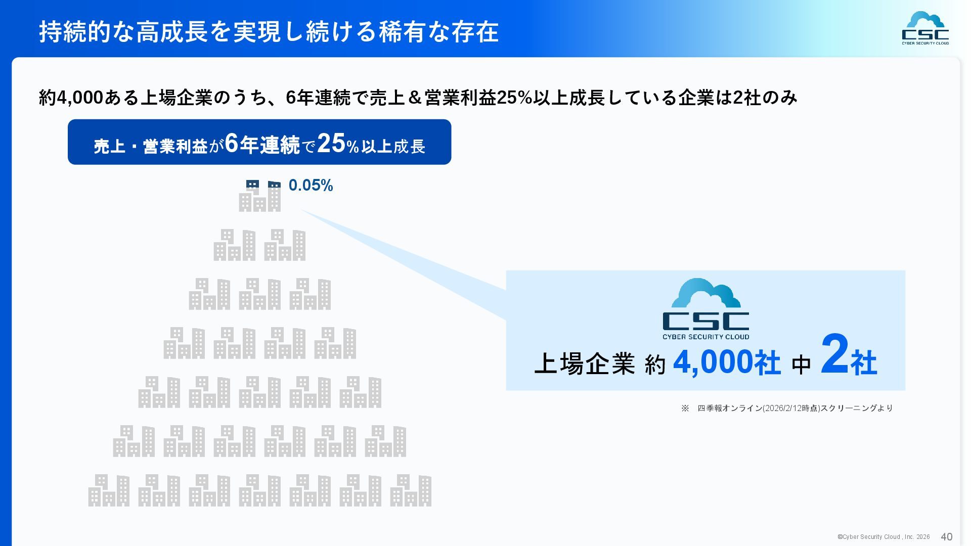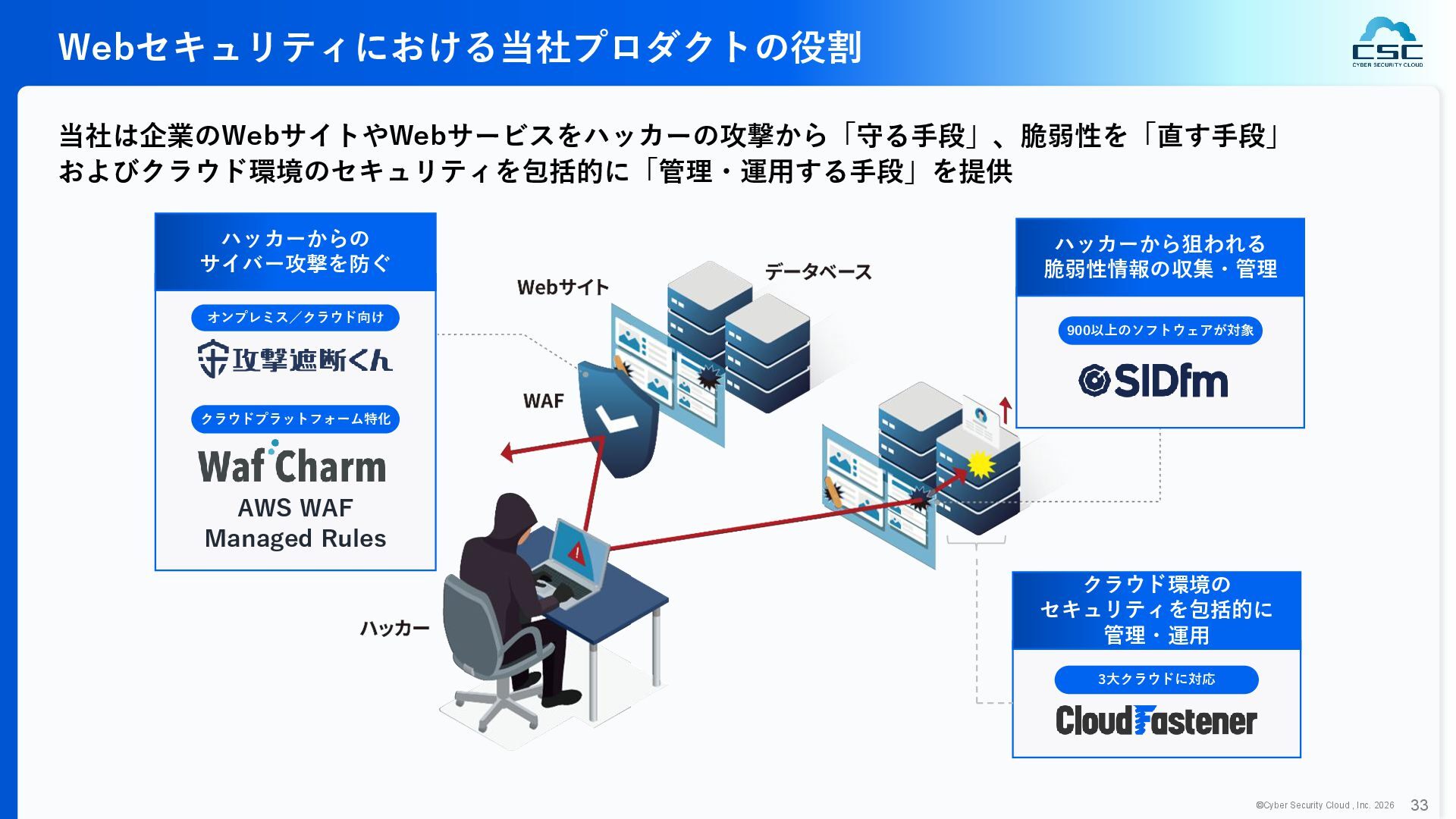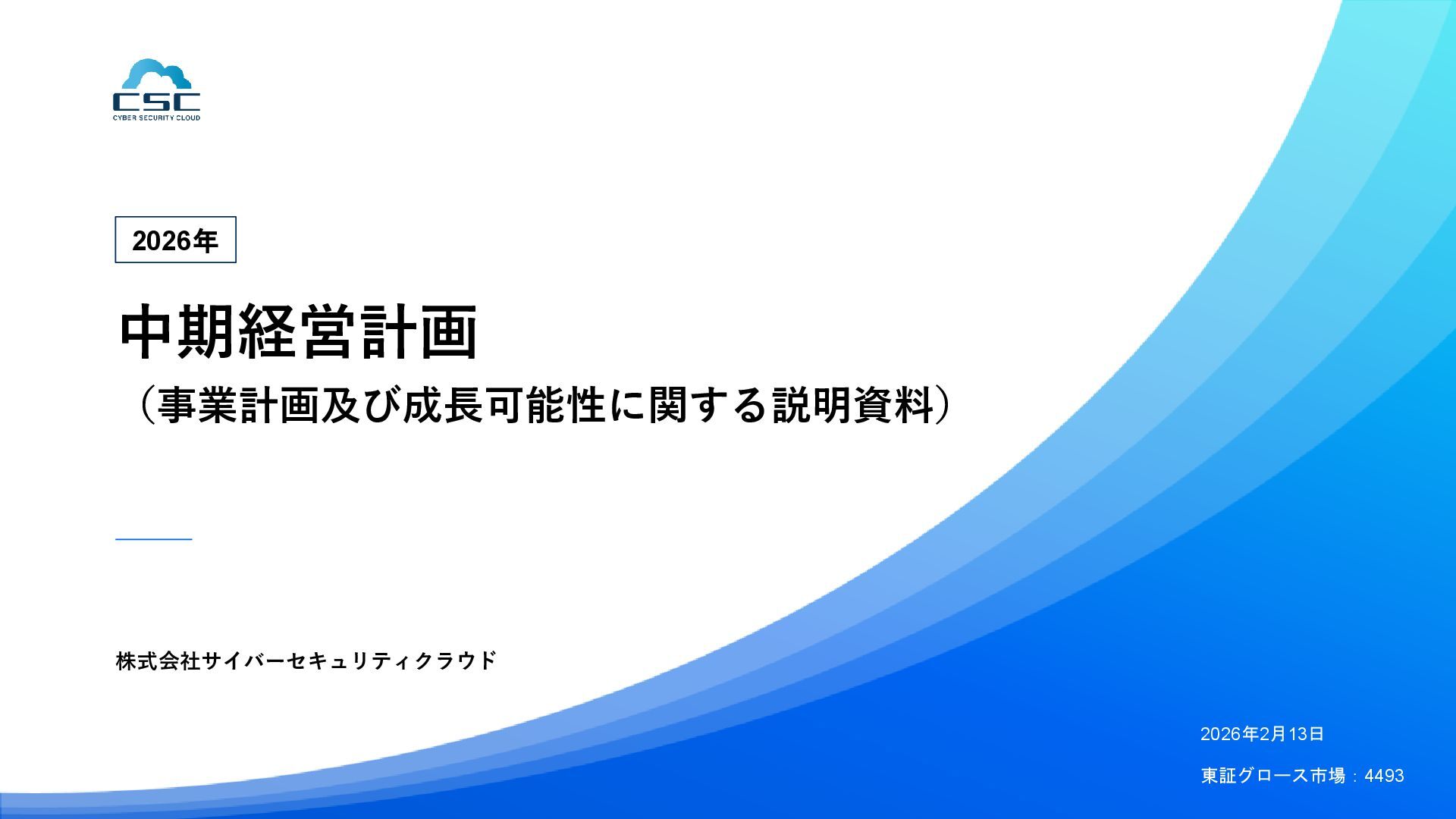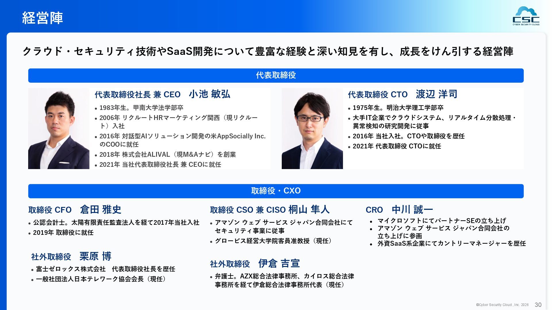 816 1,194 1,817 2,275 3,060 3,857 5,084 6,000 16/12 17/12 18/12 19/12 20/12 21/12 22/12 23/12 24/12 25/12 26/12 新規上場 2020 会社概要 企業理念 世界中の人々が安心安全に使える サイバー空間を創造する。 ソフテック 子会社化 提供開始 2013 提供開始 2017 US子会社設立 2018 提供開始 Managed Rules 提供開始 売上高 (百万円) 2023 2019 ジェネレーティブ テクノロジー設立 2024 シンガポール子会社設立 DataSign 子会社化 2025 社 名 株式会社サイバーセキュリティクラウド 設 立 2010年8月11日 代 表 者 代表取締役社長 兼 CEO 小池 敏弘 代表取締役CTO 渡辺 洋司 所 在 地 東京都品川区上大崎3-1-1 JR東急目黒ビル13階 事業内容 サイバーセキュリティサービスの開発・提供 グループ会社 Cyber Security Cloud Inc. (USA) Cyber Security Cloud Pte. Ltd. (Singapore) 株式会社ジェネレーティブテクノロジー 株式会社DataSign