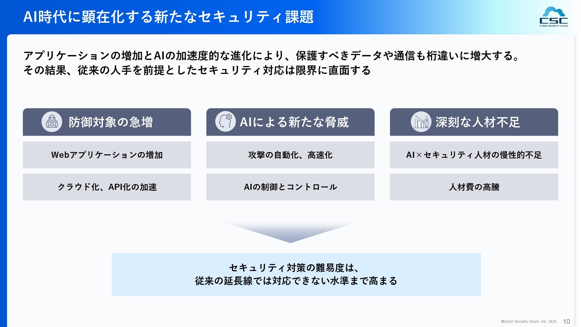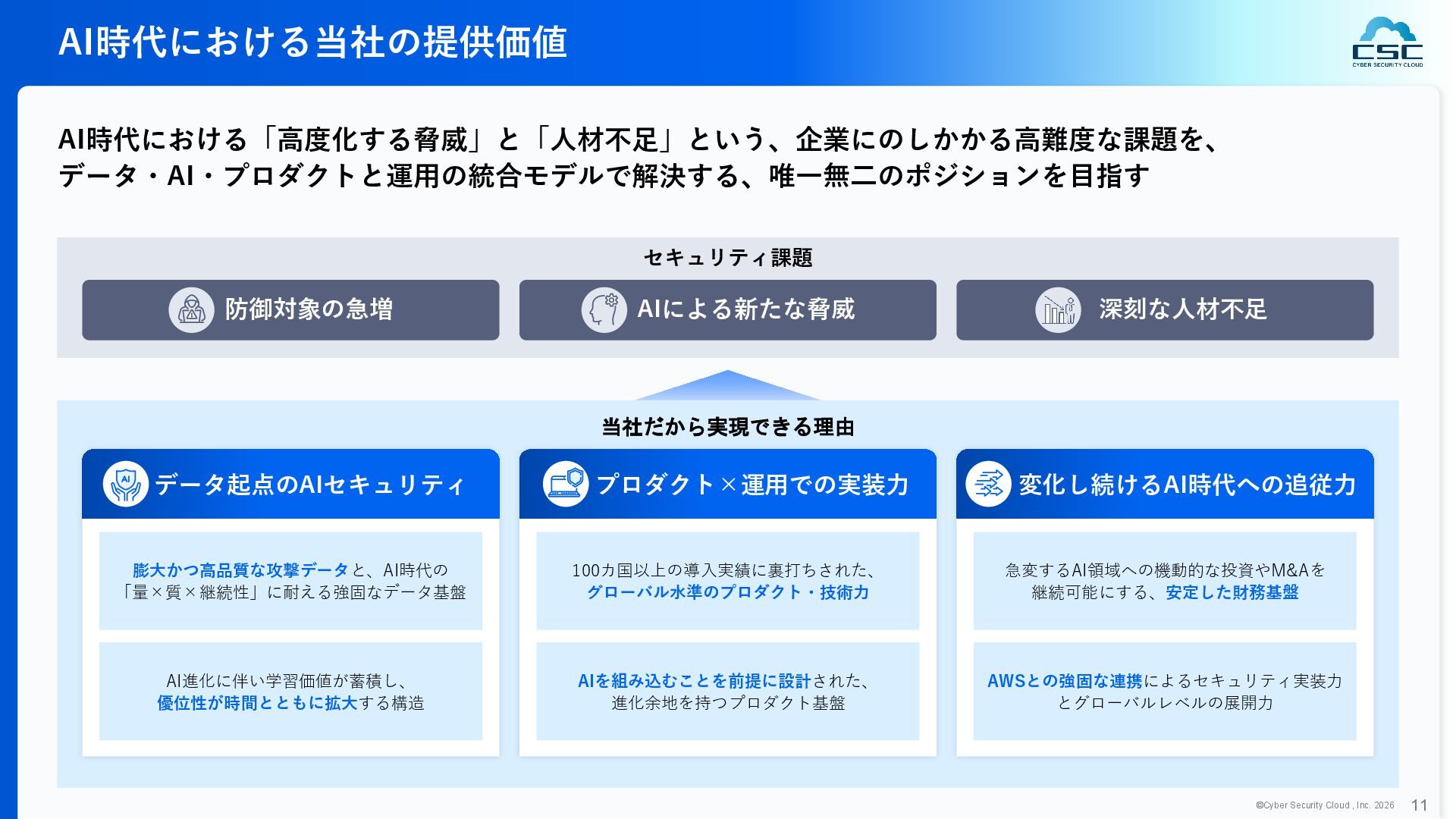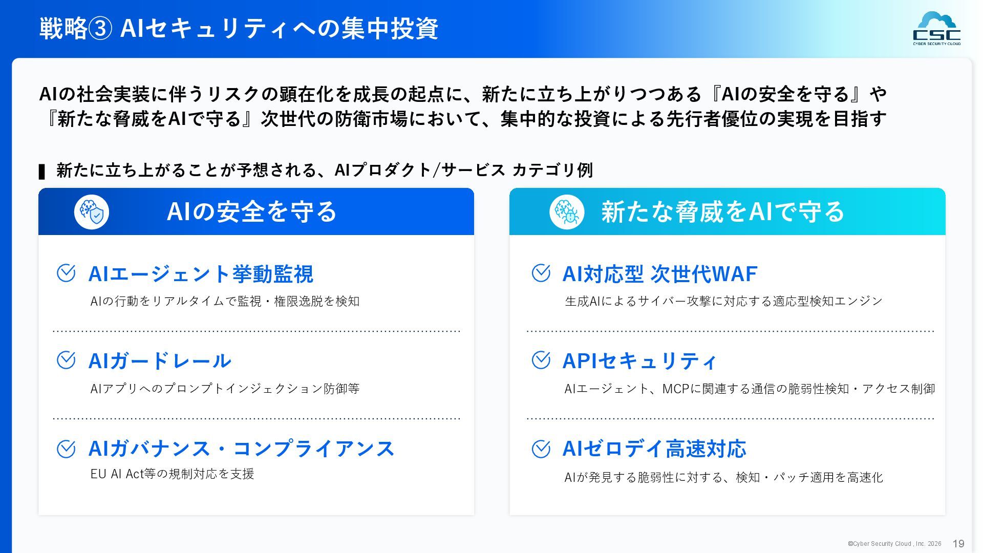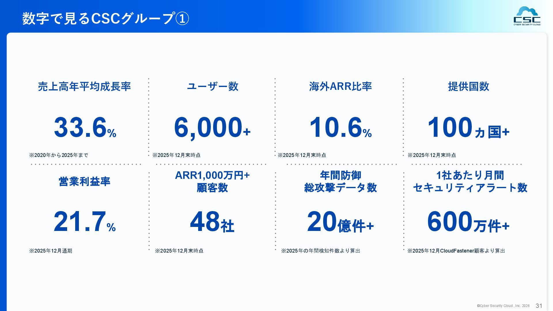 816 1,194 1,817 2,275 3,060 3,857 5,084 6,000 16/12 17/12 18/12 19/12 20/12 21/12 22/12 23/12 24/12 25/12 26/12 新規上場 2020 会社概要 企業理念 世界中の人々が安心安全に使える サイバー空間を創造する。 ソフテック 子会社化 提供開始 2013 提供開始 2017 US子会社設立 2018 提供開始 Managed Rules 提供開始 売上高 (百万円) 2023 2019 ジェネレーティブ テクノロジー設立 2024 シンガポール子会社設立 DataSign 子会社化 2025 社 名 株式会社サイバーセキュリティクラウド 設 立 2010年8月11日 代 表 者 代表取締役社長 兼 CEO 小池 敏弘 代表取締役CTO 渡辺 洋司 所 在 地 東京都品川区上大崎3-1-1 JR東急目黒ビル13階 事業内容 サイバーセキュリティサービスの開発・提供 グループ会社 Cyber Security Cloud Inc. (USA) Cyber Security Cloud Pte. Ltd. (Singapore) 株式会社ジェネレーティブテクノロジー 株式会社DataSign