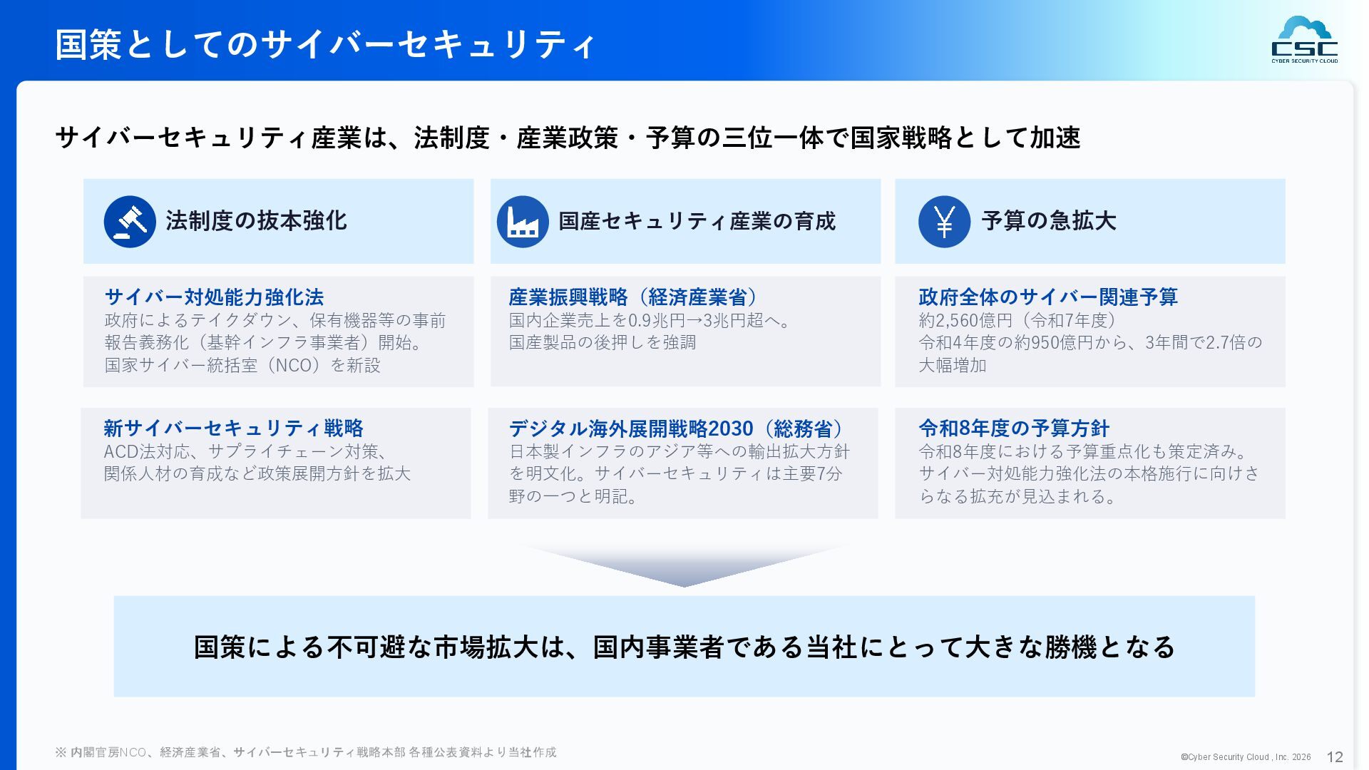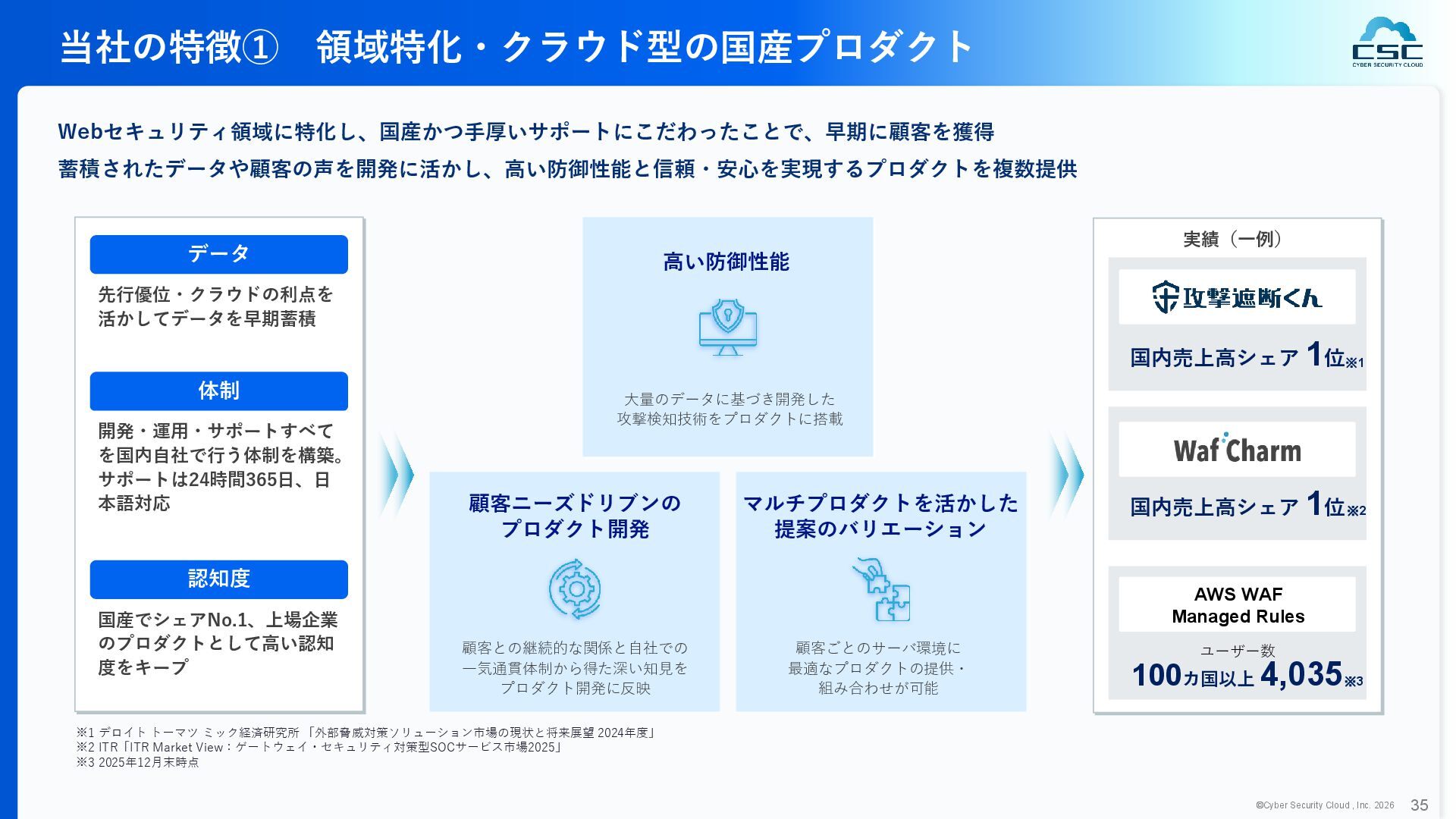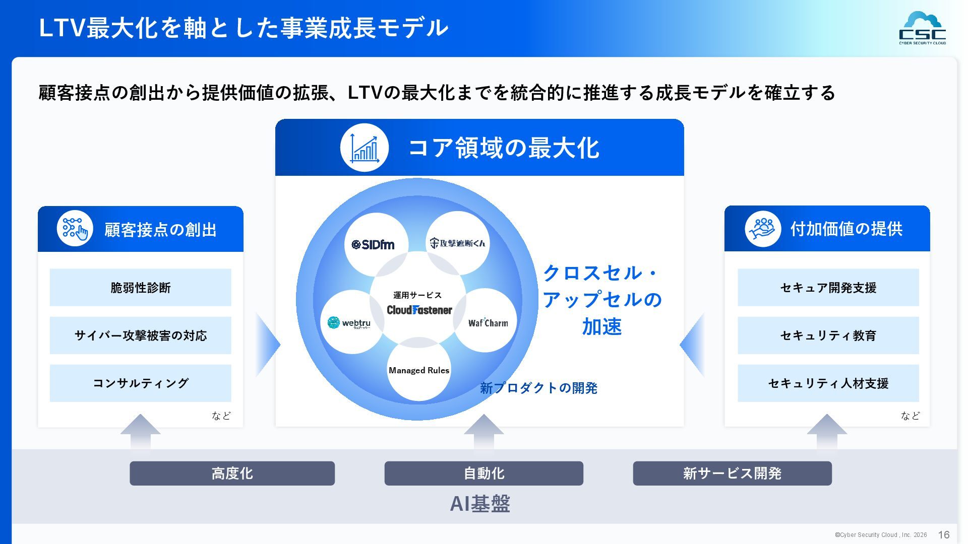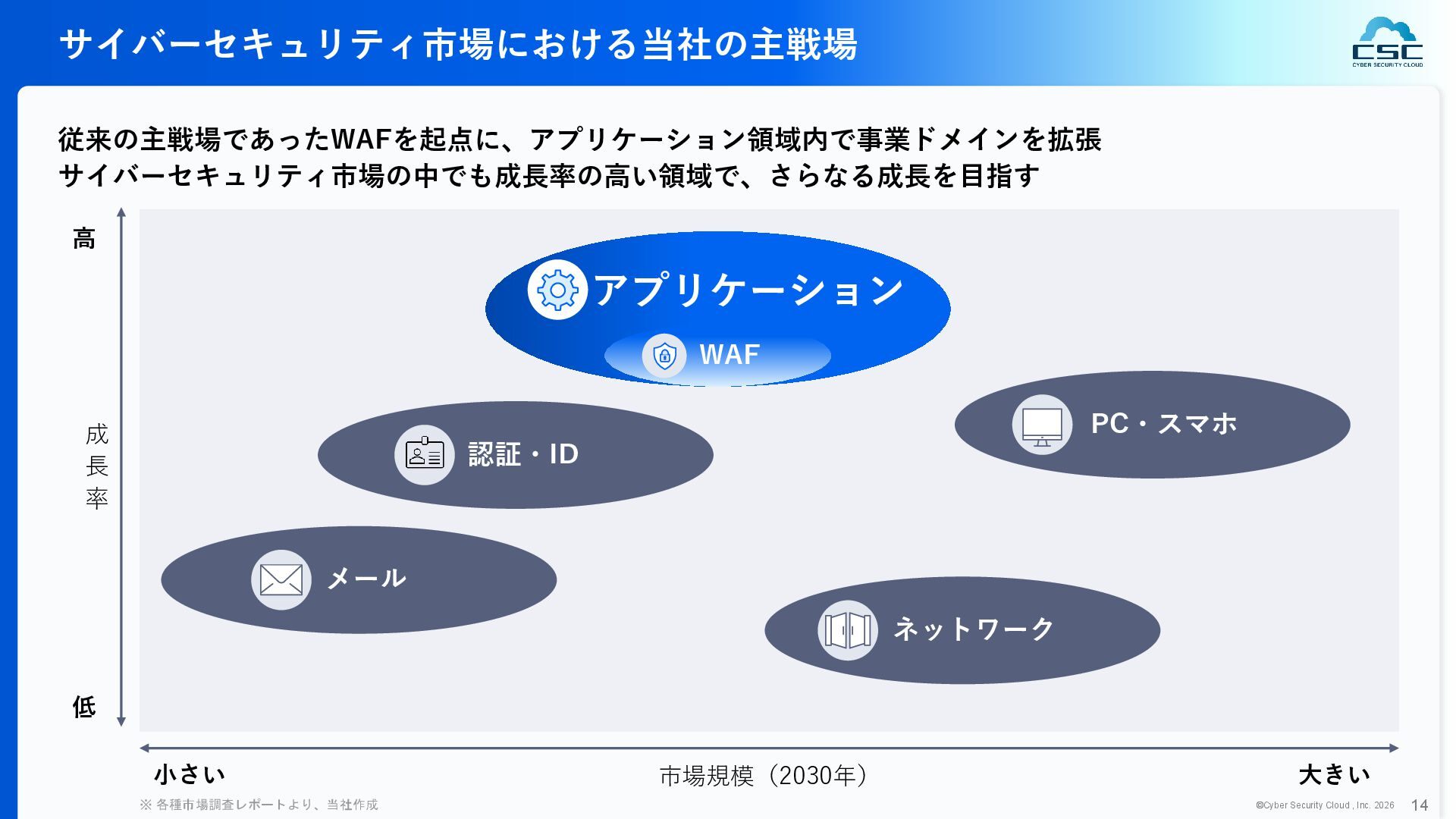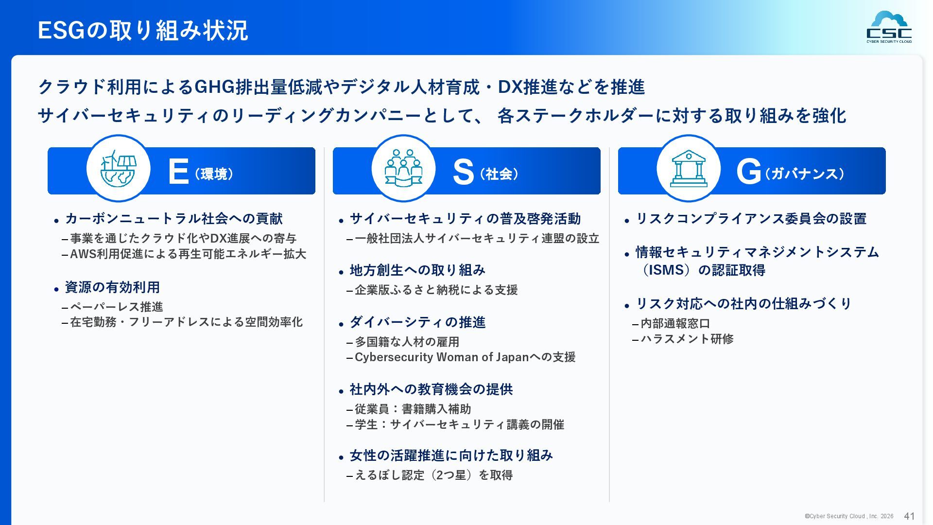 816 1,194 1,817 2,275 3,060 3,857 5,084 6,000 16/12 17/12 18/12 19/12 20/12 21/12 22/12 23/12 24/12 25/12 26/12 新規上場 2020 会社概要 企業理念 世界中の人々が安心安全に使える サイバー空間を創造する。 ソフテック 子会社化 提供開始 2013 提供開始 2017 US子会社設立 2018 提供開始 Managed Rules 提供開始 売上高 (百万円) 2023 2019 ジェネレーティブ テクノロジー設立 2024 シンガポール子会社設立 DataSign 子会社化 2025 社 名 株式会社サイバーセキュリティクラウド 設 立 2010年8月11日 代 表 者 代表取締役社長 兼 CEO 小池 敏弘 代表取締役CTO 渡辺 洋司 所 在 地 東京都品川区上大崎3-1-1 JR東急目黒ビル13階 事業内容 サイバーセキュリティサービスの開発・提供 グループ会社 Cyber Security Cloud Inc. (USA) Cyber Security Cloud Pte. Ltd. (Singapore) 株式会社ジェネレーティブテクノロジー 株式会社DataSign