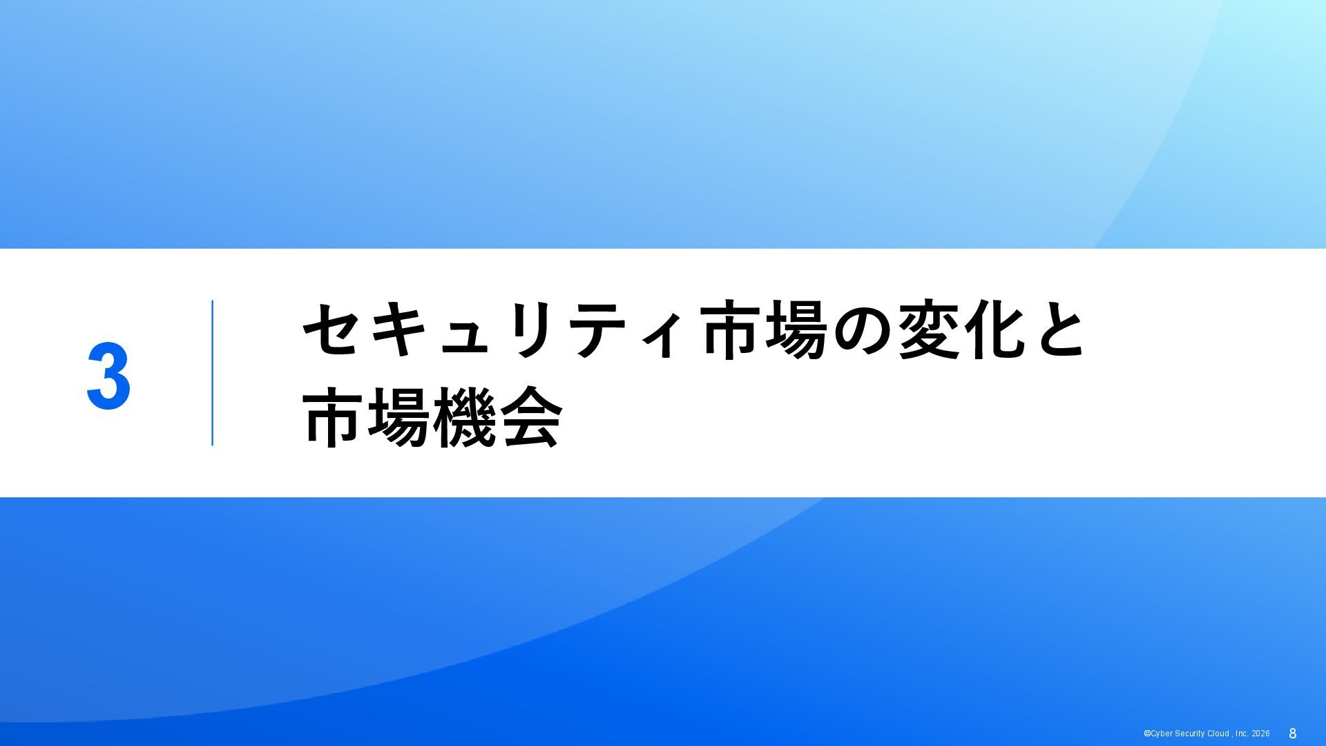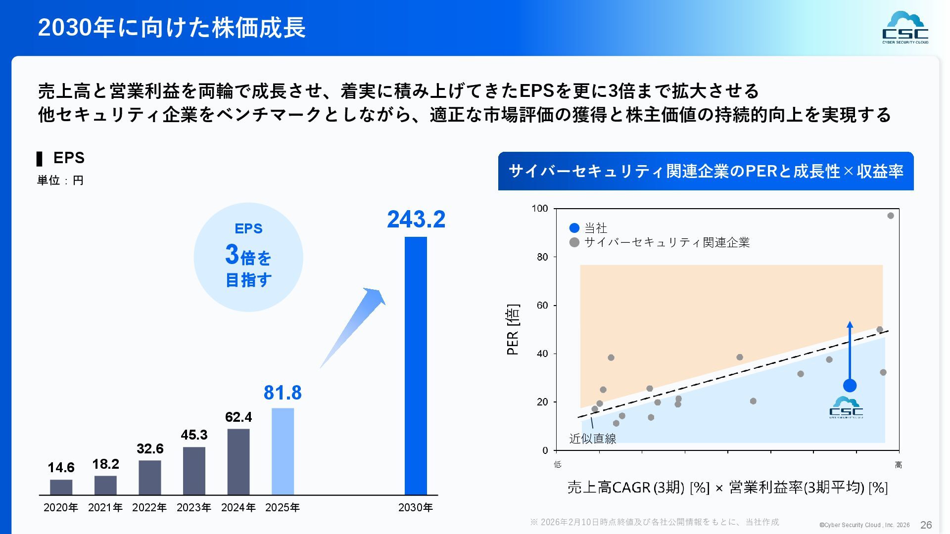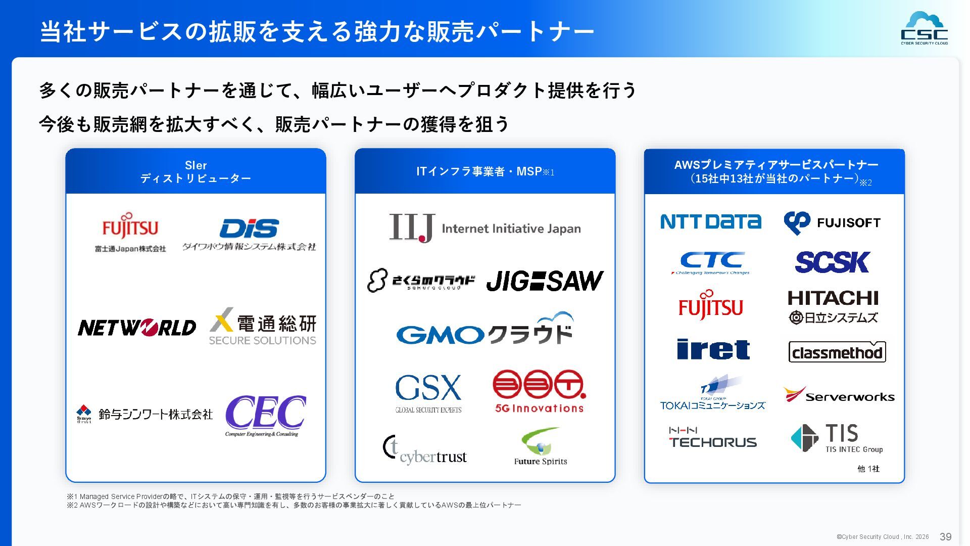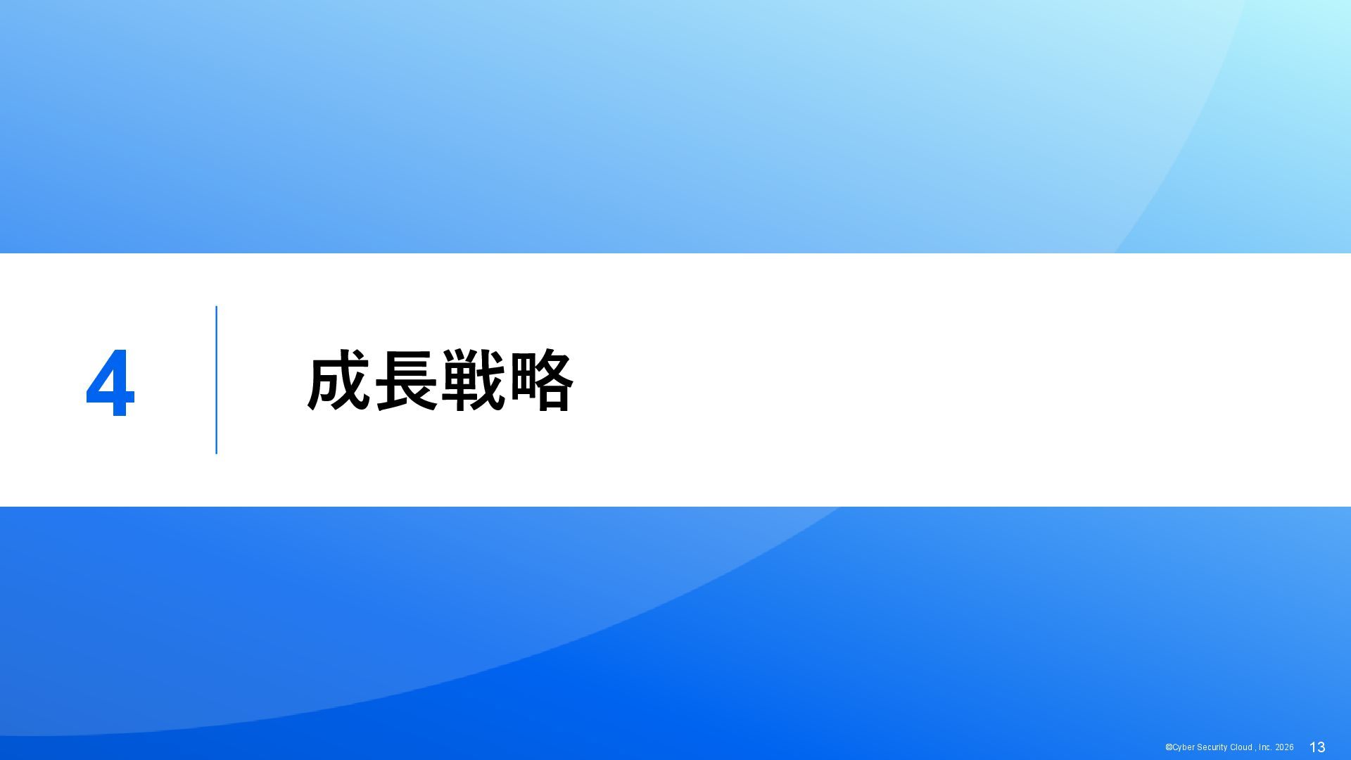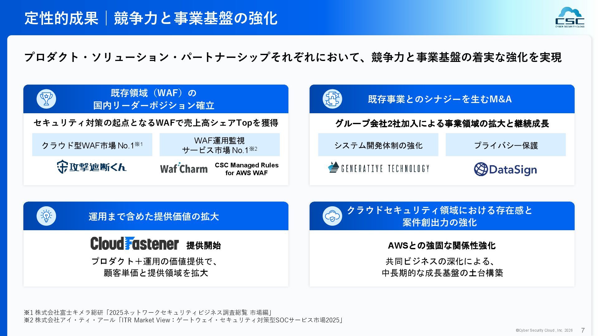 816 1,194 1,817 2,275 3,060 3,857 5,084 6,000 16/12 17/12 18/12 19/12 20/12 21/12 22/12 23/12 24/12 25/12 26/12 新規上場 2020 会社概要 企業理念 世界中の人々が安心安全に使える サイバー空間を創造する。 ソフテック 子会社化 提供開始 2013 提供開始 2017 US子会社設立 2018 提供開始 Managed Rules 提供開始 売上高 (百万円) 2023 2019 ジェネレーティブ テクノロジー設立 2024 シンガポール子会社設立 DataSign 子会社化 2025 社 名 株式会社サイバーセキュリティクラウド 設 立 2010年8月11日 代 表 者 代表取締役社長 兼 CEO 小池 敏弘 代表取締役CTO 渡辺 洋司 所 在 地 東京都品川区上大崎3-1-1 JR東急目黒ビル13階 事業内容 サイバーセキュリティサービスの開発・提供 グループ会社 Cyber Security Cloud Inc. (USA) Cyber Security Cloud Pte. Ltd. (Singapore) 株式会社ジェネレーティブテクノロジー 株式会社DataSign