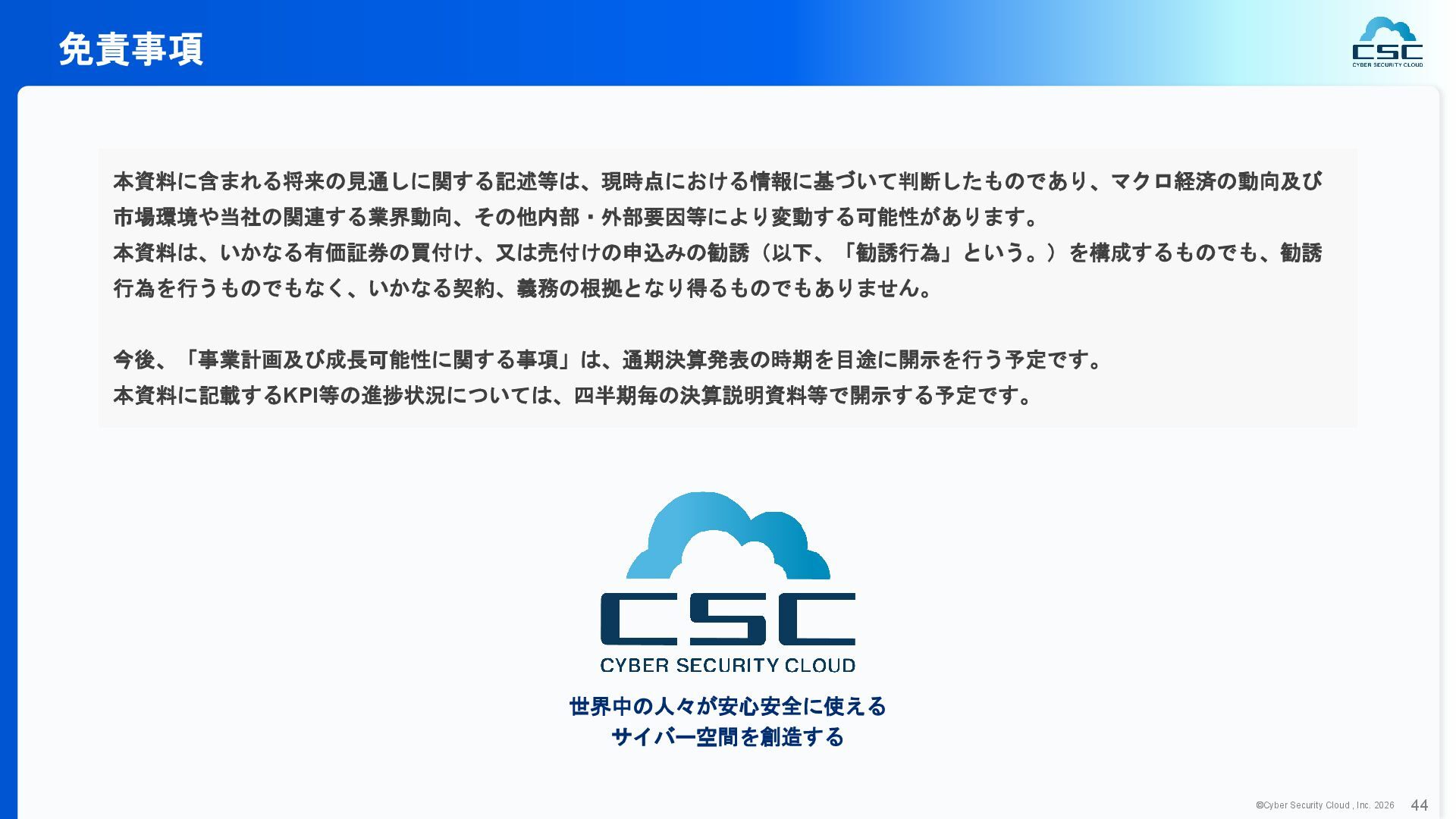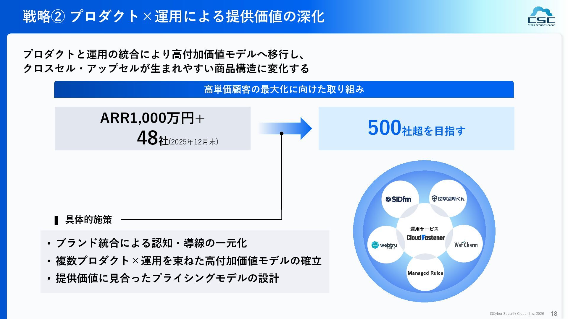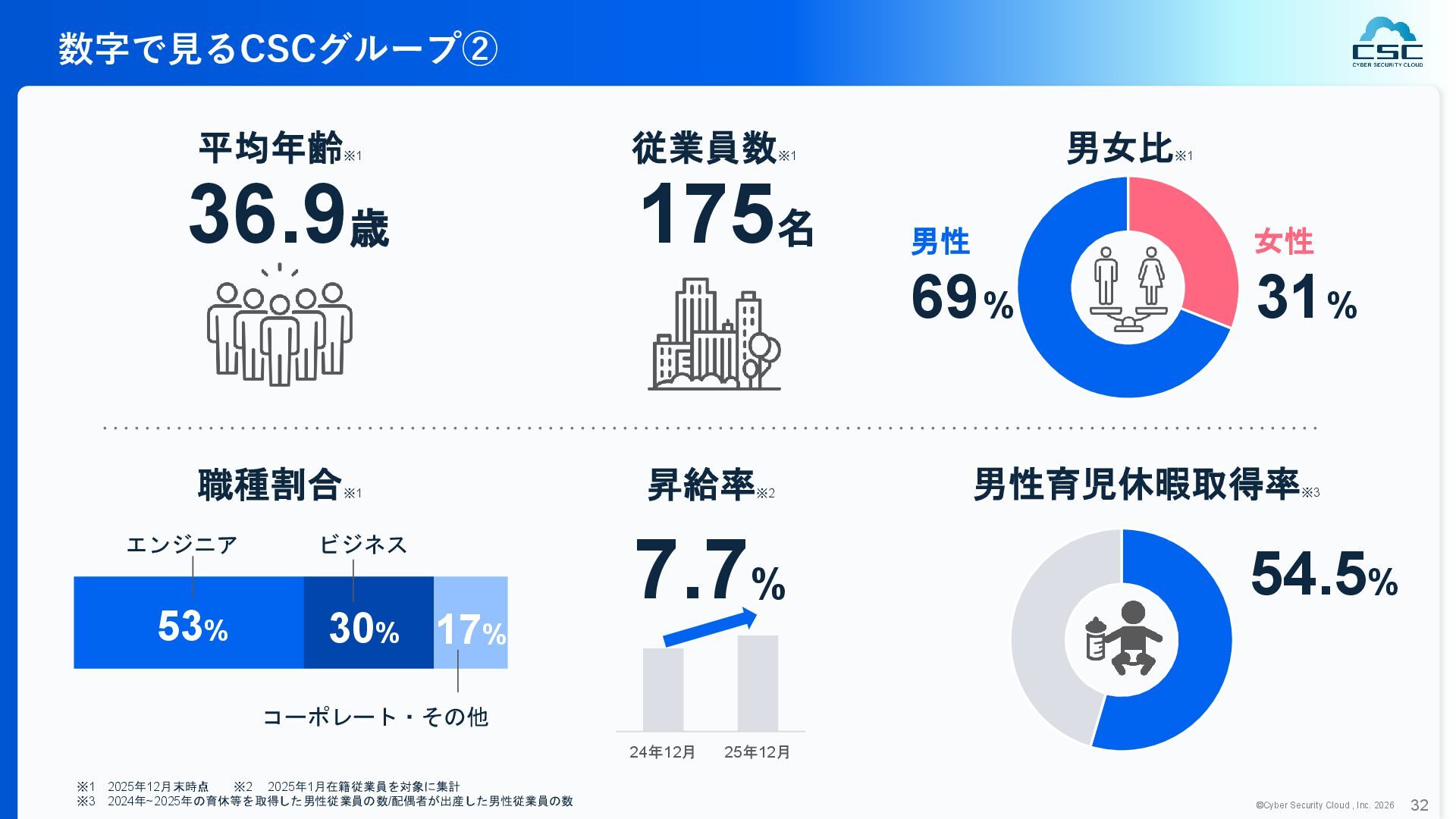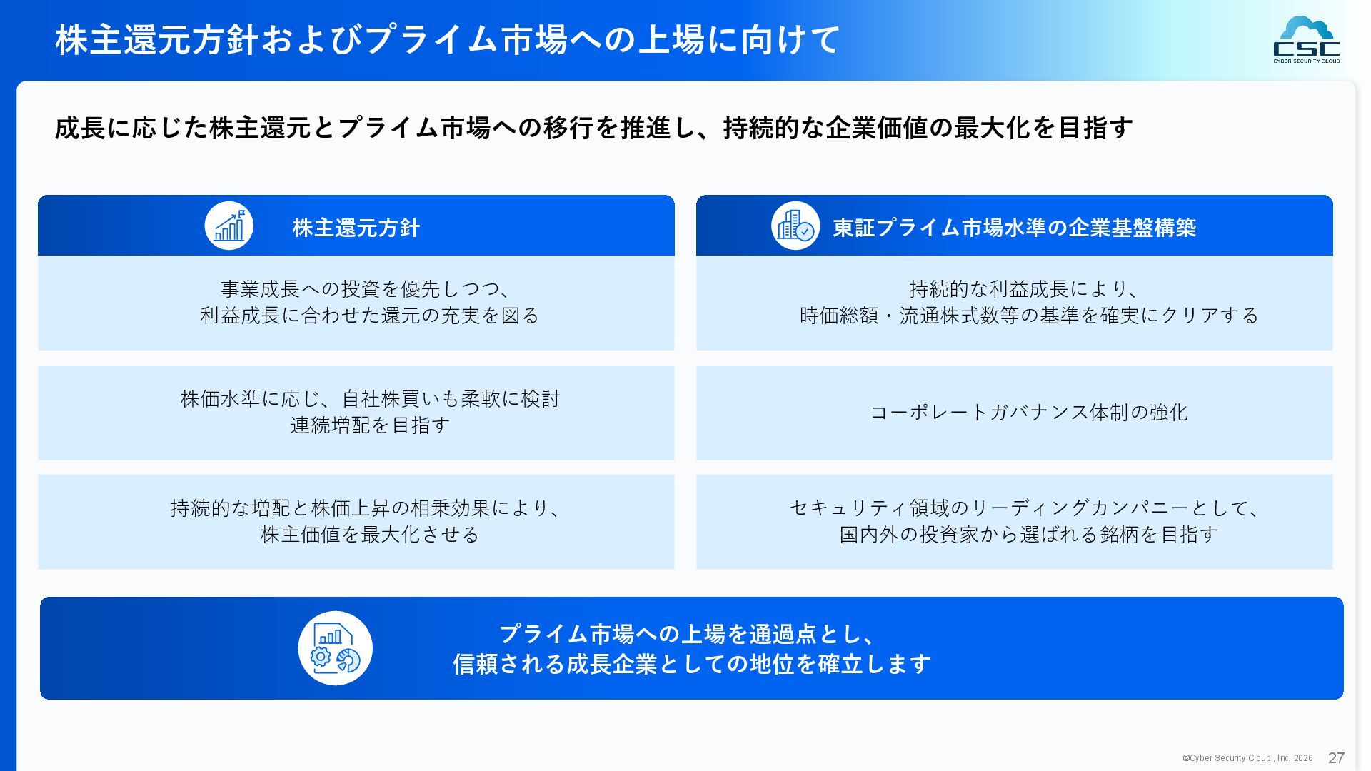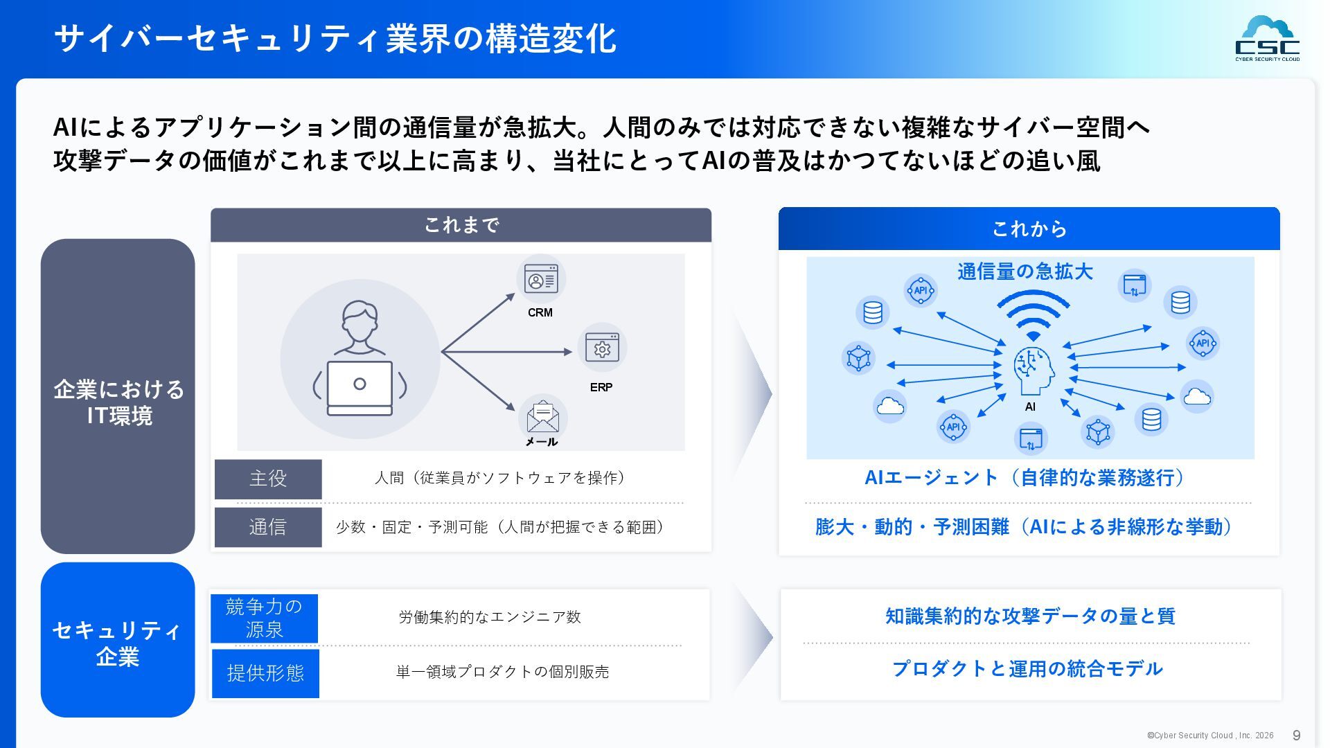 816 1,194 1,817 2,275 3,060 3,857 5,084 6,000 16/12 17/12 18/12 19/12 20/12 21/12 22/12 23/12 24/12 25/12 26/12 新規上場 2020 会社概要 企業理念 世界中の人々が安心安全に使える サイバー空間を創造する。 ソフテック 子会社化 提供開始 2013 提供開始 2017 US子会社設立 2018 提供開始 Managed Rules 提供開始 売上高 (百万円) 2023 2019 ジェネレーティブ テクノロジー設立 2024 シンガポール子会社設立 DataSign 子会社化 2025 社 名 株式会社サイバーセキュリティクラウド 設 立 2010年8月11日 代 表 者 代表取締役社長 兼 CEO 小池 敏弘 代表取締役CTO 渡辺 洋司 所 在 地 東京都品川区上大崎3-1-1 JR東急目黒ビル13階 事業内容 サイバーセキュリティサービスの開発・提供 グループ会社 Cyber Security Cloud Inc. (USA) Cyber Security Cloud Pte. Ltd. (Singapore) 株式会社ジェネレーティブテクノロジー 株式会社DataSign