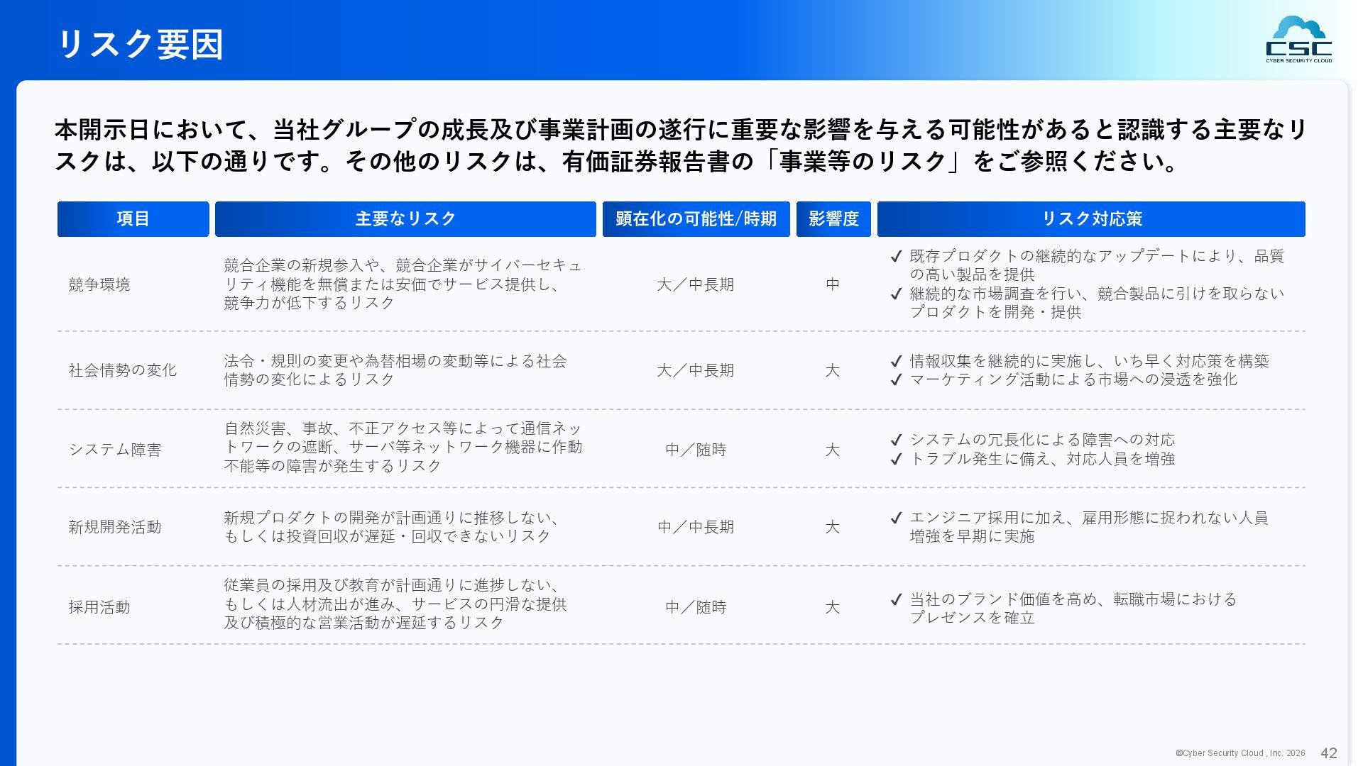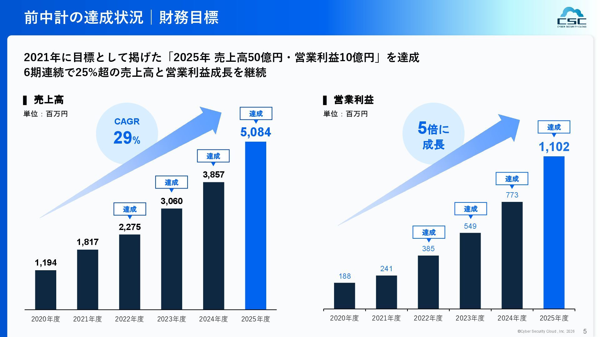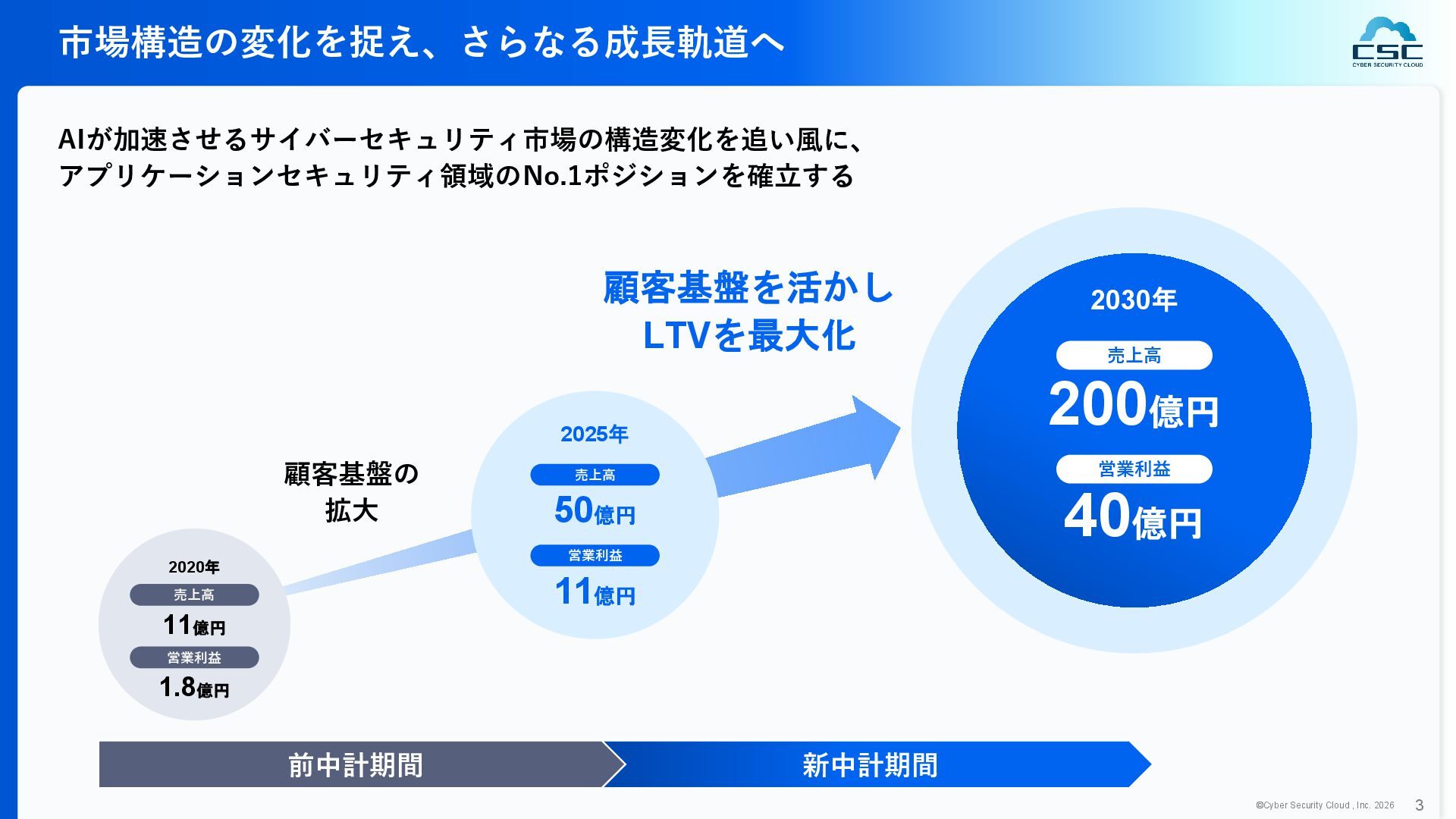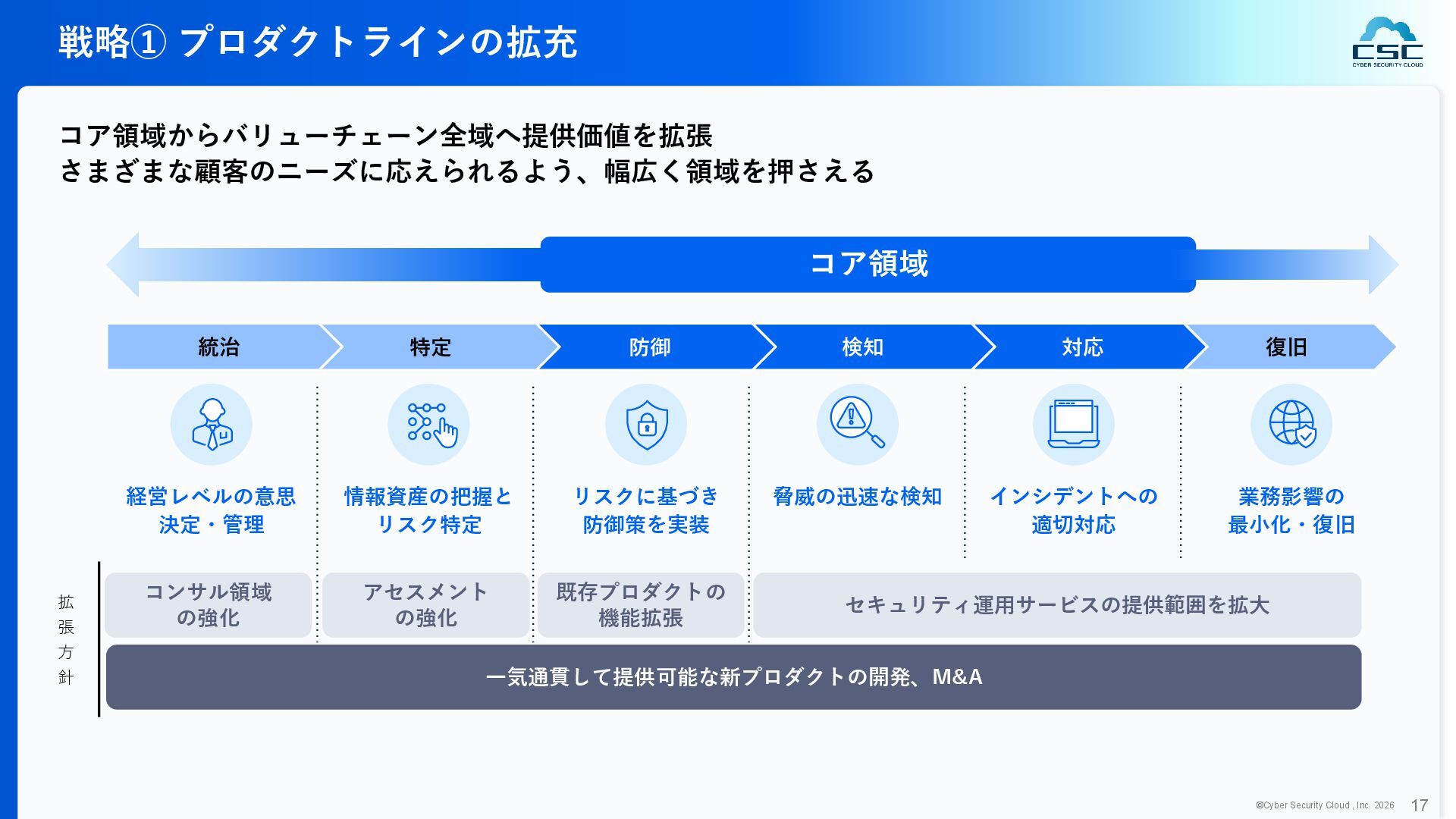 816 1,194 1,817 2,275 3,060 3,857 5,084 6,000 16/12 17/12 18/12 19/12 20/12 21/12 22/12 23/12 24/12 25/12 26/12 新規上場 2020 会社概要 企業理念 世界中の人々が安心安全に使える サイバー空間を創造する。 ソフテック 子会社化 提供開始 2013 提供開始 2017 US子会社設立 2018 提供開始 Managed Rules 提供開始 売上高 (百万円) 2023 2019 ジェネレーティブ テクノロジー設立 2024 シンガポール子会社設立 DataSign 子会社化 2025 社 名 株式会社サイバーセキュリティクラウド 設 立 2010年8月11日 代 表 者 代表取締役社長 兼 CEO 小池 敏弘 代表取締役CTO 渡辺 洋司 所 在 地 東京都品川区上大崎3-1-1 JR東急目黒ビル13階 事業内容 サイバーセキュリティサービスの開発・提供 グループ会社 Cyber Security Cloud Inc. (USA) Cyber Security Cloud Pte. Ltd. (Singapore) 株式会社ジェネレーティブテクノロジー 株式会社DataSign