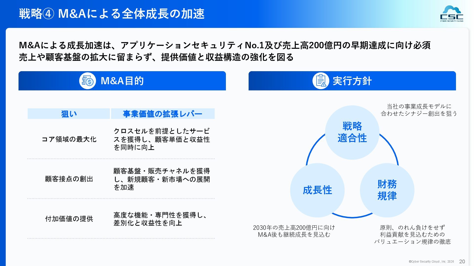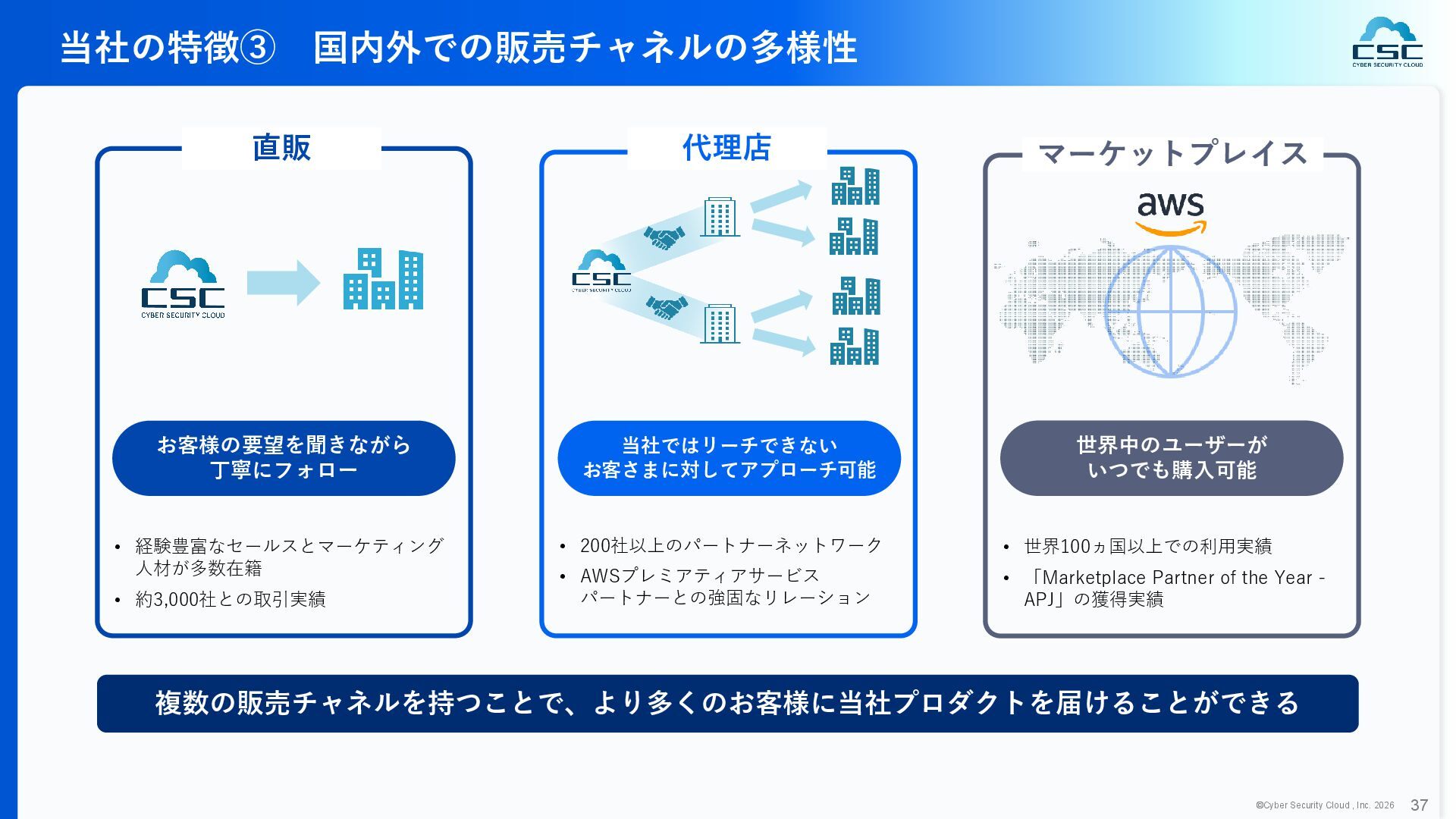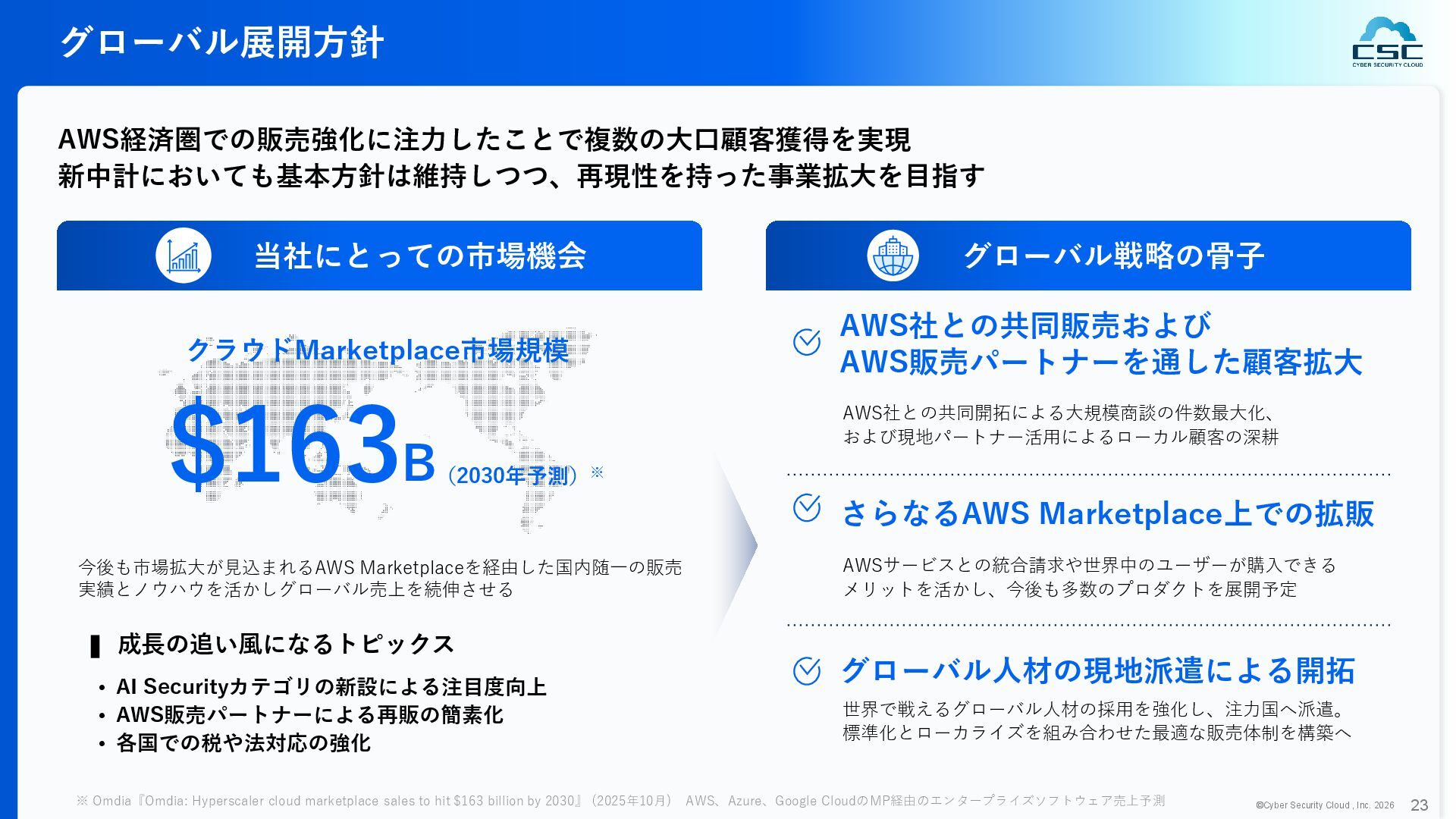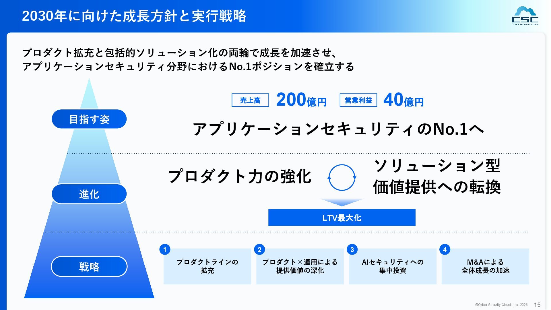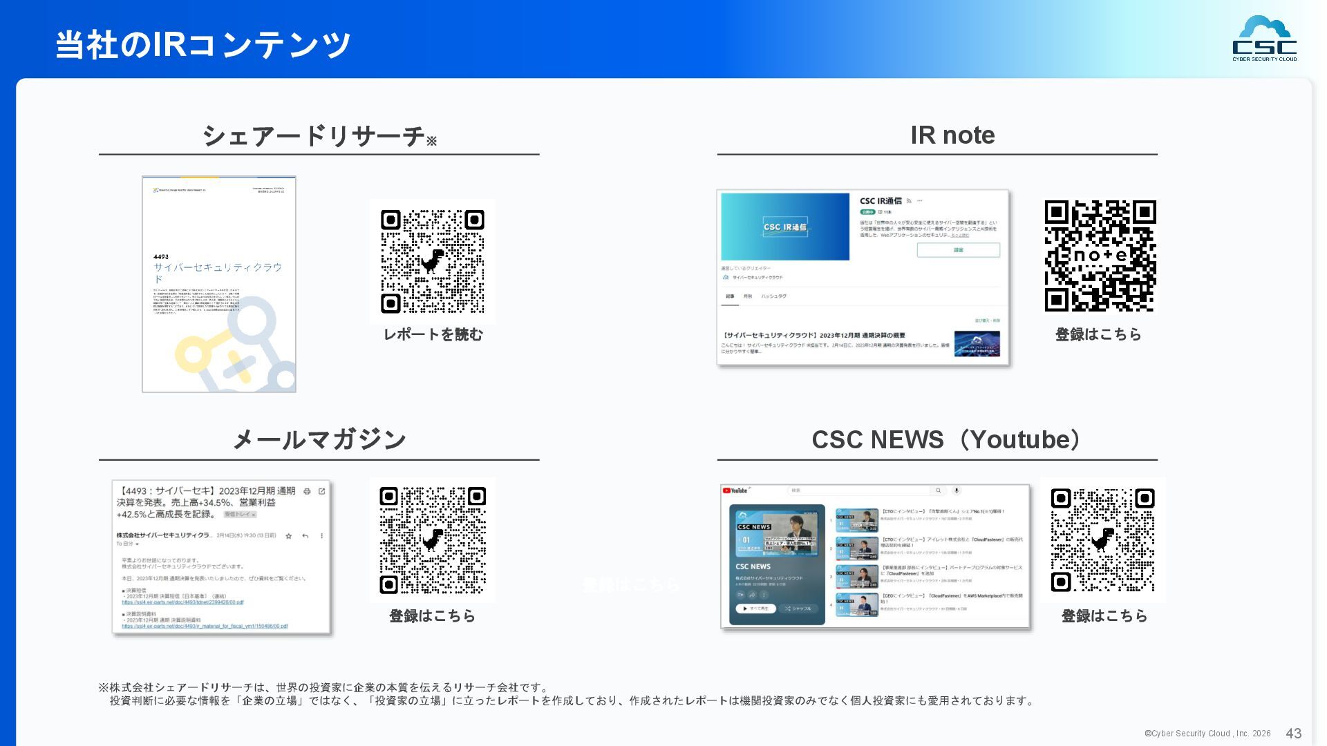 816 1,194 1,817 2,275 3,060 3,857 5,084 6,000 16/12 17/12 18/12 19/12 20/12 21/12 22/12 23/12 24/12 25/12 26/12 新規上場 2020 会社概要 企業理念 世界中の人々が安心安全に使える サイバー空間を創造する。 ソフテック 子会社化 提供開始 2013 提供開始 2017 US子会社設立 2018 提供開始 Managed Rules 提供開始 売上高 (百万円) 2023 2019 ジェネレーティブ テクノロジー設立 2024 シンガポール子会社設立 DataSign 子会社化 2025 社 名 株式会社サイバーセキュリティクラウド 設 立 2010年8月11日 代 表 者 代表取締役社長 兼 CEO 小池 敏弘 代表取締役CTO 渡辺 洋司 所 在 地 東京都品川区上大崎3-1-1 JR東急目黒ビル13階 事業内容 サイバーセキュリティサービスの開発・提供 グループ会社 Cyber Security Cloud Inc. (USA) Cyber Security Cloud Pte. Ltd. (Singapore) 株式会社ジェネレーティブテクノロジー 株式会社DataSign