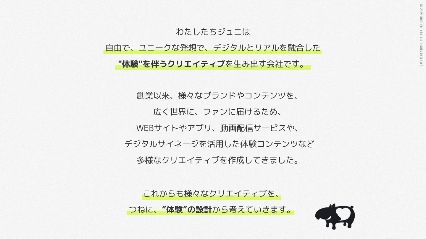 わたしたちジュニは 自由で、 ユニークな 発想で、 デジタルとリアルを融合した "体験"を 伴う クリエイティブを生み出す会社です。 これからも様々なクリエイティブを、 つねに、”体験”の